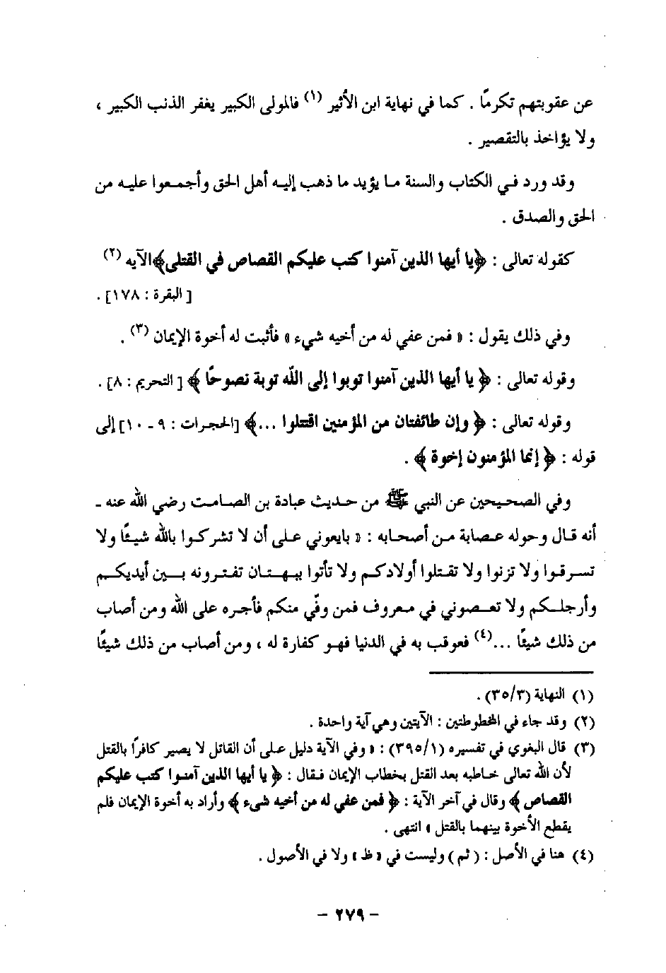 (¬3) قال البغوي في تفسيره (1/ 395): "وفي الآية دليل على أن القاتل لا يصير كافرًا بالقتل لأن اللَّه تعالى خاطبه بعد القتل بخطاب الإيمان فقال: {يَاأَيُّهَا الَّذِينَ آمَنُوا كُتِبَ عَلَيْكُمُ الْقِصَاصُ} وقال في آخر الآية: {فَمَنْ عُفِيَ لَهُ مِنْ أَخِيهِ شَيْءٌ} وأراد به أخوة الإيمان فلم يقطع الأخوة بينهما بالقتل انتهى.