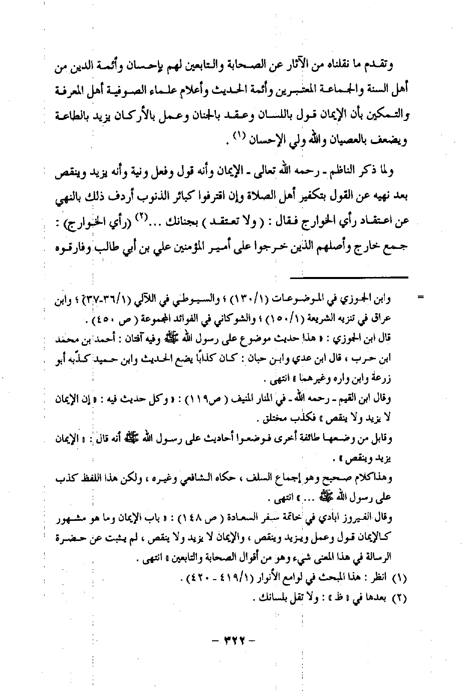 وقال الفيروزآبادي في خاتمة سفر السعادة (ص 148): "باب الإيمان وما هو مشهور كالإيمان قول وعمل ويزيد وينقص، والإيمان لا يزيد ولا ينقص، لم يثبت عن حضرة الرسالة في هذا المعنى شيء وهو من أقوال الصحابة والتابعين" انتهى.