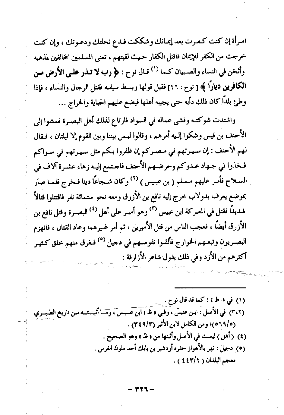واشتدت شوكته وفشى عماله في السواد فارتاع لذلك أهل البصرة فمشوا إلى الأحنف بن قيس وشكوا إليه أمرهم، وقالوا ليس بيننا وبين القوم إلا ليلتان، فقال لهم الأحنف: إن سيرتهم في مصركم إن ظفروا بكم مثل سيرتهم في سواكم فخذوا في جهاد عدوكم وحرضهم الأحنف فاجتمع إليه زهاء عشرة آلاف في السلاح فأمر عليهم مسلم (بن عبيس) (¬2) وكان شجاعًا دينا فخرج فلما صار بموضع يعرف بدولاب خرج إليه نافع بن الأزرق ومعه نحو ستمائة نفر فاقتتلوا قتالًا شديدًا فقتل في المعركة ابن عبيس (¬3) وهو أمير على أهل (¬4) البصرة وقتل نافع بن الأزرق أيضًا، فعجب الناس من قتل الأميرين، ثم أمر غيرهما وعاد القتال، فانهزم البصريون وتبعهم الخوارج فألقوا نفوسهم في دجيل (¬5) فغرق منهم خلق كثير أكثرهم من الأزد وفي ذلك يقول شاعر الأزارقة: