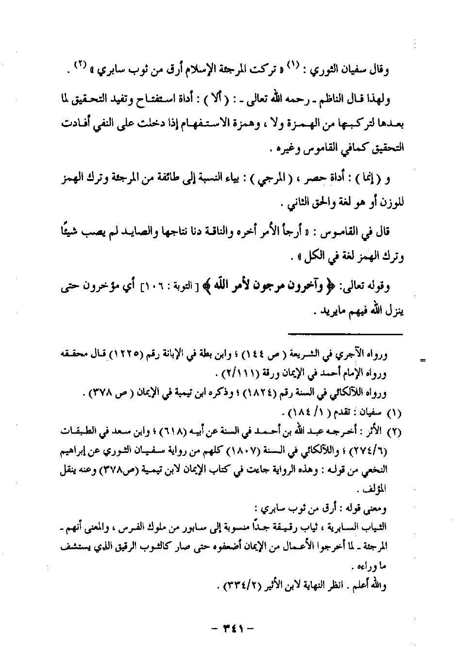 (¬2) الأثر: أخرجه عبد اللَّه بن أحمد في السنة عن أبيه (618)؛ وابن سعد في الطبقات (6/ 274)؛ واللآلكائي في السنة (1807) كلهم من رواية سفيان الثوري عن إبراهيم النخعي من قوله: وهذه الرواية جاءت في كتاب الإيمان لابن تيمية (ص 378) وعنه ينقل المؤلف.