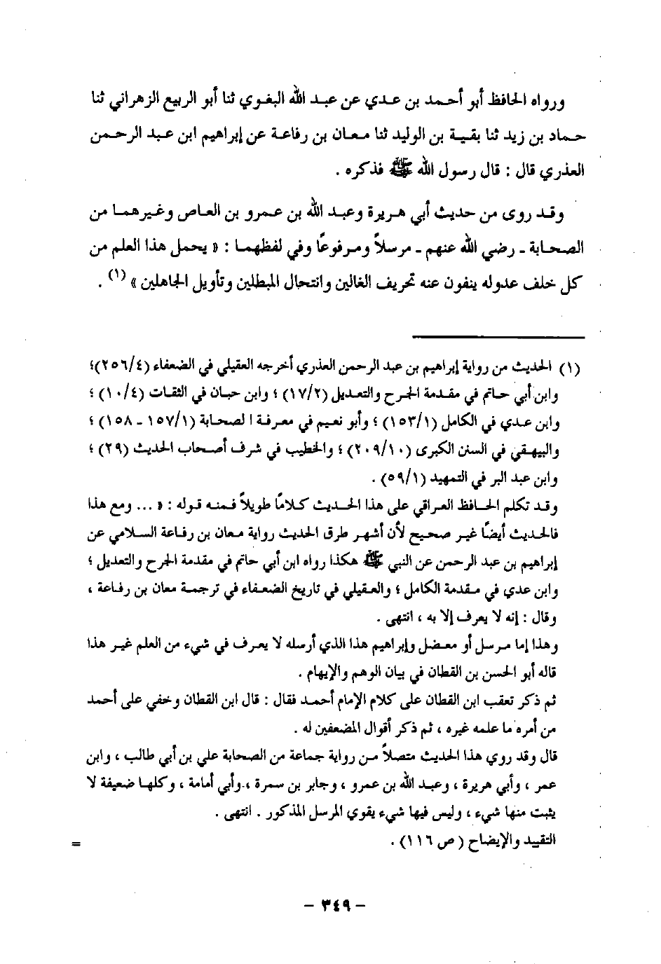 وقد تكلم الحافظ العراقي على هذا الحديث كلامًا طويلًا فمنه قوله: ". . . ومع هذا فالحديث أيضًا غير صحيح لأن أشهر طرق الحديث رواية معان بن رفاعة السلامي عن إبراهيم بن عبد الرحمن عن النبي -صلى اللَّه عليه وسلم- هكذا رواه ابن أبي حاتم في مقدمة الجرح والتعديل؛ وابن عدي في مقدمة الكامل؛ والعقيلي في تاريخ الضعفاء في ترجمة معان بن رفاعة، وقال: إنه لا يعرف إلا به، انتهى.