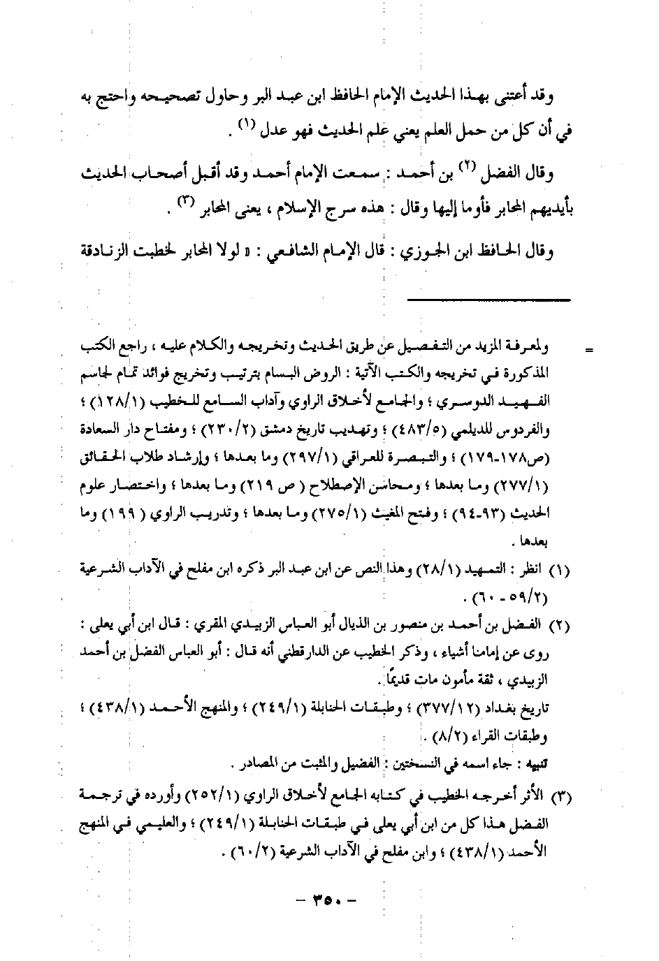 (¬3) الأثر أخرجه الخطيب في كتابه الجامع لأخلاق الراوي (1/ 252) وأورده في ترجمة الفضل هذا كل من ابن أبي يعلى في طبقات الحنابلة (1/ 249)؛ والعليمي في المنهج الأحمد (1/ 438)؛ وابن مفلح في الآداب الشرعية (2/ 60).