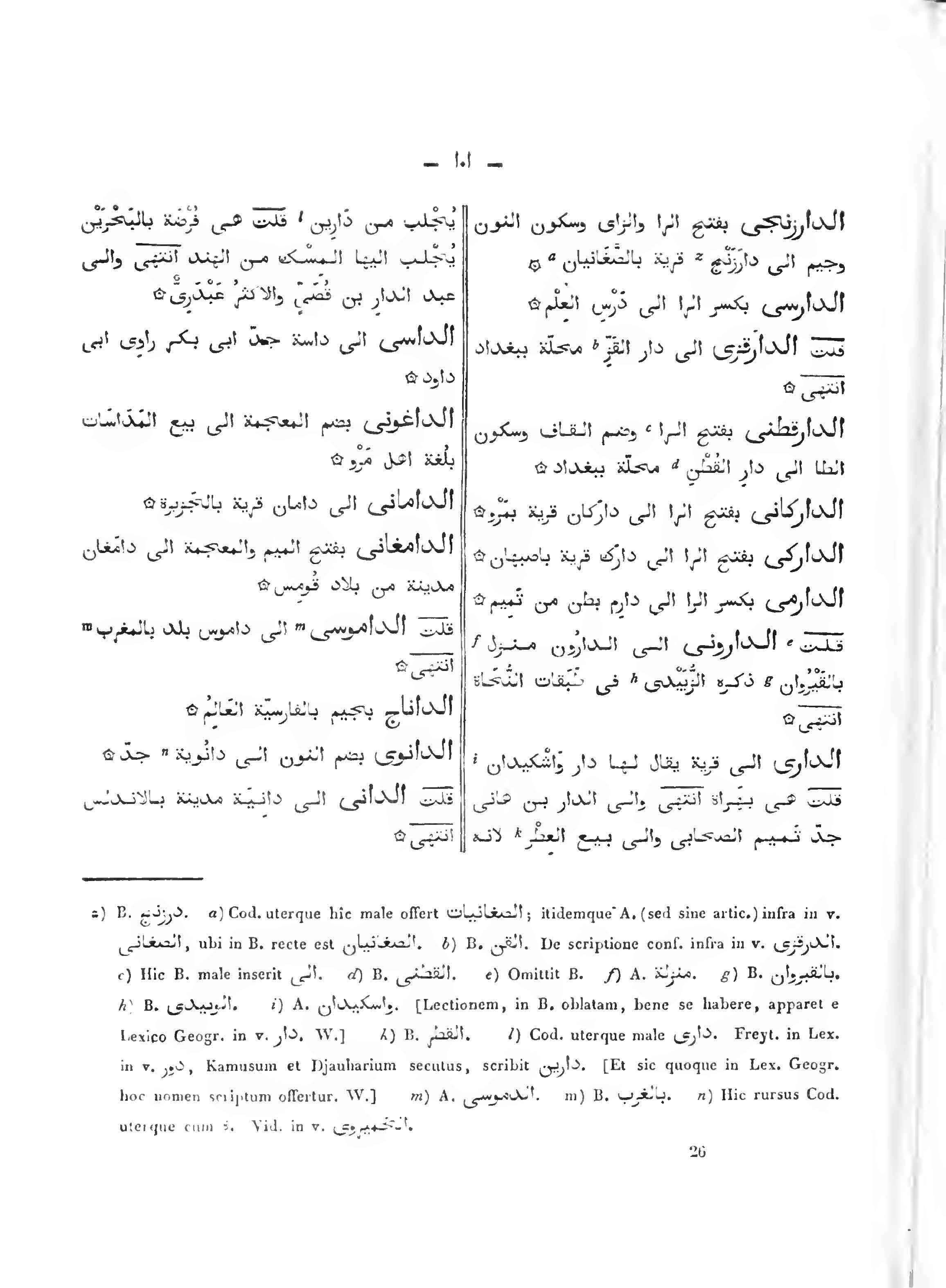 الداري: إلى قرية يقال لها دار واشكيدان قلت: هي بهراة انتهى وإلى الدار بن هاني جد تميم الصحابي وإلى بيع العطر لأنه يجلب من دارين قلت: هي فرضة بالبحرين يجلب إليها المسك من الهند انتهى وإلى عبد الدار بن قصيٍ والأكثر عبدري.