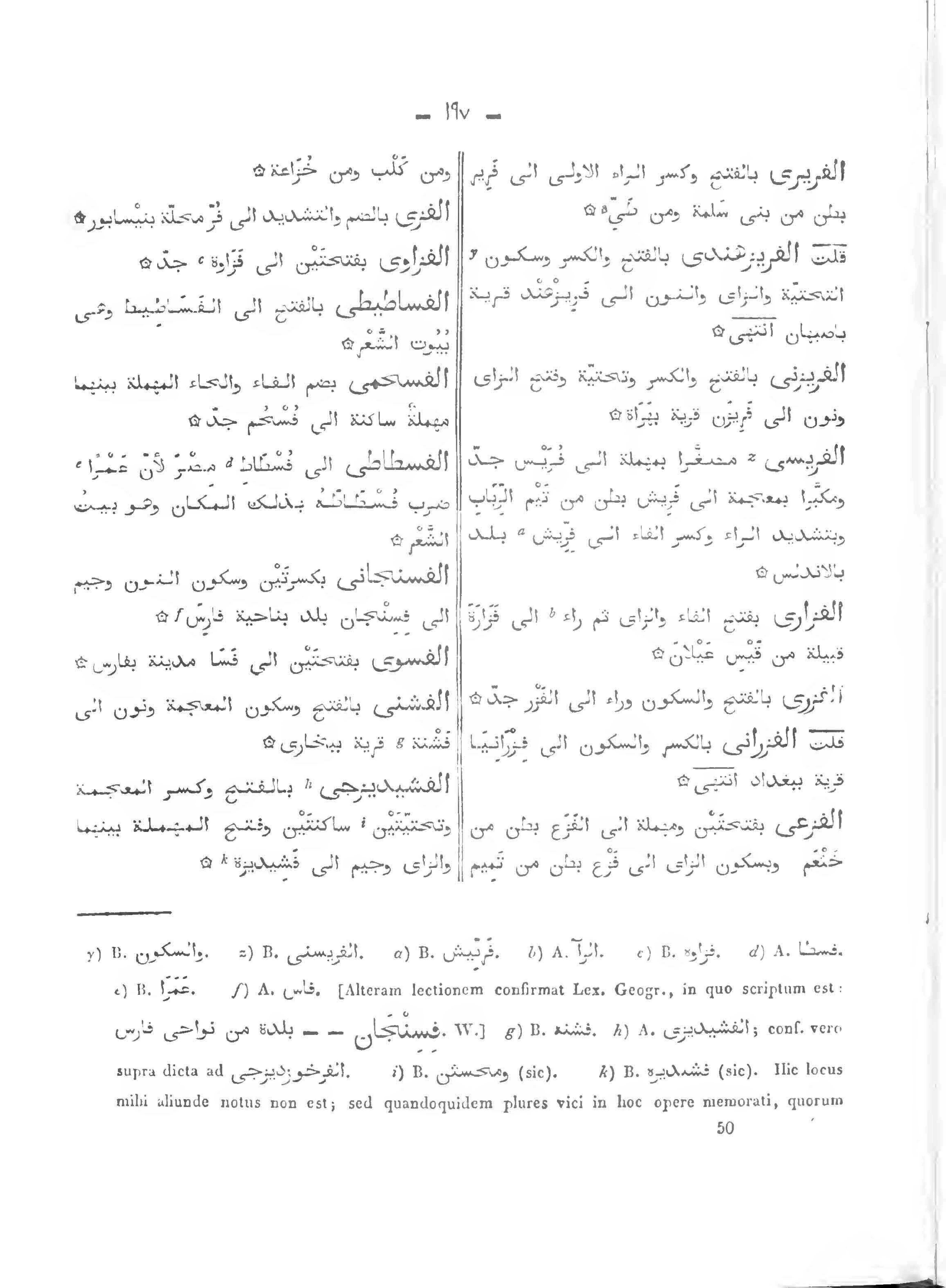 الفريسي: مصغراً بمهملة إلى فريس جدّ ومكبراً بمعجمة إلى فريش بطن من تيم الرباب وبتشديد الراء وكسر الفاء إلى فريش بلد بالأندلس.