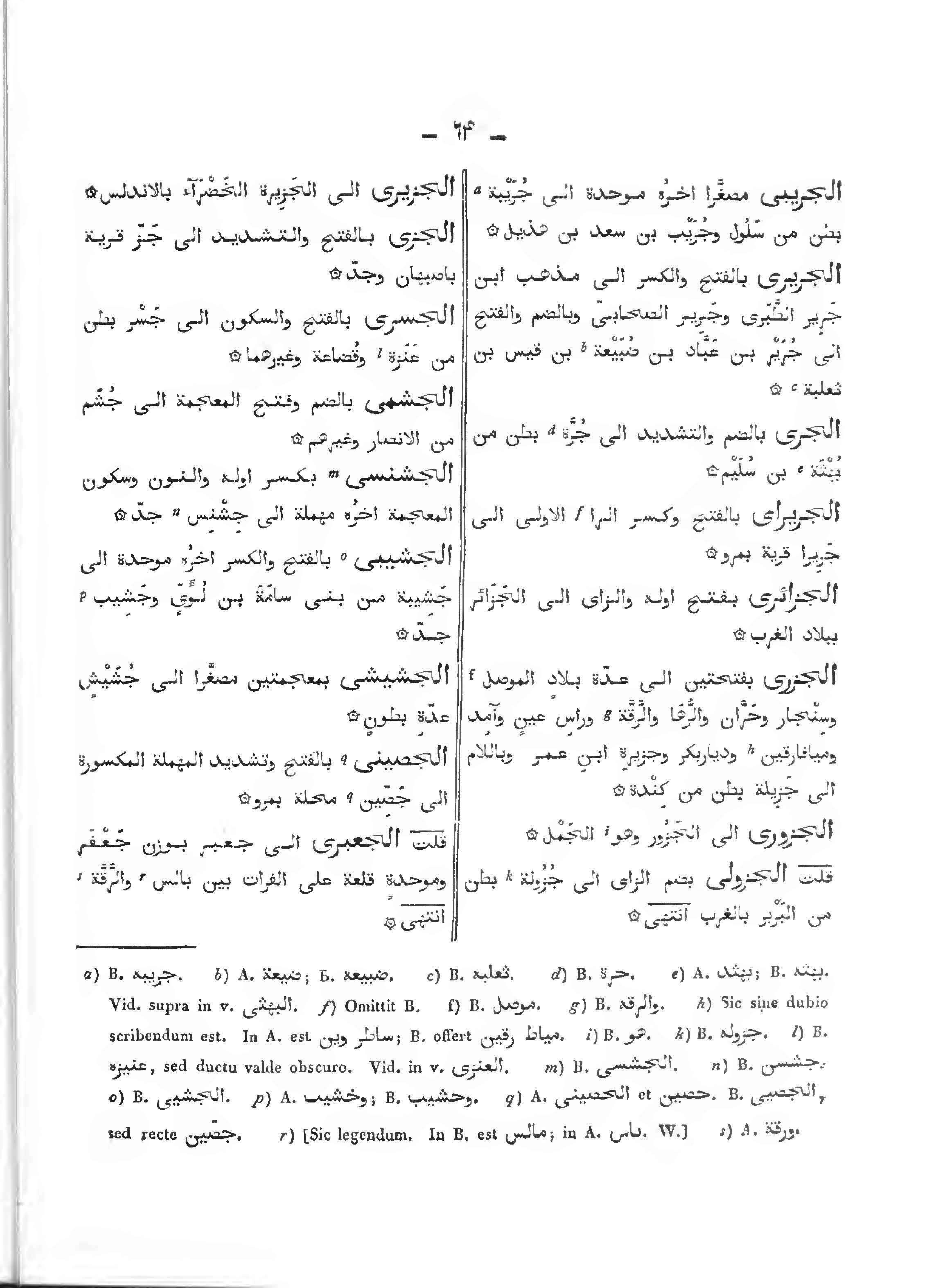 الجزري: بفتحتين إلى عدة بلاد الموصل وسنجار وحران والرها ولارقة ورأس عينٍ وآمد وميافارقين وديار بكر وجزيرة ابن عمر وباللام إلى جزيلة بطن من كندة.