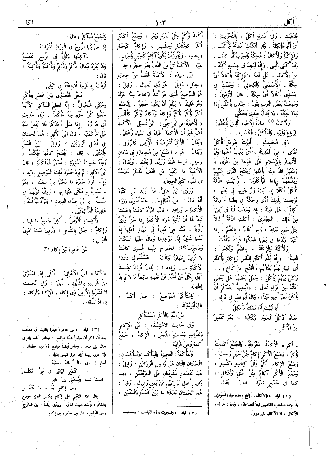 فذهبت وفي أَسنانه أَكَلٌ بالتحريك أَي أَنها مؤْتكِلة وقد ائْتَكَلَتْ أَسنانُه وتأَكَّلت والإِكْلَةُ والأُكال الحِكَّة والجرب أَيّاً كانت وقد أَكَلني رأْسي وإِنه ليَجِدُ في جسمه أَكِلَةً من الأُكال على فَعِلة وإِكْلَةً وأُكالاً أَي حكة الأَصمعي والكسائي وجدت في جسدي أُكَالاً أَي حكة قال الأَزهري وسمعت بعض العرب يقول جِلْدي يأْكُلُني إِذا وجد حكة ولا يقال جِلْدي يَحُكُّني والآكَال سادَةُ الأَحياء الذين يأْخذون المِرْباعَ وغيره والمَأْكَل الكَسْب وفي الحديث أُمِرْت بقربة تَأْكُل القُرَى هي المدينة أَي يَغْلِب أَهلُها وهم الأَنصار بالإِسلام على غيرها من القُرَى وينصر اللهُ دينَه بأَهلها ويفتح القرى عليهم ويُغَنِّمهم إِياها فيأْكلونها وأَكِلَتِ الناقةُ تَأْكَل أَكَلاً إِذا نبت وَبَرُ جَنينها في بطنها فوجدت لذلك أَذى وحِكَّة في بطنها وناقة أَكِلة على فَعِلة إِذا وجدت أَلماً في بطنها من ذلك الجوهري أَكِلَت الناقةُ أَكالاً مثل سَمِع سَمَاعاً وبها أُكَال بالضم إِذا أَشْعَرَ وَلَدُها في بطنها فحكَّها ذلك وتَأَذَّتْ والأُكْلة والإِكْلة بالضم والكسر الغيبة وإِنه لذو أُكْلة للناس وإِكْلة وأَكْلة أَي غيبة لهم يغتابهم الفتح عن كراع وآكَلَ بينهم وأَكَّل حمل بعضهم على بعض كأَنه من قوله تعالى أَيحب أَحدكم أَن يأْكل لحم أَخيه ميتاً وقال أَبو نصر في قوله أَبا ثُبَيْتٍ أَما تَنْفَكُّ تأْتَكِل معناه تأْكل لحومنا وتغتابنا وهو تَفْتَعِل من الأَكل