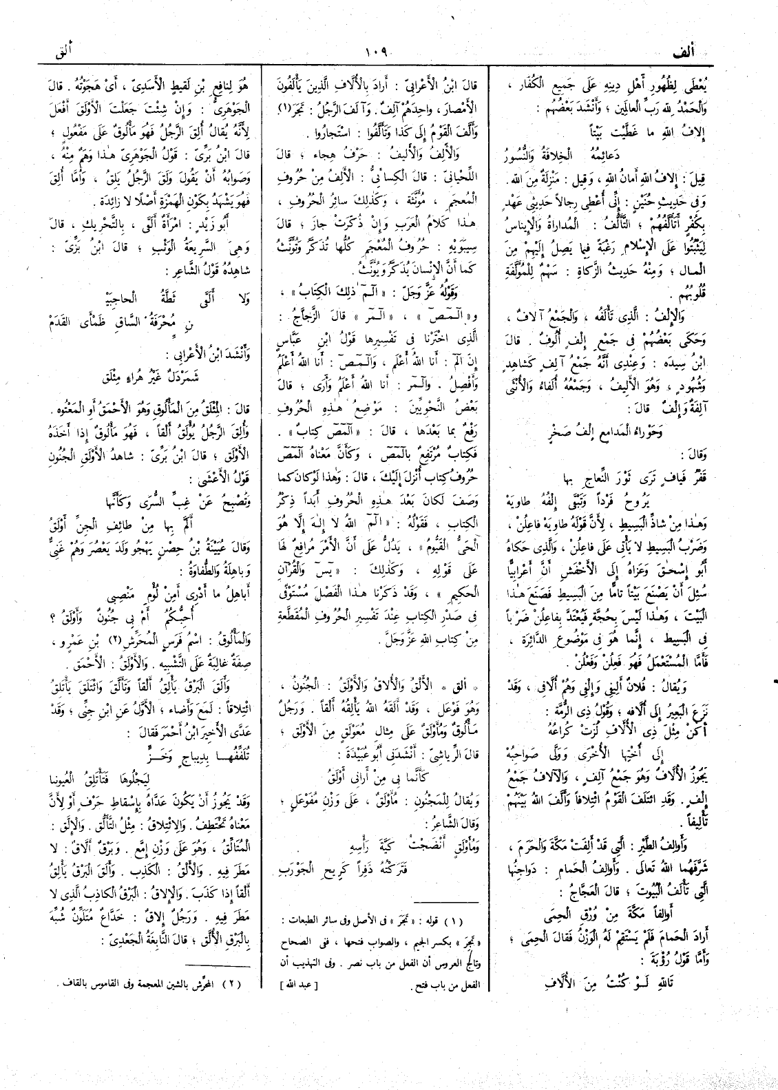 يُعْطى لظهور أَهل دينه على جميع الكفار والحمد للّه رب العالمين وأَنشد بعضهم إلافُ اللّه ما غَطَّيْت بَيْتاً دَعائِمهُ الخِلافةُ والنُّسُورُ قيل إلافُ اللّه أَمانُ اللّه وقيل منزِلةٌ من اللّه وفي حديث حنين إني أُعْطِي رجالاً حدِيثي عهد بكُفْرٍ أَتأَلَّفُهم التأَلُّفُ المُداراةُ والإيناسُ ليَثْبُتُوا على الإسلام رَغْبةً فيما يَصِلُ إليهم من المال ومنه حديثُ الزكاةِ سَهْمٌ للمؤلَّفة قلوبهم والإلْفُ الذي تأْلَفُه والجمع آلافٌ وحكى بعضهم في جمع إلْفٍ اُُلُوفٌ قال ابن سيده وعندي أَنه جمع آلِفٍ كشاهِدٍ وشُهودٍ وهو الأَلِيفُ وجمعه أُلَفاءُ والأُنثى آلِفةٌ وإلْفٌ قال وحَوْراء المَدامِعِ إلْف صَخْر وقال قَفْرُ فَيافٍ تَرى ثَوْرَ النِّعاجِ بها يَروحُ فَرْداً وتَبْقى إلْفُه طاوِيهْ وهذا من شاذ البسيط لأَن قوله طاوِيهْ فاعِلُنْ وضربُ البسيط لا يأْتي على فاعلن والذي حكاه أَبو إسحَق وعزاه إلى الأَخفش أن أَعرابيّاً سئل أَن يصنع بيتاً تامّاً من البسيط فصنع هذا البيت وهذا ليس بحُجة فيُعْتَدَّ بفاعلن ضرباً في البسيط إنما هو في موضوع الدائرة فأَمّا المستعمل فهو فعِلن وفَعْلن ويقال فلان أَلِيفي وإلْفي وهم أُلاَّفي وقد نَزَعَ البعير إلى أُلاَّفه وقول ذي الرمة أَكُنْ مِثْلَ ذي الأُلاَّف لُزَّتْ كُراعُه إلى أُخْتِها الأُخْرى ووَلَّى صَواحِبُهْ يجوزُ الأُلاَّف وهو جمع آلِف والآلاف جمع إلْفٍ وقد ائتَلَفَ القومُ ائتِلافاً وأَلَّفَ اللّه بينهم تأْليفاً وأَوالِفُ الطير التي قد أَلِفَتْ مكةَ والحرمَ شرفهما اللّه تعالى وأَوالِفُ الحمام دَواجِنُها التي تأْلَفُ البيوتَ قال العجاج أَوالِفاً مكةَ من وُرْقِ الحِمى أَراد الحَمام فلم يستقم له الوزن فقال الحِمى وأَما قول رؤبة تاللّهِ لو كنت من الأَلاَّفِ قال ابن الأعرابي أَراد بالأُلاَّف الذين يأْلَفُون الأَمْصارَ واحدهم آلِفٌ وآلَفَ الرجلُ تَجِرَ وأَلَّفَ القومُ إلى كذا وتَأَلَّفُوا استجاروا والأَلِفُ والأَلِيفُ حرف هجاء قال اللحياني قال الكسائي الأَلف من حروف المعجم مؤنثة وكذلك سائر الحروف هذا كلام العرب وإن ذكَّرت جاز قال سيبوبه حروف المعجم كلها تذكر وتؤنث كما أَنَّ الإنسان يذكّر ويؤنث وقوله عز وجل أَلم ذلك الكتاب وأَلمص وأَلمر قال الزجاج الذي اخترنا في تفسيرها قول ابن عباس إن أَلم أَنا اللّه أَعلم وأَلمص أَنا اللّه أَعلم وأَفْصِلُ وأَلمر أَنا اللّه أَعلم وأرى قال بعض النحويين موضع هذه الحروف رفع بما بعدها قال أَلمص كتاب فكتاب مرتفع بأَلمص وكأَنّ معناه أَلمص حروف كتاب أُنزل إليك قال وهذا لو كان كما وصف لكان بعد هذه الحروف أَبداً ذكر الكتاب فقوله أَلم اللّه لا إله إلا هو الحيّ القيوم يدل على أَن الأَمر مرافع لها على قوله وكذلك يس والقرآن الحكيم وقد ذكرنا هذا الفصل مستوفى في صدر الكتاب عند تفسير الحروف المُقَطَّعةِ من كتاب اللّه عز وجل