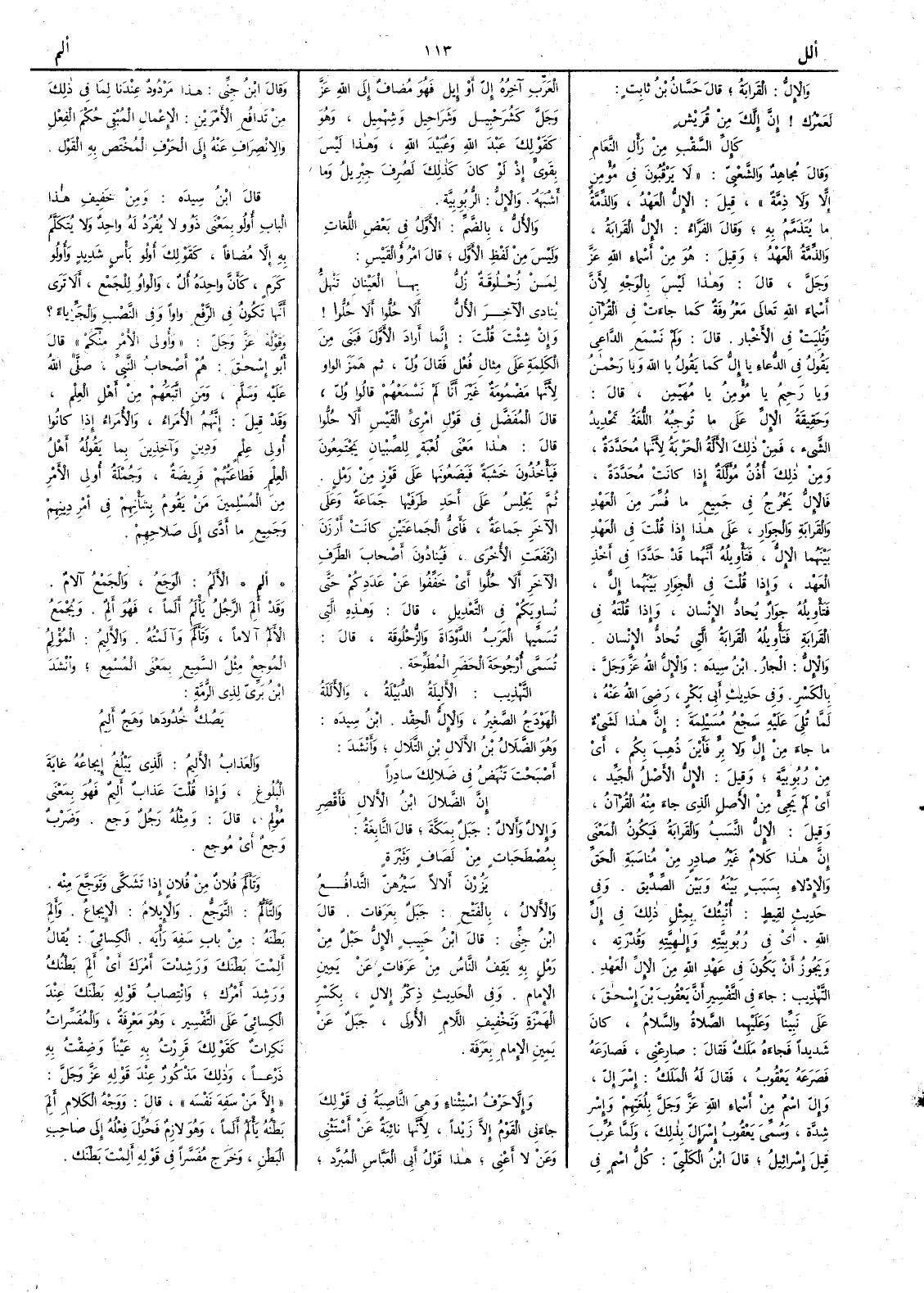 والإِلُّ القرابة قال حَسّان بن ثابت لَعَمْرُك إِنَّ إِلَّك من قُرَيْش كإِلِّ السَّقْبِ من رَأْلِ النَّعَام وقال مجاهد والشعبي لا يرقبون في مؤمن إِلاٍّ ولا ذمة قيل الإِلُّ العهد والذمة ما يُتَذَمَّم به وقال الفراء الإِلُّ القرابة والذِّمة العَهد وقيل هو من أَسماء الله عز وجل قال وهذا ليس بالوجه لأَن أَسماء الله تعالى معروفة كما جاءت في القرآن وتليت في الأَخبار قال ولم نسمع الداعي يقول في الدعاء يا إِلُّ كما يقول يا الله ويا رحمن ويا رحيم يا مؤمن يا مهيمن قال وحقيقةُ الإِلِّ على ما توجبه اللغة تحديدُ الشيء فمن ذلك الأَلَّة الحَرْبة لأَنها محدّدة ومن ذلك أُذن مُؤلَّلة إِذا كانت محددة فالإِلُّ يخرج في جميع ما فسر من العهد والقرابة والجِوَار على هذا إِذا قلت في العهد بينها الإِلُّ فتأْويله أَنهما قد حدّدا في أَخذ العهد وإِذا قلت في الجِوَار بينهما إِلٌّ فتأْويله جِوَار يحادّ الإِنسان وإِذا قلته في القرابة فتأْويله القرابة التي تُحادّ الإِنسان والإِلُّ الجار ابن سيده والإِلُّ الله عز وجل بالكسر وفي حديث أَبي بكر رضي الله عنه لما تلي عليه سَجْع مُسَيْلِمة إِنَّ هذا لَشَيْءٌ ما جاء من إِلّ ولا برٍٍّّ فَأَيْن ذُهِب بكم أَي من ربوبية وقيل الإِلُّ الأَصل الجيد أَي لم يَجئ من الأَصل الذي جاء منه القرآن وقيل الإِلُّ النَّسَب والقرابة فيكون المعنى إِن هذا كلام غير صادر من مناسبة الحق والإِدلاء بسبب بينه وبين الصّدِّيق وفي حديث لَقيط أُنبئك بمثل ذلك في إِلِّ الله أَي في ربوبيته وإِلَهيته وقدرته ويجوز أَن يكون في عهد الله من الإِلِّ العهدِ التهذيب جاء في التفسير أَن يعقوب بن إِسحق على نبينا وعليهما الصلاة والسلام كان شديداً فجاءه مَلَك فقال صارِعْني فصارعه يعقوب فقال له الملك إِسْرَإِلّ وإِلّ اسم من أَسماء الله عز وجل بِلُغَتهم وإِسْر شدة وسمي يعقوب إِسْرَإِلّ بذلك ولما عُرِّب قيل إِسرائيل قال ابن الكلبي كل اسم في العرب آخره إِلّ أَو إِيل فهو مضاف إِلى الله عز وجل كَشُرَحْبِيل وشَرَاحيل وشِهْمِيل وهو كقولك عبدالله وعبيدالله وهذا ليس بقويّ إِذ لو كان كذلك لصرف جبريل وما أَشبهه والإِلُّ الربوبية والأُلُّ بالضم الأَوّل في بعض اللغات وليس من لفظ الأَوّل قال امرؤ القيس لِمَنْ زُحْلوقَةٌ زُلُّ بها العَيْنان تَنْهلُّ ينادي الآخِرَ الأُلُّ أَلا حُلُّوا أَلا حُلّوا وإِن شئت قلت إِنما أَراد الأَوَّل فبَنَى من الكلمة على مِثال فُعْل فقال وُلّ ثم هَمَزَ الواو لأَنها مضمومة غير أَنا لم نسمعهم قالوا وُلّ قال المفضل في قول امرئ القيس أَلا حُلُّوا قال هذا معنى لُعْبة للصبيان يجتمعون فيأْخذون خشبة فيضعونها على قَوْزٍ من رمل ثم يجلس على أَحد طَرَفيها جماعة وعلى الآخر جماعة فأَيُّ الجماعتين كانت أَرزن ارتفعت الأُخرى فينادون أَصحاب الطرف الآخر أَلا حُلُّوا أَي خففوا عن عددكم حتى نساويكم في التعديل قال وهذه التي تسميها العرب الدَّوْدَاةَ والزُّحْلوقة قال تسمى أُرْجوحة الحضر المطوّحة التهذيب الأَلِيلة الدُّبَيْلة والأَلَلة الهَوْدَج الصغير والإِلُّ الحِقد ابن سيده وهو الضَّلال بنُ الأَلال بن التَّلال وأَنشد أَصبحتَ تَنْهَضُ في ضَلالِك سادِراً إِن الضَّلال ابْنُ الأَلال فَأَقْصِر وإِلالٌ وأَلالٌ جبل بمكة قال النابغة بمُصْطَحَباتٍ من لَصَاف وثَبْرَةٍ يَزُرْنَ أَلالاً سَيْرُهنّ التَّدافُعُ والأَلالُ بالفتح جبل بعرفات قال ابن جني قال ابن حبيب الإِلُّ حَبْل من رمل به يقف الناس من عرفات عن يمين الإِمام وفي الحديث ذكر إِلالٍ بكسر الهمزة وتخفيف اللام الأُولى جَبَل عن يمين الإِمام بعرفة وإِلا حرف استثناء وهي الناصبة في قولك جاءني القوم إِلاَّ زيداً لأَنها نائبة عن أَستثني وعن لا أَعني هذا قول أَبي العباس المبرد وقال ابن جني هذا مردود عندنا لما في ذلك من تدافع الأَمرين الإِعمال المبقي حكم الفعل والانصراف عنه إِلى الحرف المختص به القول قال ابن سيده ومن خفيف هذا الباب أُ