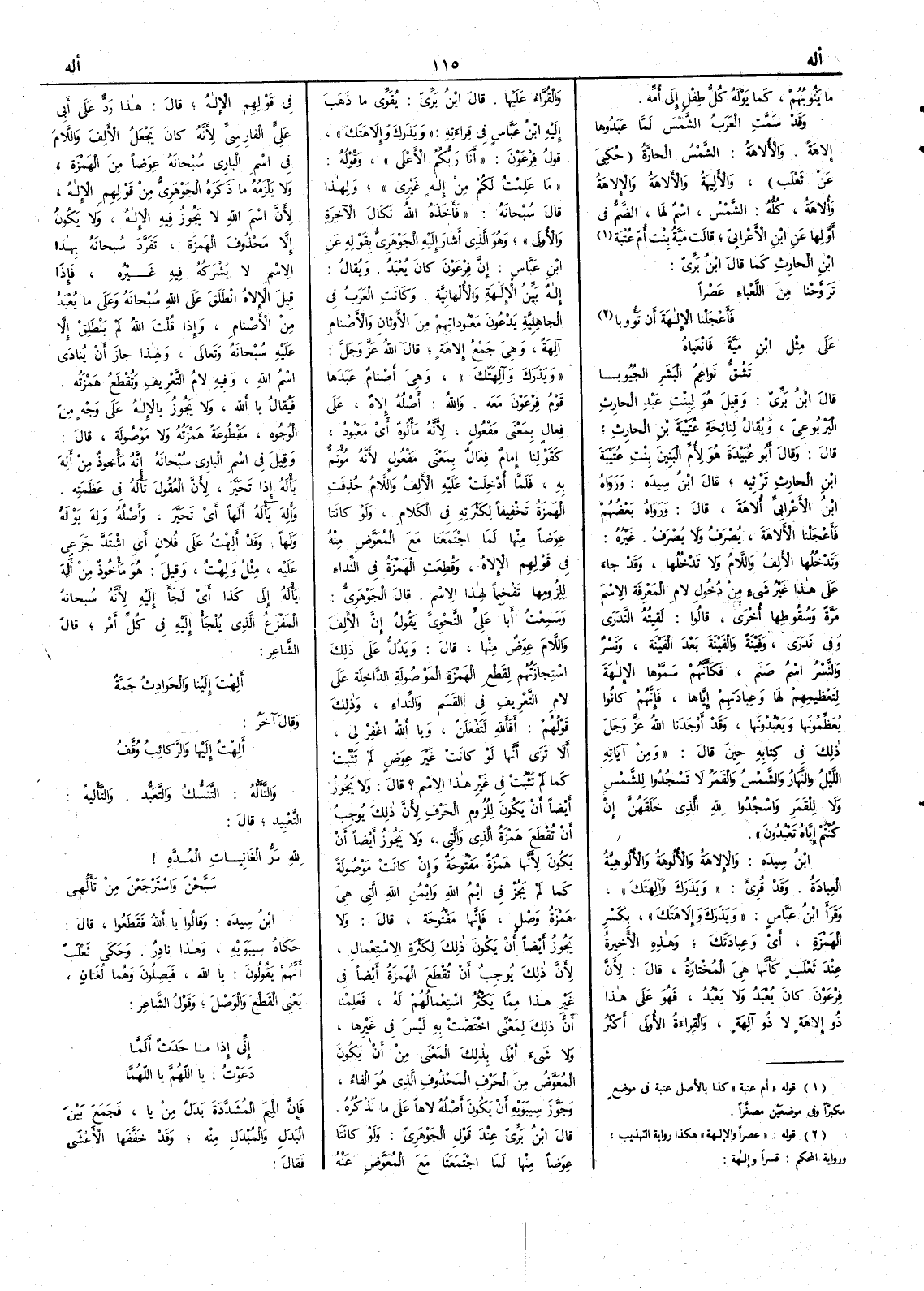 على مثْل ابن مَيَّة فانْعَياه تَشُقُّ نَواعِمُ البَشَر الجُيُوبا قال ابن بري وقيل هو لبنت عبد الحرث اليَرْبوعي ويقال لنائحة عُتَيْبة بن الحرث قال وقال أَبو عبيدة هو لأُمِّ البنين بنت عُتيبة بن الحرث ترثيه قال ابن سيده ورواه ابن الأَعرابي أُلاهَةَ قال ورواه بعضهم فأَعجلنا الأَلاهَةَ يصرف ولا يصرف غيره وتدخلها الأَلف واللام ولا تدخلها وقد جاء على هذا غير شيء من دخول لام المعرفة الاسمَ مَرَّة وسُقوطها أُخرى قالوا لقيته النَّدَرَى وفي نَدَرَى وفَيْنَةً والفَيْنَةَ بعد الفَيْنة ونَسْرٌ والنَّسْرُ اسمُ صنم فكأَنهم سَمَّوْها الإلَهة لتعظيمهم لها وعبادتهم إياها فإنهم كانوا يُعَظِّمُونها ويَعْبُدُونها وقد أَوْجَدَنا اللهُ عز وجل ذلك في كتابه حين قال ومن آياته الليلُ والنهارُ والشمسُ والقمرُ لا تَسْجُدُوا للشمس ولا للقمر واسجُدُوا لله الذي خَلَقَهُنَّ إن كنتم إياه تعبدون ابن سيده والإلاهَةُ والأُلُوهة والأُلُوهِيَّةُ العبادة وقد قرئ ويَذَرَكَ وآلِهتَكَ وقرأَ ابن عباس ويَذَرَك وإِلاهَتَك بكسر الهمزة أَي وعبادتك وهذه الأَخيرة عند ثعلب كأَنها هي المختارة قال لأَن فرعون كان يُعْبَدُ ولا يَعْبُدُ فهو على هذا ذو إلاهَةٍ لا ذو آلِهة والقراءة الأُولى أَكثر والقُرّاء عليها قال ابن بري يُقَوِّي ما ذهب إليه ابن عباس في قراءته ويذرك وإِلاهَتَك قولُ فرعون أَنا ربكم الأَعلى وقوله ما علمتُ لكم من إله غيري ولهذا قال سبحانه فأَخَذه اللهُ نَكالَ الآخرةِ والأُولى وهو الذي أَشار إِليه الجوهري بقوله عن ابن عباس إن فرعون كان يُعْبَدُ ويقال إلَه بَيِّنُ الإلَهةِ والأُلْهانِيَّة وكانت العرب في الجاهلية يَدْعُونَ معبوداتهم من الأَوثان والأَصنام آلهةً وهي جمع إلاهة قال الله عز وجل ويَذَرَك وآلِهَتَك وهي أَصنام عَبَدَها قوم فرعون معه والله أَصله إلاهٌ على فِعالٍ بمعنى مفعول لأَنه مأَلُوه أَي معبود كقولنا إمامٌ فِعَالٌ بمعنى مَفْعول لأَنه مُؤْتَمّ به فلما أُدخلت عليه الأَلف واللام حذفت الهمزة تخفيفاً لكثرته في الكلام ولو كانتا عوضاً منها لما اجتمعتا مع المعوَّض منه في قولهم الإلاهُ وقطعت الهمزة في النداء للزومها تفخيماً لهذا الاسم قال الجوهري وسمعت أَبا علي النحوي يقول إِن الأَلف واللام عوض منها قال ويدل على ذلك استجازتهم لقطع الهمزة الموصولة الداخلة على لام التعريف في القسم والنداء وذلك قولهم أَفأَللهِ لَتفْعَلَنّ ويا الله اغفر لي أَلا ترى أَنها لو كانت غير عوض لم تثبت كما لم تثبت في غير هذا الاسم ؟ قال ولا يجوز أَيضاً أَن يكون للزوم الحرف لأَن ذلك يوجب أَن تقطع همزة الذي والتي ولا يجوز أَيضاً أَن يكون لأَنها همزة مفتوحة وإن كانت موصولة كما لم يجز في ايْمُ الله وايْمُن الله التي هي همزة وصل فإنها مفتوحة قال ولا يجوز أَيضاً أَن يكون ذلك لكثرة الاستعمال لأَن ذلك يوجب أَن تقطع الهمزة أَيضاً في غير هذا مما يكثر استعمالهم له فعلمنا أَن ذلك لمعنى اختصت به ليس في غيرها ولا شيء أَولى بذلك المعنى من أَن يكون المُعَوَّضَ من الحرف المحذوف الذي هو الفاء وجوّز سيبويه أَن يكون أَصله لاهاً على ما نذكره قال ابن بري عند قول الجوهري ولو كانتا عوضاً منها لما اجتمعتا مع المعوَّض عنه في قولهم الإلَهُ قال هذا رد على أَبي علي الفارسي لأَنه كان يجعل الأَلف واللام في اسم الباري سبحانه عوضاً من الهمزة ولا يلزمه ما ذكره الجوهري من قولهم الإلَهُ لأَن اسم الله لا يجوز فيه الإلَهُ ولا يكون إلا محذوف الهمزة تَفَرَّد سبحانه بهذا الاسم لا يشركه فيه غيره فإذا قيل الإلاه انطلق على الله سبحانه وعلى ما يعبد من الأَصنام وإذا قلت الله لم ينطلق إلا عليه سبحانه وتعالى ولهذا جاز أَن ينادي اسم الله وفيه لام التعريف وتقطع همزته فيقال يا ألله ولا يجوز يالإلهُ على وجه من الوجوه مقطوعة همزته ولا موصولة قال وقيل في اسم الباري سبحانه إنه مأْخوذ من أَلِهَ يَأْلَه إذا تحير لأَن العقول تَأْلَهُ في عظمته وأَلِهَ أَل