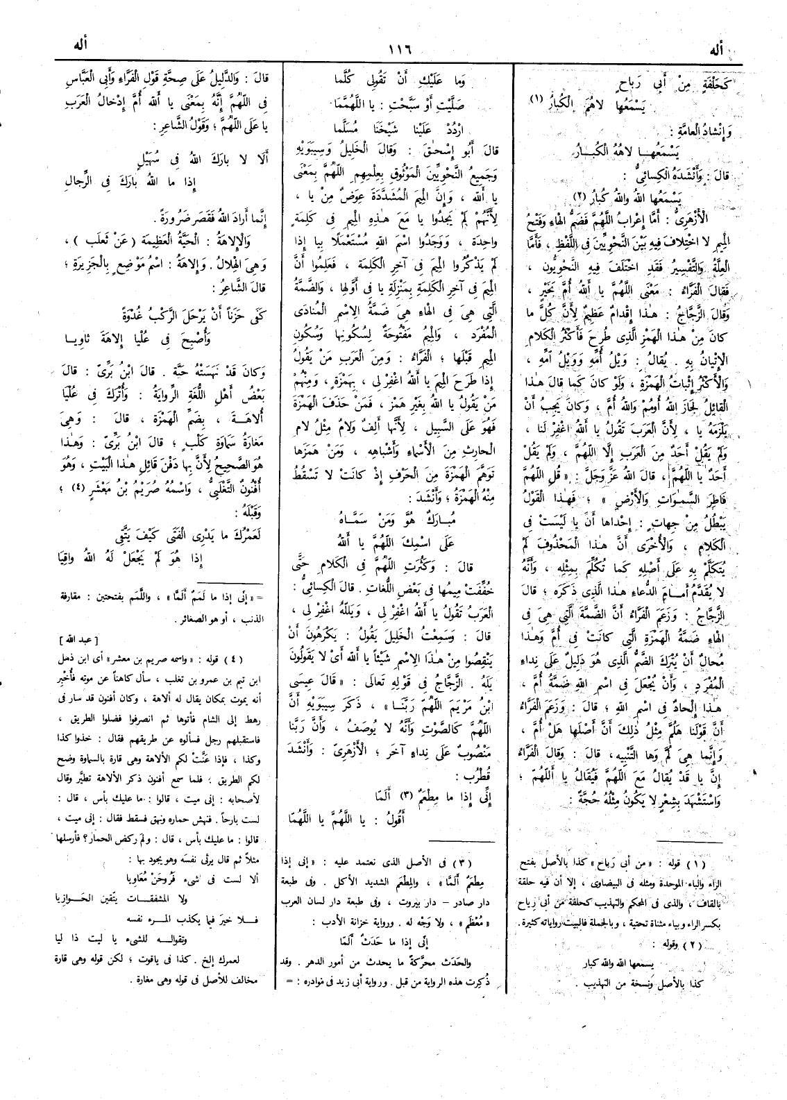 الأَزهري أَما إعراب اللهم فضم الهاء وفتح الميم لا اختلاف فيه بين النحويين في اللفظ فأَما العلة والتفسير فقد اختلف فيه النحويون فقال الفراء معنى اللهم يا أَللهُ أُمَّ بخير وقال الزجاج هذا إقدام عظيم لأَن كل ما كان من هذا الهمز الذي طرح فأَكثر الكلام الإتيان به يقال وَيْلُ أُمِّه ووَيْلُ امِّهِ والأَكثر إثبات الهمزة ولو كان كما قال هذا القائل لجاز الله أُومُمْ واللهُ أُمَّ وكان يجب أَن يلزمه يا لأَن العرب تقول يا ألله اغفر لنا ولم يقل أَحد من العرب إلا اللهم ولم يقل أَحد يا اللهم قال الله عز وجل قُلِ اللهم فاطرَ السمواتِ والأَرضِ فهذا القول يبطل من جهات إحداها أَن يا ليست في الكلام والأُخرى أَن هذا المحذوف لم يتكلم به على أَصله كما تكلم بمثله وأَنه لا يُقَدَّمُ أَمامَ الدُّعاء هذا الذي ذكره قال الزجاج وزعم الفراء أَن الضمة التي هي في الهاء ضمة الهمزة التي كانت في أُمِّ وهذا محال أَن يُتْرَكَ الضمُّ الذي هو دليل على نداء المفرد وأَن يجعل في اسم الله ضمةُ أُمَّ هذا إلحاد في اسم الله قال وزعم الفراء أَن قولنا هَلُمَّ مثل ذلك أَن أَصلها هَلْ أُمَّ وإنما هي لُمَّ وها التنبيه قال وقال الفراء إن يا قد يقال مع اللهم فيقال يا أَللهم واستشهد بشعر لا يكون مثله حجة وما عليكِ أَن تَقُولِي كُلَّما صَلَّيْتِ أَو سَبَّحْت يا أَللَّهُمَا ارْدُدْ علينا شَيْخَنَا مُسَلَّما قال أَبو إسحق وقال الخليل وسيبويه وجميع النحويين الموثوق بعلمهم اللهم بمعنى يا أَلله وإن الميم المشددة عوض من يا لأَنهم لم يجدوا يا مع هذه الميم في كلمة واحدة ووجدوا اسم الله مستعملاً بيا إذا لم يذكروا الميم في آخر الكلمة فعلموا أَن الميم في آخر الكلمة بمنزلة يا في أَولها والضمة التي هي في الهاء هي ضمة الاسم المنادى المفرد والميم مفتوحة لسكونها وسكون الميم قبلها الفراء ومن العرب من يقول إذا طرح الميم يا ألله اغفر لي بهمزة ومنهم من يقول يا الله بغير همز فمن حذف الهمزة فهو على السبيل لأَنها أَلف ولام مثل لام الحرث من الأَسماء وأَشباهه ومن همزها توهم الهمزة من الحرف إذ كانت لا تسقط منه الهمزة وأَنشد مُبارَكٌ هُوَّ ومن سَمَّاهُ على اسْمكَ اللَّهُمَّ يا أَللهُ قال وكثرت اللهم في الكلام حتى خففت ميمها في بعض اللغات قال الكسائي العرب تقول يا أَلله اغفر لي ويَلّله اغفر لي قال وسمعت الخليل يقول يكرهون أَن ينقصوا من هذا الاسم شيئاً يا أَلله أَي لا يقولون يَلَهُ الزجاج في قوله تعالى قال عيسى بنُ مريم اللهم ربنا ذكر سيبويه أَن اللهم كالصوت وأَنه لا يوصف وأَن ربنا منصوب على نداء آخر الأَزهري وأَنشد قُطْرُب إِني إِذا ما مُعْظَمٌ أَلَمّا أَقولُ يا اللَّهُمَّ يا اللَّهُمّا قال والدليل على صحة قول الفراء وأَبي العباس في اللهم إِنه بمعنى يا أَلله أُمَّ إِدخالُ العرب يا على اللهم وقول الشاعر أَلا لا بارَكَ اللهُ في سُهَيْلٍ إِذا ما اللهُ بارك في الرجالِ إِنما أَراد الله فقَصَر ضرورة والإِلاهَةُ الحية العظيمة عن ثعلب وهي الهِلالُ وإِلاهَةُ اسم موضع بالجزيرة قال الشاعر كفى حَزَناً أَن يَرْحَلَ الركبُ غُدْوةً وأُصْبِحَ في عُلْيا إِلاهَةِ ثاوِيا وكان قد نَهَسته حية قال ابن بري قال بعض أَهل اللغة الرواية وأُتْرَكَ في عُلْيَا أُلاهَةَ بضم الهمزة قال وهي مَغارَةُ سَمَاوَة كَلْب قال ابن بري وهذا هو الصحيح لأَن بها دفن قائل هذا البيت وهو أُفْنُونٌ التَّغْلَبيّ واسمه صُرَيْمُ بن مَعْشَرٍ