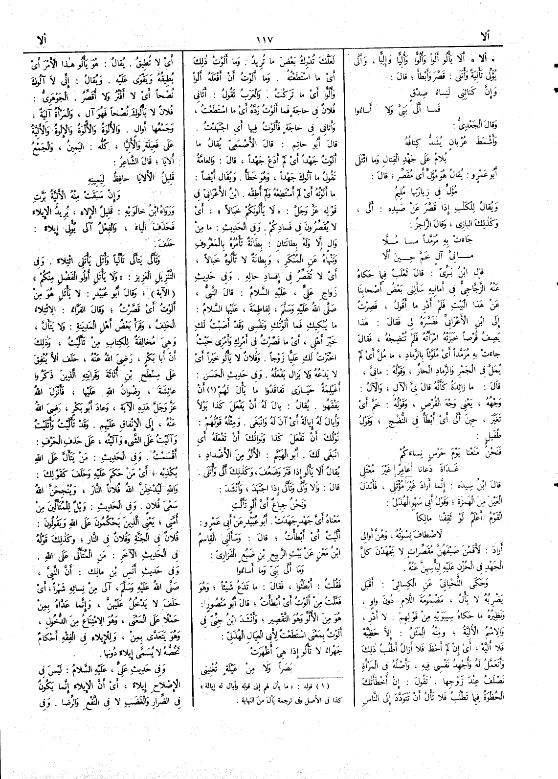 ( * قوله « ما يأل لهم إلى قوله وأيال له إيالة » كذا في الأصل وفي ترجمة يأل من النهاية ) أَن يَفْقَهوا يقال يالَ له أَن يفعل كذا يولاً وأَيالَ له إيالةً أَي آنَ له وانْبَغَى ومثله قولهم نَوْلُك أَن تفعل كذا ونَوالُكَ أَن تَفْعَله أَي انْبَغَى لك أَبو الهيثم الأَلْوُ من الأَضداد يقال أَلا يَأْلُو إذا فَتَرَ وضَعُف وكذلك أَلَّى وأْتَلى قال وأَلا وأَلَّى وتَأَلَّى إذا اجتهد وأَنشد ونحْنُ جِياعٌ أَيَّ أَلْوٍ تَأَلَّتِ معناه أَيَّ جَهْدٍ جَهَدَتْ أَبو عبيد عن أَبي عمرو أَلَّيْتُ أَي أَبْطأْت قال وسأَلني القاسم بن مَعْن عن بيت الربيع بن ضَبُع الفَزارِي وما أَلَّى بَنِيّ وما أَساؤوا فقلت أَبطؤوا فقال ما تَدَعُ شيئاً وهو فَعَّلْت من أَلَوْت أَي أَبْطأْت قال أَبو منصور هو من الأُلُوِّ وهو التقصير وأَنشد ابن جني في أَلَوْت بمعنى استطعت لأَبي العِيال الهُذَلي جَهْراء لا تَأْلُو إذا هي أَظْهَرَتْ بَصَراً ولا مِنْ عَيْلةٍ تُغْنِيني أَي لا تُطِيق يقال هو يَأْلُو هذا الأَمر أَي يُطِيقه ويَقْوَى عليه ويقال إنى لا آلُوكَ نُصْحاً أَي لا أَفْتُر ولا أُقَصِّر الجوهري فلان لا يَأْلُوك نصْحاً فهو آلٍ والمرأَة آلِيَةٌ وجمعها أَوالٍ والأُلْوة والأَلْوة والإلْوة والأَلِيَّة على فعِيلة والأَلِيَّا كلُّه اليمين والجمع أَلايَا قال الشاعر قَلِيلُ الأَلايَا حافظٌ لِيَمينِه وإنْ سَبَقَتْ منه الأَلِيَّةُ بَرَّتِ ورواه ابن خالويه قليل الإلاء يريد الإيلاءَ فحذف الياء والفعل آلَى يُؤْلي إيلاءً حَلَفَ وتأَلَّى يَتأَلَّى تأَلِّياً وأْتَلى يَأْتَلي ائتِلاءً وفي التنزيل العزيز ولا يَأْتَلِ أُولو الفَضْل منكم ( الآية )