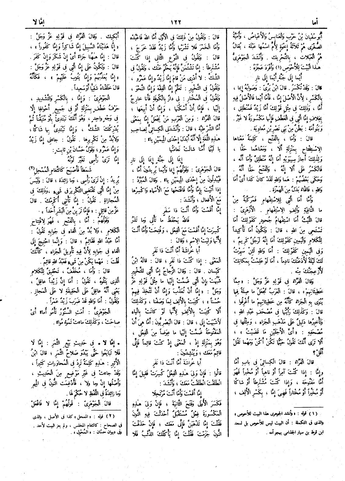 ( * قوله « وأنشد الجوهري هذا البيت للاحوص » الذي في التكملة أن البيت ليس للاحوص بل لسعد بن قرط بن سيار الجذامي يهجو أمه ) وأَفرد عجزه أَيْما إِلى جنة أَيما إِلى نار قال وقد تكسر قال ابن بري وصوابه إِيما بالكسر لأَن الأَصل إِما فأَما أَيْما فالأَصل فيه أَمّا وذلك في مثل قولك أَمّا زيد فمنطلق بخلاف إِمّا التي في العطف فإِنها مكسورة لا غير وبنو أَمَة بطن من بني نصر بن معاوية قال وأَمَا بالفتح كلمة معناها الاستفتاح بمنزلة أَلا ومعناهما حقّاً ولذلك أَجاز سيبويه أَمَا إِنَّه منطلق وأَما أنه فالكسر على أَلا إِنَّه والفتح حقّاً أَنَّه وحكى بعضهم هَما والله لقد كان كذا أَي أَما والله فالهاء بدل من الهمزة وأَمَّا أَما التي للاستفهام فمركبة من ما النافية وأَلف الاستفهام الأَزهري قال الليث أَمَا استفهام جحود كقولك أَمَا تستحي من الله قال وتكون أَمَا تأْكيداً للكلام واليمين كقولك أَما إِنَّه لرجلٌ كريم وفي اليمين كقولك أَمَا والله لئن سهرت لك ليلة لأَدَعَنَّكَ نادماً أَمَا لو علمت بمكانك لأُزعجنك منه وقال الفراء في قوله عز وجل مِمّا خَطاياهم قال العرب تجعل ما صِلَةً فيما ينوى به الجزاء كأَنه من خطيئاتهم ما أغرقوا قال وكذلك رأَيتها في مصحف عبد الله وتأْخيرها دليل على مذهب الجزاء ومثلها في مصحفه أَيَّ الأَجَلَيْنِ ما قَضَيْتُ أَلا ترى أَنك تقول حَيْثُما تكن أَكن ومهْما تَقُلْ أَقُلْ ؟ قال الفراء قال الكسائي في باب أَمَّا وإِمَّا إذا كنت آمراً أَو ناهياً أَو مخبراً فهو أَمّا مفتوحة وإِذا كنت مشترطاً أَو شاكّاً أَو مُخَيِّراً أَو مختاراً فهي إِمَّا بكسر الأَلف قال وتقول من ذلك في الأَول أَمَّا اللهَ فاعْبُدْه وأَمّا الخمر فلا تشرَبْها وأَمّا زيد فقد خرج قال وتقول في النوع الثاني إِذا كنت مشترطاً إِمّا تَشْتُمَنَّ فإِنه يَحْلُم عنك وتقول في الشك لا أَدري من قام إِمَّا زيد وإِمَّا عمرو وتقول في التخيير تَعَلَّمْ إِمَّا الفقه وإِما النحو وتقول في المختار لي دار بالكوفة فأَنا خارج إِليها فإِما أَن أَسكنها وإِمّا أن أَبيعها قال الفراء ومن العرب من يجعل إِمّا بمعنى أَمّا الشرطية قال وأَنشدني الكسائي لصاحب هذه اللغة إِلاَّ أَنه أبدل إِحدى الميمين ياء يا لَيْتَما أُمَّنا شالت نَعامتُها إِيما إلى جنة إِيما إِلى نار قال الجوهري وقولهم إِيما وأَيْما يريدون أَمّا فيبدلون من إِحدى الميمين ياء وقال المبرد إِذا أَتيت بإِمّا وأَما فافتحها مع الأَسماء واكسرها مع الأَفعال وأَنشد إِمَّا أَقَمْتَ وأَمّا أَنت ذا سفر فاللهُ يَحْفَظُ ما تأْتي وما تَذَرُ كسرت إِمّا أَقمتَ مع الفعل وفتحت وأَمّا أَنت لأَنها وَلِيَت الاسم وقال أَبا خُراشة أَمَّا أَنتَ ذا نَفَرٍ المعنى إِذا كنت ذا نَفَر قال قاله ابن كَيْسان قال وقال الزجاج إِمّا التي للتخيير شبهت بأَن التي ضمت إِليها ما مثل قوله عز وجل إِمّا أَن تُعذبَ وإِما أَن تَتَّخذَ فيهم حُسْناً كتبت بالأَلف لما وصفنا وكذلك أَلا كتبت بالأَلف لأَنها لو كانت بالياء لأَشبهت إِلى قال قال البصريون أَمّا هي أَن المفتوحة ضمت إِليها ما عوضاً من الفعل وهو بمنزلة إِذ المعنى إِذا كنت قائماً فإِني قائم معك وينشدون أَبا خراشة أَمَّا كنت ذا نفر قالوا فإِن ولي هذه الفعل كسرت فقيل إِمَّا انطلقتَ انطلقتُ معك وأَنشد إِمّا أَقمت وأَما أَنت مرتحلا فكسر الأُولى وفتح الثانية فإِن ولي هذه المكسورة فعل مستقبل أَحدثت فيه النون فقلت إِمّا تذهبنَّ فإِني معك فإِن حذفت النون جزمت فقلت إِما يأْكلْك الذئب فلا أَبكيك وقال الفراء في قوله عز وجل انا هديناه السبيل إِمّا شاكراً وإِمَّا كفوراً قال إِمّا ههنا جزاء أَي إِن شكر وإِن كفر قال وتكون على إِما التي في قوله عز وجل إِمّا يعذبهم وإِما يتوب عليهم فكأَنه قال خلقناه شقيّاً أَو سعيداً الجوهري وإِمّا بالكسر والتشديد حرف عطف بمنزلة أَو في جميع أَحوالها إِلا في وجه واحد وهو أَنك تبتدئ بأَو متيقناً ثم يدركك الشك وإما تبتدئ بها شاك