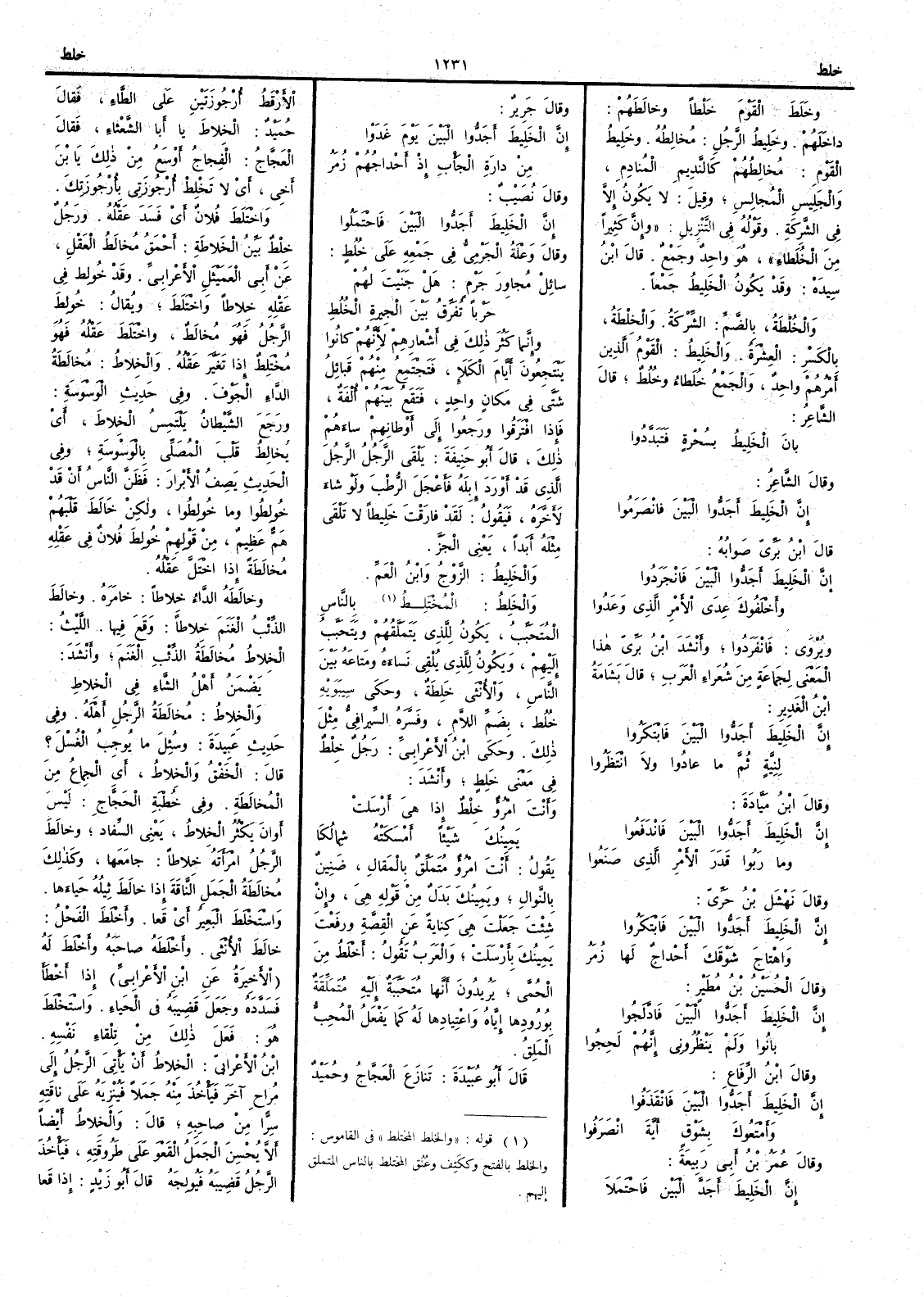 ( * قوله « والخلط المختلط » في القاموس والخلط بالفتح وككتف وعنق المختلط بالناس المتملق اليهم ) بالناس المُتَحَبِّبُ يكون للذي يَتَمَلَّقُهم ويتحَبَّبُ إِليهم ويكون للذي يُلْقي نساءَه ومتاعَه بين الناس والأُنثى خَلِطةٌ وحكى سيبويه خُلُط بضم اللام وفسره السيرافي مثل ذلك وحكى ابن الأَعرابي رجل خِلْطٌ في معنى خَلِطٍ وأَنشد وأَنتَ امرُؤٌ خِلْطٌ إِذا هي أَرْسَلتْ يَمينُكَ شيئاً أَمْسَكَتْهُ شِمالُكا يقول أَنت امرؤ مُتَمَلِّقٌ بالمَقال ضنينٌ بالنَّوال ويمينُك بدل من قوله هي وإِن شئت جعلت هي كنايةً عن القِصّة ورفَعْت يمينك بأَرسلت والعرب تقول أَخْلَطُ من الحمَّى يريدون أَنها متحببة إِليه مُتَمَلِّقة بورُودها إِياه واعْتيادِها له كما يفعل المُحِبُّ المَلِقُ قال أَبو عبيدة تنازعَ العجاجُ وحُمَيْدٌ الأَرْقَطُ أُرْجُوزَتين على الطاء فقال حميد الخِلاطَ يا أَبا الشعْثاء فقال العجاج الفجاجُ أَوْسَعُ من ذلك يا ابن أَخي أَي لا تَخْلِطْ أُرْجُوزَتي بأُرْجُوزَتِكَ واخْتَلَطَ فلان أَي فسد عقله ورجل خِلْطٌ بَيِّنُ الخَلاطةِ أَحْمَقُ مُخالَطُ العقْل عن أَبي العَمَيْثَلِ الأَعرابي وقد خُولِطَ في عَقْلِه خِلاطاً واخْتَلَطَ ويقال خُولِط الرجلُ فهو مُخالَطٌ واخْتَلَطَ عقلُه فهو مُخْتَلِط إِذا تغير عقلُه والخِلاطُ مخالطةُ الداءِ الجوفَ وفي حديث الوَسْوَسةِ ورجَعَ الشيطانُ يَلْتمس الخِلاطَ أَي يخالِط قَلْبَ المصلي بالوَسْوَسةِ وفي الحديث يَصِف الأَبرار فظنَّ الناس أَن قد خُولِطُوا وما خُولِطُوا ولكن خالط قلْبَهم هَمٌّ عَظيمٌ من قولهم خُولط فلان في عقله مُخالَطة إِذا اختلَّ عقله وخالَطه الداءُ خِلاطاً خامره وخالط الذئبُ الغَنَمَ خِلاطاً وقَع فيها الليث الخِلاطُ مخالطةُ الذئبِ الغَنَم وأَنشد يَضْمَنُ أَهل الشاءِ في الخِلاطِ والخِلاط مخالَطة الرجلُ أَهلَه وفي حديث عَبِيدةَ وسُئل ما يُوجِبُ الغُسْلَ ؟ قال الخَفْقُ والخِلاطُ أَي الجِماعُ من المخالطة وفي خطبة الحجاج ليس أَوانَ يَكْثُر الخِلاط يعني السِّفادَ وخالَط الرجلُ امرأَتَه خِلاطاً جامَعها وكذلك مخالَطةُ الجملِ الناقةَ إِذا خالَط ثِيلُه حَياءَها واسْتخلط البعير أَي قَعا وأَخلط الفحْلُ خالط الأُنثى وأَخلطه صاحبه وأَخلط له الأَخيرة عن ابن الأَعرابي إِذا أَخطأَ فسدَّده وجعل قضيبه في الحَياء واسْتَخْلَطَ هو فعل ذلك من تلقاء نفسه ابن الأَعرابي الخِلاطُ أَن يأْتي الرجلُ إِلى مُراحِ آخر فيأْخذَ منه جمَلاً فيُنزِيَه على ناقته سِرّاً من صاحِبه قال والخِلاط أَيضاً أَن لا يُحْسن الجملُ القَعْو على طَرُوقَتِه فيأْخذَ الرجلُ قَضِيبَه فيُولجه قال أَبو زيد إِذا قَعا