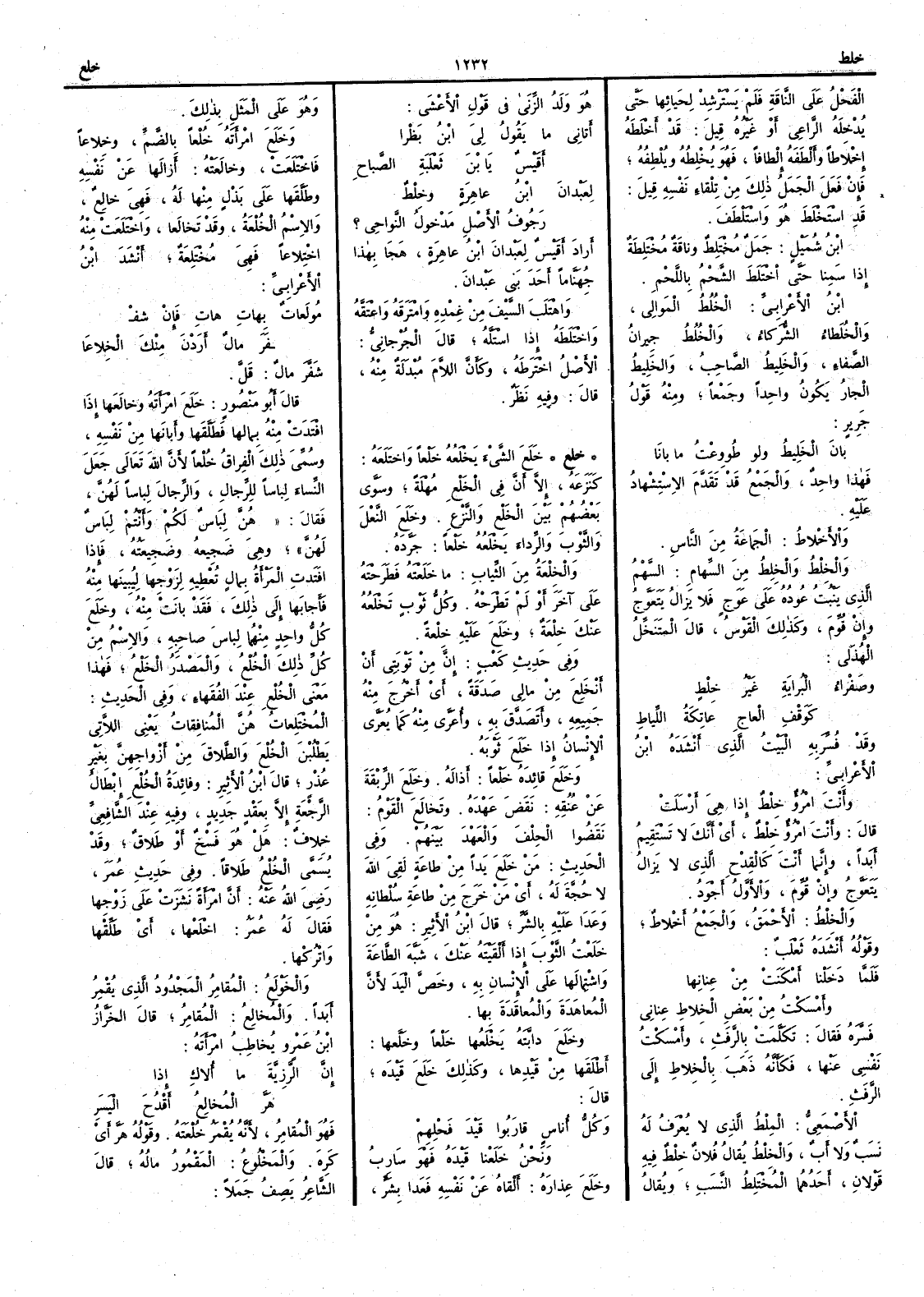 الفحلُ على الناقةِ فلم يَسْتَرْشِدْ لحَيائها حتى يُدخله الراعي أَو غيرُه قيل قد أَخْلطه إِخْلاطاً وأَلْطَفَه إِلْطافاً فهو يُخْلِطُه ويُلْطِفُه فإِن فعل الجمل ذلك من تلقاء نفسه قيل قد اسْتَخْلَطَ هو واسْتَلْطَفَ ابن شميل جمل مُختلِط وناقة مختلطة إِذا سَمِنا حتى اختلَط الشحم باللحم ابن الأَعرابي الخُلُط المَوالي والخُلَطاء الشركاء والخُلُطُ جِيران الصَّفا والخَلِيط الصاحِبُ والخَلِيطُ الجار يكون واحداً وجمعاً ومنه قول جرير بانَ الخَلِيطُ ولو طُووِعتُ ما بانا فهذا واحد والجمع قد تقدم الاستشهاد عليه والأَخْلاطُ الجماعة من الناس والخِلْطُ والخِلِطُ من السِّهام السهم الذي ينبُت عُودُه على عَوَج فلا يزال يتعوَّج وإِن قُوِّم وكذلك القوسُ قال المتنخل الهذلي وصفراءُ البُرايةِ غَيْر خِلْطٍ كوَقْفِ العاجِ عاتِكة اللياطِ وقد فُسِّر به البيتُ الذي أَنشده ابن الأَعرابي وأَنتَ امرؤٌ خِلْطٌ إِذا هي أَرسلت قال وأَنت امرؤ خِلْط أَي أَنك لا تستقيم أَبداً وإِنما أَنت كالقِدْح الذي لا يزال يَتعوَّج وإِن قُوِّم والأَوّل أَجود والخِلْط الأَحمق والجمع أَخْلاط وقوله أَنشده ثعلب فلمّا دخَلْنا أَمْكَنَتْ من عِنانِها وأَمْسَكْتُ من بعض الخِلاطِ عِناني فسره فقال تكلَمت بالرفَثِ وأَمسكْتُ نفسي عنها فكأَنه ذهب بالخلاط إِلى الرفَثِ الأَصمعي المِلْطُ الذي لا يُعْرَفُ له نسب ولا أَب والخِلْطُ يقال فلان خِلْطٌ فيه قولان أَحدُهما المُخَتَلِطُ النسَبِ ويقال هو والد الزِّنا في قول الأَعْشَى أَتاني ما يقولُ ليَ ابنُ بَظْرا أَقَيْسٌ يا ابنَ ثَعْلبة الصَّباحِ لِعَبْدانَ ابنُ عاهِرَةٍ وخِلْطٌ رَجوفُ الأَصلِ مَدْخولُ النَّواحي ؟ أَراد أَقَيْسٌ لِعَبْدانَ ابنُ عاهِرَةٍ هَجا بهذا جِهنّاماً أَحد بني عَبْدانَ واهْتَلَبَ السيفَ من غِمْده وامْتَرَقه واعْتَقَّه واخْتَلَطَه إِذا اسْتَلَّه قال الجرجاني الأَصل اخْتَرَطَه وكأَنَّ اللامَ مبدلة منه قال وفيه نظر