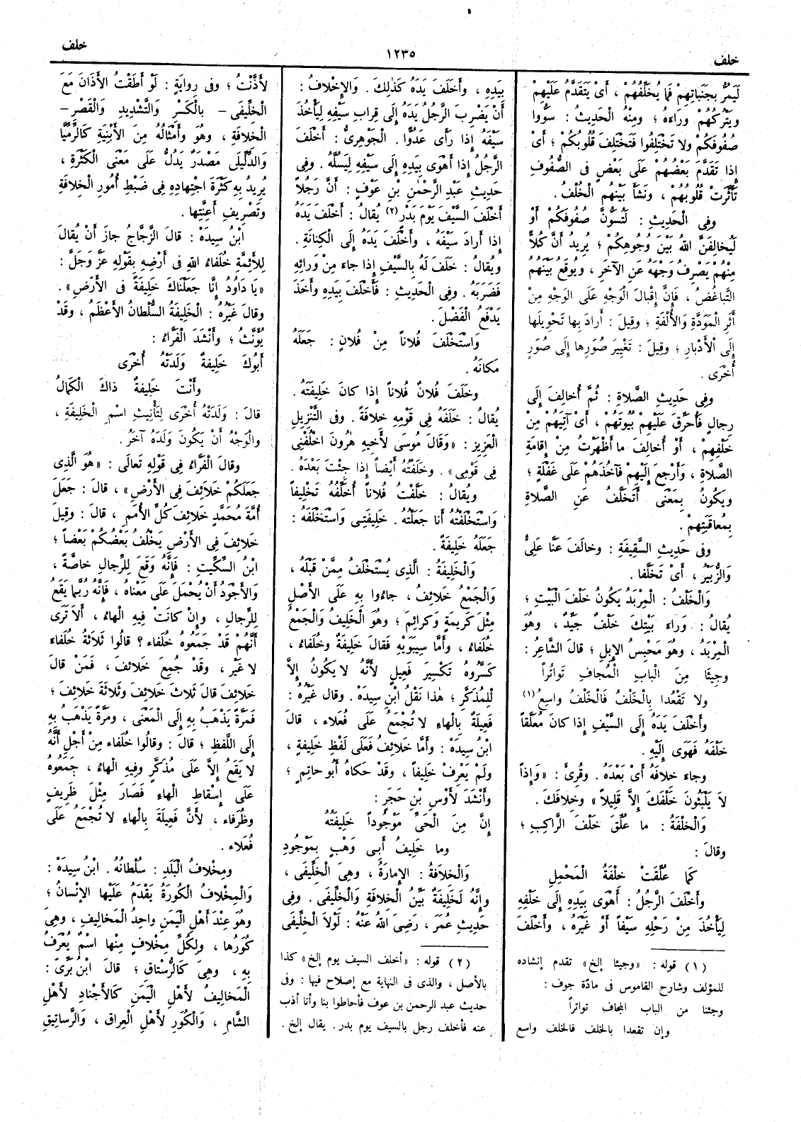 ( * قوله « اخلف السيف يوم إلخ » كذا بالأصل والذي في النهاية مع اصلاح فيها وفي حديث عبدالرحمن بن عوف فأحاطوا بنا وأنا أذب عنه فأخلف رجل بالسيف يوم بدر يقال إلخ ) يقال أَخْلَفَ يده إذا أَراد سيفه وأخْلفَ يدَه إلى الكنانةِ ويقال خَلَفَ له بالسيفِ إذا جاء من وَرائه فضرَبه وفي الحديث فأَخْلَفَ بيده وأَخذ يدفع الفَضْلَ واسْتَخْلَفَ فلاناً من فلان جعله مكانه وخَلَفَ فلان فلاناً إذا كان خَلِيفَتَه يقال خَلَفه في قومه خِلافةً وفي التنزيل العزيز وقال موسى لأَخِيه هرون اخْلُفْني في قَوْمي وخَلَفْتُه أَيضاً إذا جئت بعده ويقال خَلَّفْتُ فلاناً أُخَلِّفُه تَخْلِيفاً واسْتَخْلفْتُه أَنا جَعَلتُه خَليفَتي واسْتَخْلفه جعله خليفة والخَلِيفةُ الذي يُسْتخْلَفُ ممن قبله والجمع خلائف جاؤوا به على الأصل مثل كريمةٍ وكرائِمَ وهو الخَلِيفُ والجمع خُلَفاء وأَما سيبويه فقال خَلِيفةٌ وخُلَفاء كَسَّروه تكسير فَعِيلٍ لأَنه لا يكون إلا للمذكر هذا نقل ابن سيده وقال غيره فَعِيلة بالهاء لا تجمع على فُعَلاء قال ابن سيده وأَما خَلائِفُ فعلى لفظ خَلِيفةٍ ولم يعرف خليفاً وقد حكاه أَبو حاتم وأَنشد لأَوْس بن حَجَر إنَّ مِنَ الحيّ موجوداً خَلِيفَتُهُ وما خَلِيفُ أبي وَهْبٍ بمَوْجُودِ والخِلافةٌ الإمارةُ وهي الخِلِّيفَى وإنه لخَلِيفةٌ بَيِّنُ الخِلافةِ والخِلِّيفى وفي حديث عمر رضي الله عنه لولا الخِلِّيفَى لأَذَّنْتُ وفي رواية لو أَطَقْتُ الأَذَان مع الخِلّيفى بالكسر والتشديد والقَصْر الخِلافةِ وهو وأَمثاله من الأَبْنِيَةِ كالرِّمِّيَّا والدِّلِّيلَى مصدر يدل على معنى الكثرة يريد به كثرة اجتِهاده في ضَبْطِ أُمورِ الخِلافَةِ وتَصْرِيفِ أَعِنَّتِها ابن سيده قال الزجاج جاز أن يقال للأَئمة خُلفاء الله في أَرْضِه بقوله عز وجل يا داودُ إنَّا جَعَلْناك خَلِيفةً في الأرض وقال غيره الخَليفةُ السلطانُ الأَعظم وقد يؤنَّثُ وأَنشد الفراء أَبوكَ خَلِيفةٌ وَلَدَتْه أُخْرَى وأَنتَ خَليفةٌ ذاكَ الكَمالُ قال ولدته أُخْرَى لتأْنيث اسم الخليفة والوجه أَن يكون ولده آخَرُ وقال الفراء في قوله تعالى هو الذي جعلكم خلائِفَ في الأرض قال جعل أُمة محمد خَلائفَ كلِّ الأُمم قال وقيل خَلائفَ في الأرض يَخْلُفُ بعضكم بعضاً ابن السكيت فإنه وقَعَ للرجال خاصّة والأجْوَدُ أَن يُحْمَل على معناه فإنه ربما يقع للرجال وإن كانت فيه الهاء أَلا تَرَى أَنهم قد جمعوه خُلفاء ؟ قالوا ثلاثةُ خُلفاء لا غير وقد جُمعَ خَلائفَ فمن قال خلائفَ قال ثلاثَ خلائفَ وثلاثة خلائفَ فمرَّة يَذْهَب به إلى المعنى ومرَة يذهب به إلى اللفظ قال وقالوا خُلفاء من أَجل أَنه لا يقع إلا على مذكر وفيه الهاء جمعوه على إسقاط الهاء فصار مثل ظَرِيفٍ وظُرَفاء لأَن فَعِيلة بالهاء لا تُجمَعُ على فُعلاء ومِخْلافُ البلدِ سُلطانُه ابن سيده والمِخْلافُ الكُورةُ يَقْدَمُ عليها الإنسان وهو عند أَهل اليمن واحِدُ المَخالِيفُ وهي كُوَرُها ولكلِّ مِخْلافٍ منها اسم يعرف به وهي كالرُسْتاقِ قال ابن بري المَخالِيفُ لأَهل اليمن كالأَجْنادِ لأَهل الشامِ والكورِ لأَهل العِراقِ والرَّساتِيقِ