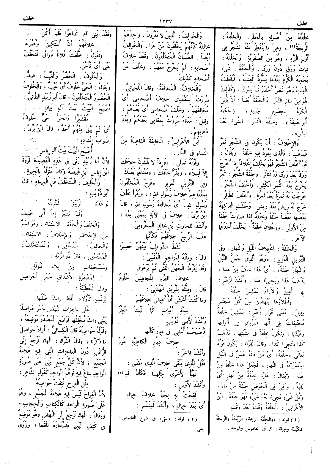 وأَنشد لأَوْس لَقِحَتْ به لِحَياً خِلافَ حِيالِ أَي بَعدَ حِيالِ وأَنشد لمُتَمِّم وفَقْدَ بَني آمٍ تَداعَوْا فلم أَكُنْ خِلافَهُمُ أَن أَسْتَكِينَ وأَضْرَعا وتقول خَلَّفْتُ فلاناً ورائي فَتَخَلَّفَ عني أَي تأَخَّر والخُلُوفُ الحُضَّرُ والغُيَّبُ ضِدٌّ ويقال الحيُّ خُلوفٌ أَي غُيَّبٌ والخُلوفُ الحُضُورُ المُتَخَلِّفُون قال أَبو زبيد لطائي أَصْبَحَ البَيْتُ بَيْتُ آلِ بَيانٍ مُقْشَعِرًّا والحيُّ حَيٌّ خُلوفُ أَي لم يَبْقَ منهم أَحد قال ابن بري صواب إنشاده أَصْبَحَ البيْتُ بَيْتُ آلِ إياسٍ لأَن أَبا زبيد رَثَى في هذه القصيدة فَرْوَة بن إياسِ ابن قَبيصةَ وكان منزله بالحيرة والخَلِيفُ المتَخَلِّفُ عن المِيعاد قال أَبو ذؤيب تَواعَدْنا الرُّبَيْقَ لنَنْزِلَنْهُ ولم تَشْعُرْ إذاً أَني خَلِيفُ والخَلْفُ والخِلْفةُ الاسْتِقاء وهو اسم من الإخْلافِ والإخْلافُ الاسْتِقاء والخالِفُ المُسْتَقِي والمُسْتَخْلِفُ المُسْتَسْقِي قال ذو الرمة ومُسْتَخْلِفاتٍ من بلادِ تَنُوفةٍ لِمُصْفَرَّةِ الأشْداقِ حُمْرِ الحَواصِلِ وقال الحطيئة لِزُغْبٍ كأَوْلادِ القَطا راثَ خَلْفُها على عاجِزاتِ النَّهْضِ حُمْرٍ حَواصلُهْ يعني راثَ مُخْلِفُها فوضَع المَصْدَرَ موضعه وقوله حواصِلُه قال الكسائي أَراد حواصل ما ذكرنا وقال الفراء الهاء ترجع إلى الزُّغْبِ دُون العاجِزاتِ التي فيه علامة الجمع لأَن كل جمع بُني على صورة الواحد ساغ فيه تَوَهُّم الواحد كقول الشاعر مِثْل الفِراخِ نُتِفَتْ حَواصِلُهْ لأَن الفراخ ليس فيه علامة الجمع وهو على صورة الواحد كالكِتاب والحِجاب ويقال الهاء ترجع إلى النَّهْضِ وهو موضع في كَتِف البعير فاستعاره للقطا وروى