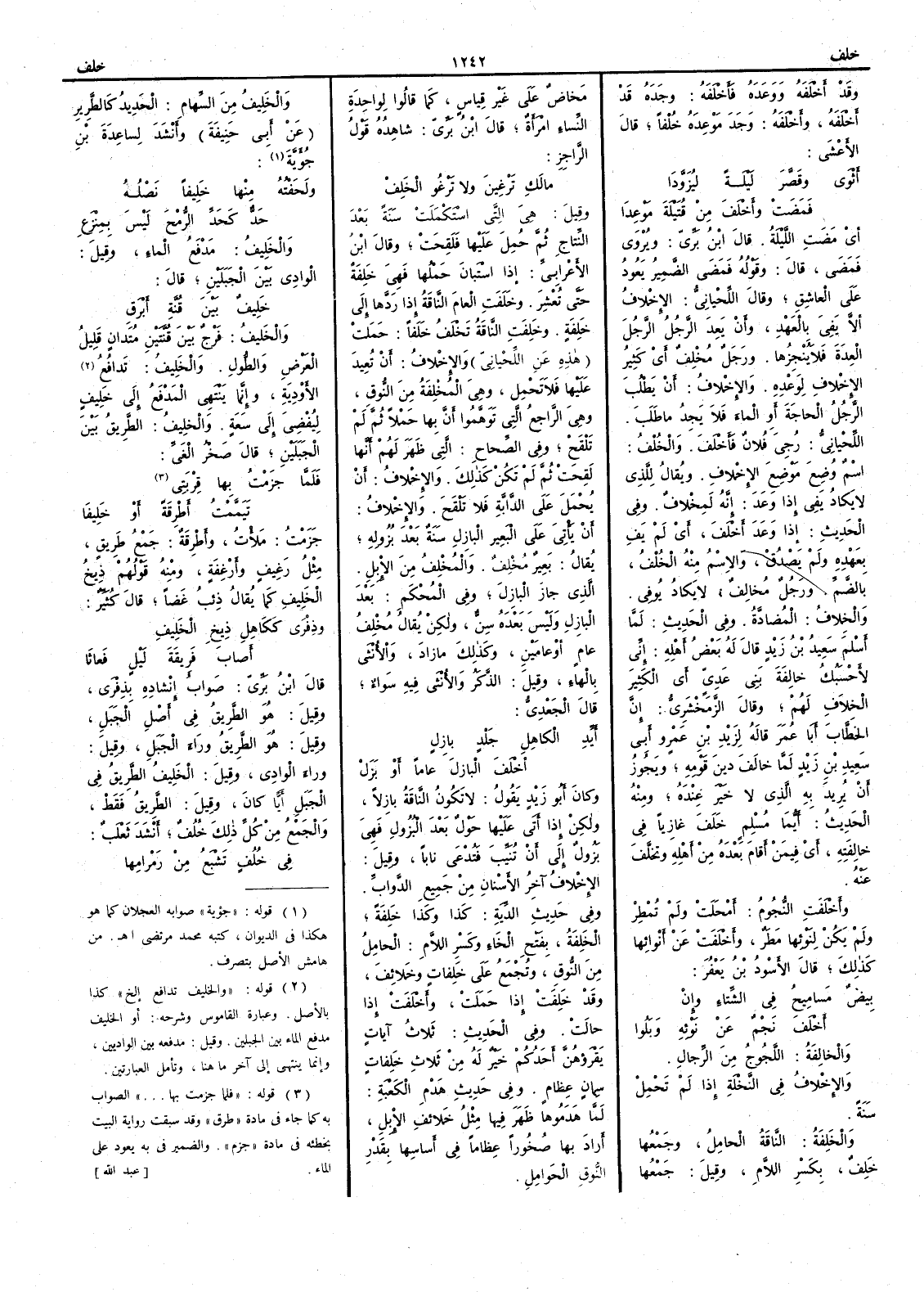 ( * قوله « والخليف تدافع إلخ » كذا بالأصل وعبارة القاموس وشرحه أو الخليف مدفع الماء بين الجبلين وقيل مدفعه بين الواديين وأنما ينتهي إلى آخر ما هنا وتأمل العبارتين ) الأَوْدية وإنما يَنتهي المَدْفَعُ إلى خَلِيفٍ ليُفْضِيَ إلى سَعَةٍ والخلِيفُ الطَّريقُ بين الجبلين قال صخر الغي فلما جَزَمْتُ بِها قِرْبَتي تَيَمَّمْتُ أَطْرِقةً أَو خَلِيفَا جَزَمتُ ملأْت وأَطْرقة جمع طَريق مثل رغيفٍ وأَرْغِفَةٍ ومنه قولهم ذِيخُ الخَلِيفِ كما يقال ذِئبُ غَضاً قال كثِّير وذِفْرَى ككاهِلِ ذِيخِ الخَلِيف أَصابَ فَرِيقَةَ لَيْلٍ فَعاثَا قال ابن بري صواب إنشاده بِذِفْرَى وقيل هو الطريق في أَصل الجبل وقيل هو الطريق وراء الجبل وقيل وراء الوادي وقيل الخَلِيفُ الطريق في الجبل أَيّاً كان وقيل الطريق فقط والجمع من كل ذلك خُلُفٌ أَنشد ثعلب في خُلُفٍ تَشْبَعُ مِنْ رَمْرامِها