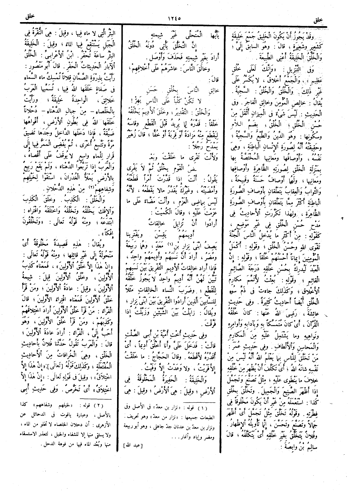 وقد يجوز أَن يكون الخَلِيقُ جمع خَلِيقة كشعير وشعيرة قال وهو السابِق إِليّ والخُلُق الخَلِيقة أَعني الطَّبِيعة وفي التنزيل وإِنك لَعلَى خُلُق عظيم والجمع أَخْلاق لا يُكسّر على غير ذلك والخُلْق والخُلُق السَّجِيّة يقال خالِصِ المُؤْمنَ وخالِقِ الفاجر وفي الحديث ليس شيء في الميزان أَثْقلَ من حُسن الخُلُق الخُلُقُ بضم اللام وسكونها وهو الدِّين والطبْع والسجية وحقيقته أَنه لِصورة الإِنسان الباطنة وهي نفْسه وأَوصافها ومعانيها المختصةُ بِها بمنزلة الخَلْق لصورته الظاهرة وأَوصافها ومعانيها ولهما أَوصاف حسَنة وقبيحة والثوابُ والعقاب يتعلّقان بأَوصاف الصورة الباطنة أَكثر مما يتعلقان بأَوصاف الصورة الظاهرة ولهذا تكرّرت الأَحاديث في مَدح حُسن الخلق في غير موضع كقوله مِن أَكثر ما يُدخل الناسَ الجنَّةَ تقوى الله وحُسْنُ الخلق وقولِه أَكملُ المؤْمنين إِيماناً أَحْسنُهم خلُقاً وقوله إِنَّ العبد ليُدرك بحُسن خُلقه درجةَ الصائم القائم وقوله بُعِثت لأُتَمِّم مَكارِم الأَخلاق وكذلك جاءت في ذمّ سوء الخلق أَيضاً أَحاديث كثيرة وفي حديث عائشة رضي الله عنها كان خُلُقه القرآنَ أَي كان متمسكاً به وبآدابه وأَوامره ونواهيه وما يشتمل عليه من المكارم والمحاسن والأَلطاف وفي حديث عمر من تخلَّق للناس بما يعلم الله أَنه ليس من نَفْسه شانَه الله أَي تكلَّف أَ يُظهر من خُلُقه خِلاف ما يَنطوِي عليه مثل تصَنَّعَ وتجَمَّل إِذا أَظهر الصَّنِيع والجميل وتَخلَّق بخلُق كذا استعمله من غير أَن يكون مخلوقاً في فِطْرته وقوله تخلَّق مثل تَجمَّل أَي أَظهر جَمالاً وتصنّع وتَحسَّن إِنَّما تأْوِيلُه الإِظْهار وفلان يَتخلَّق بغير خُلقه أَي يَتكلَّفه قال سالم بن وابِصةَ يا أَيُّها المُتحلِّي غيرَ شِيمَتِه إِن التَّخَلُّق يأْتي دُونه الخُلُقُ أَراد بغير شِيمته فحذف وأَوصَل وخالَقَ الناسَ عاشَرهم على أَخلاقِهم قال خالِقِ الناسَ بخُلْقٍ حَسَنٍ لا تَكُنْ كلْباً على الناسِ يَهِرّ والخَلْق التقدير وخلَق الأَدِيمَ يَخْلُقه خَلْقاً قدَّره لما يريد قبل القطع وقاسه ليقطع منه مَزادةً أَو قِربة أَو خُفّاً قال زهير يمدح رجلاً ولأَنتَ تَفْري ما خَلَقْتَ وبع ضُ القومِ يَخْلُقُ ثم لا يَفْري يقول أَنت إِذا قدَّرت أَمراً قطعته وأَمضيتَه وغيرُك يُقدِّر ما لا يَقطعه لأَنه ليس بماضي العَزْم وأَنتَ مَضّاء على ما عزمت عليه وقال الكميت أَرادُوا أَن تُزايِلَ خالِقاتٌ أَدِيمَهُمُ يَقِسْنَ ويَفْتَرِينا يصف ابني نِزار من مَعدّ وهما رَبِيعةُ ومُضَر أَراد أَن نسَبهم وأَدِيمهم واحد فإِذا أَراد خالقاتُ الأَديم التفْرِيقَ بين نسَبهم تبيَّن لهن أَنه أَديم واحد لا يجوز خَلْقُه للقطع وضرَب النساء الخالِقاتِ مثلاً للنسّابين الذين أَرادوا التفريق بين ابني نِزار ويقال زايَلْتُ بين الشيئين وزيَّلْتُ إِذا فَرَّقْت وفي حديث أُخت أُمَيَّةَ بن أَبي الصَّلْت قالت فدخَلَ عليَّ وأَنا أَخلُقُ أَدِيماً أَي أُقَدِّره لأَقْطَعه وقال الحجاج ما خَلَقْتُ إِلاَّ فَرَيْتُ ولا وَعَدْتُ إِلاَّ وَفَيْتُ والخَلِيقةُ الحَفِيرة المَخْلوقة في الأَرض وقيل هي الأَرض وقيل هي البئر التي لا ماءَ فيها وقيل هي النُّقْرة في الجبل يَسْتَنقِع فيها الماء وقيل الخليقة البئر ساعة تُحْفَر ابن الأَعرابي الخُلُق الآبارُ الحَدِيثاتُ الحَفْر قال أَبو منصور رأَيت بِذِرْوة الصَّمّان قِلاتاً تُمْسِك ماءَ السماء في صَفاةٍ خَلَقها الله فيها تسميها العرب خَلائقَ الواحدة خَلِيقةٌ ورأَيت بالخَلْصاء من جبال الدَّهْناء دُحْلاناً خلقها الله في بطون الأَرض أَفواهُها ضَيِّقَةٌ فإِذا دخلها الداخل وجدها تَضِيقُ مرة وتَتَّسِعُ أُخرى ثم يُفْضي المَمَرُّ فيها إِلى قَرار للماء واسع لا يوقف على أقْصاه والعرب إِذا تَرَبَّعوا الدهناء ولم يقع ربيع بالأَرضِ يَمْلأُ الغُدْرانَ استَقَوْا لخيلهم وشفاههم