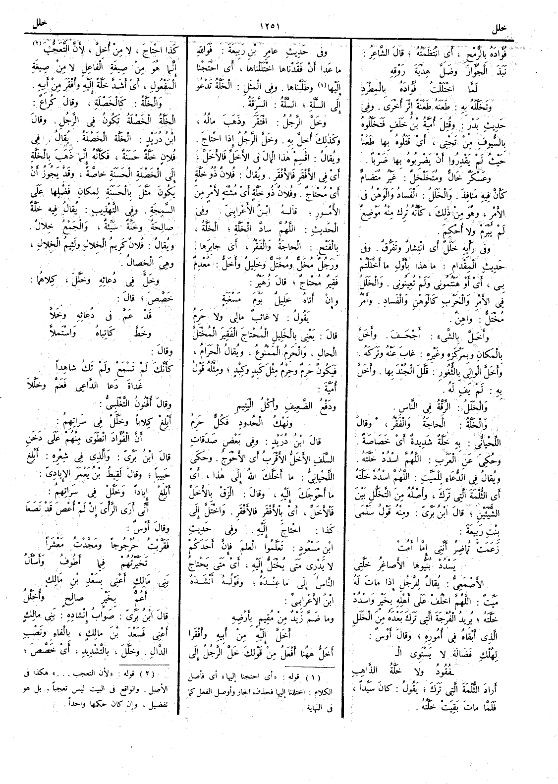 ( * قوله « أَي احتجنا إِليها » أَي فاصل الكلام اختللنا إِليها فحذف الجار وأوصل الفعل كما في النهاية ) وطلبناها وفي المثل الخَلَّة تدعو إِلى السَّلَّة السَّلَّة السرقة وخَلَّ الرجلُ افتقر وذهب مالُه وكذلك أُخِلَّ به وخَلَّ الرجلُ إِذا احتاج ويقال اقْسِمْ هذا المال في الأَخَلِّ أَي في الأَفقر فالأَفقر ويقال فلان ذو خَلَّة أَي محتاج وفلان ذو خَلَّة أَي مُشْتَهٍ لأَمر من الأُمور قاله ابن الأَعرابي وفي الحديث اللهم سادّ الخَلَّة الخَلَّة بالفتح الحاجة والفقر أَي جابرها ورجل مُخَلٌّ ومُخْتَلٌّ وخَلِيل وأَخَلُّ مُعْدِم فقير محتاج قال زهير وإِن أَتاه خَلِيلٌ يومَ مَسْغَبةٍ يقول لا غائبٌ مالي ولا حَرِمُ قال يعني بالخَلِيل المحتاج الفقير المُخْتَلَّ الحال والحَرِم الممنوع ويقال الحَرَام فيكون حَرِم وحِرْم مثل كَبِد وكِبْد ومثله قول أُمية ودَفْع الضعيف وأَكل اليتيم ونَهْك الحُدود فكلٌّ حَرِم قال ابن دريد وفي بعض صَدَقات السلف الأَخَلُّ الأَقرب أَي الأَحوج وحكى اللحياني ما أَخَلَّك الله إِلى هذا أَي ما أَحوجك إِليه وقال الْزَقْ بالأَخَلِّ فالأَخَلِّ أَي بالأَفقر فالأَفقر واخْتَلَّ إِلى كذا احتاج إِليه وفي حديث ابن مسعود تَعَلَّموا العلم فإِن أَحدكم لا يَدْري متى يُخْتَلُّ إِليه أَي متى يحتاج الناس إِلى ما عنده وقوله أَنشده ابن الأَعرابي وما ضَمَّ زيدٌ من مُقيم بأَرضه أَخَلَّ إِليه من أَبيه وأَفقرا أَخَلُّ ههنا أَفْعَل من قولك خَلَّ الرجلُ إِلى كذا احتاج لا من أُخِلَّ لأَن التعجب إِنما هو من صيغة الفاعل لا من صيغة المفعول أَي أَشد خَلَّة إِليه وأَفقر من أَبيه والخَلَّة كالخَصْلة وقال كراع الخَلَّة الخصلة تكون في الرجل وقال ابن دريد الخَلَّة الخصلة يقال في فلان خَلَّة حسنة فكأَنه إِنما ذهب بالخَلَّة إِلى الخصلة الحسنة خاصة وقد يجوز أَن يكون مَثَّل بالحسنة لمكان فضلها على السَّمِجة وفي التهذيب يقال فيه خَلَّة صالحة وخَلَّة سيئة والجمعِ خلال ويقال فلان كريم الخِلال ولئيم الخِلال وهي الخِصال وخَلَّ في دعائه وخَلَّل كلاهما خَصَّص قال قد عَمَّ في دعائه وخَلاًّ وخَطَّ كاتِباه واسْتَمَلاًّ وقال كأَنَّك لم تَسمع ولم تكُ شاهداً غداةَ دعا الداعي فعمَّ وخَلَّلا وقال أُفْنون التَّغْلَبي أَبلغْ كِلاباً وخَلِّلْ في سَراتهم أَنَّ الفؤاد انطوى منهم على دَخَن قال ابن بري والذي في شعره أَبلغ حبيباً وقال لَقِيط بن يَعْمَر الإِيادي أَبلغ إِياداً وخَلِّلْ في سَراتم أَني أَرى الرأْيَ إِن لم أُعْصَ قد نَصَعا وقال أَوس فقَرَّبتُ حُرْجُوجاً ومَجَّدتُ مَعْشَراً تَخَيَّرتهم فيما أَطوفُ وأَسأَلُ بَني مالك أَعْني بسَعد بن مالك أَعُمُّ بخير صالحٍ وأُخَلِّل قال ابن بري صواب إِنشاده بني مالك أَعْني فسعدَ ابن مالك بالفاء ونصب الدال وخلَّل بالتشديد أَي خَصَّص
