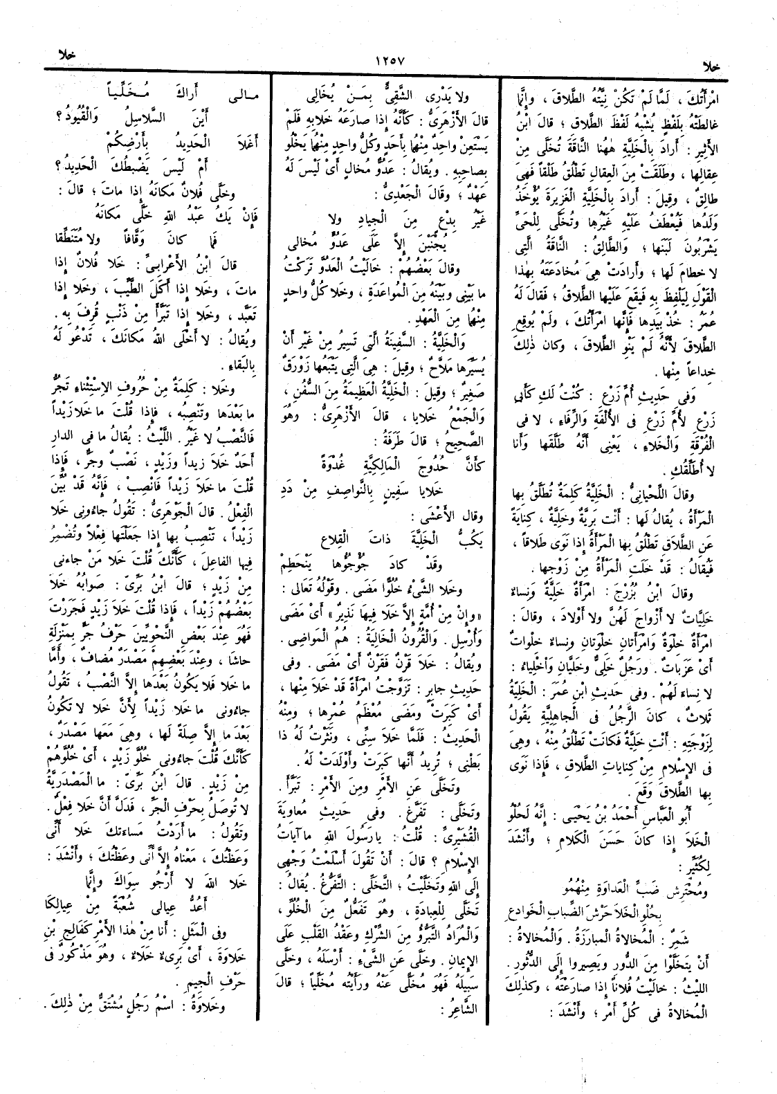 لمَّا لم تكن نيتُه الطلاقَ وإِنما غالَطَتْه بلفظ يُشْبِه لفظ الطلاق قال ابن الأَثير أَراد بالخلية ههنا الناقة تُخَلَّى من عِقالها وطَلَقَت من العِقال تَطْلُقُ طَلْقاً فهي طالق وقيل أَراد بالخلية الغزيرةَ يؤْخذ ولدها فيُعطَفُ عليه غيرُها وتُخَلَّى للحَيِّ يشربون لبنها والطالِقُ الناقة التي لا خِطَام لها وأَرادت هي مُخادَعَته بهذا القول ليَلْفِظ به فيقَعَ عليها الطلاقُ فقال له عُمر خُذْ بيدها فإِنها امرأَتك ولم يوقع الطلاق لأَنه لم يَنْوِ الطلاقَ وكان ذلك خِداعاً منها وفي حديث أُمّ زَرْع كنتُ لكِ كأَبي زَرْع لأُم زَرْع في الأُلْفَة والرِّفاء لا في الفُرْقة والخَلاء يعني أَنه طَلَّقها وأَنا لا أُطَلِّقك وقال اللحياني الخلِيَّةُ كلمة تُطَلَّقُ بها المرأَة يقال لها أَنتِ بَرِيَّة وخَلِيَّة كنايةً عن الطلاق تَطْلُق بها المرأَة إِذا نوَى طلاقاً فيقال قد خَلَت المرأَةُ من زوجها وقال ابن بُزُرْج امرأَة خَلِيَّةٌ ونساءٌ خَلِيَّاتٌ لا أَزواج لهُنَّ ولا أَولادَ وقال امرأَةٌ خِلْوةٌ وامرأَتان خِلْوَتان ونساء خِلْواتٌ أَي عَزَبات ورجل خَلِيٌّ وخَلِيّانِ وأَخْلِياءُ لا نساءَ لهم وفي حديث ابن عمر الخَلِيَّة ثلاث كان الرجل في الجاهلية يقول لزوجته أَنتِ خَلِيَّة فكانت تَطْلُق منه وهي في الإِسلام من كِنايات الطلاق فإِذا نوى بها الطلاق وقع أَبو العباس أَحمد بن يحيى إِنه لَحُلْوُ الخَلا إِذا كان حسَنَ الكلام وأَنشد لكثير ومُحْتَرِشٍ ضَبَّ العَداوة مِنْهُمُو بحُلْوِ الخَلا حَرْشَ الضِّبابِ الخَوادعِ شمر المُخالاةُ المبارَزَةُ والمُخالاةُ أَن يَتخلَّوْا من الدُّورِ ويَصيروا إِلى الدُّثُورِ الليث خالَيْت فلاناً إِذا صارَعْته وكذلك المُخالاةُ في كلِّ أَمرٍ وأَنشد ولا يَدْرِي الشَّقِيُّ بمَنْ يُخالي قال الأَزهري كأَنه إِذا صارعه خَلا به فلم يَسْتَعِنْ واحد منهما بأَحَدٍ وكل واحد منهما يَخْلُو بصاحبه ويقال عَدُوٌّ مُخالٍ أَي ليس له عَهْد وقال الجعدي غَيْرُ بِدْعٍ منَ الجِيادِ ولا يُجْ نَبْنَ إِلاَّ على عَدُوٍّ مُخالي وقال بعضهم خَالَيْت العَدُوَّ تركت ما بَيْني وبينه من المُواعَدة وخلا كلُّ واحدٍ منهما من العَهْد والخَلِيَّة السَّفِينة التي تَسير من غير أَن يُسَيِّرَها مَلاَّح وقيل هي التي يتبعها زَوْرَق صغير وقيل الخَليَّة العظيمة من السُّفُن والجمع خَلايا قال الأَزهري وهو الصحيح قال طرفة كأَنَّ حُدُوجَ المَالِكِيَّة غُدْوَةً خَلايا سَفِين بالنَّواصِفِ مِنْ دَدِ وقال الأَعشى يَكُبُّ الخَلِيَّةَ ذاتَ القِلاع وقَدْ كادَ جُؤْجُؤُها يَنْحَطِمْ وخلا الشيءُ خُلُوّاً مَضَى وقوله تعالى وإِنْ من أُمَّةٍ إِلاَّ خَلا فيها نَذِيرٌ أَي مضى وأُرْسِل والقُرون الخالِية هُم المَواضي ويقال خَلا قَرْنٌ فَقَرْنٌ أَي مَضى وفي حديث جابر تَزَوَّجْت امرأَةً قَدْ خَلا منها أَي كَبِرَتْ ومَضى مُعْظَم عُمْرِها ومنه الحديث فلمَّا خَلا سِنِّي ونَثَرْتُ له ذا بَطْني أَنها كَبِرَت وأَولَدت له وتَخَلَّى عن الأَمر ومن الأَمر تَبَرَّأَ وتَخَلَّى تَفَرَّغ وفي حديث مُعاوية القُشَيْرِي قلت يا رسول الله ما آياتُ الإِسلامِ ؟ قال أَن تقول أَسْلَمْتُ وجْهِي إِلى الله وتَخَلَّيْتُ التَّخَلِّي التفَرُّغُ يقال تَخَلَّى للعبادة وهو تَفَعُّلٌ من الخُلُوّ والمراد التَّبَرُّؤُ من الشرْكِ وعقْدُ القَلْبِ على الإِيمان وخَلَّى عن الشيء أَرْسَلَه وخَلَّى سبيلَه فهو مُخَلّىً عنه ورأَيته مُخَلِّياً قال الشاعر ما لي أَراك مُخَلِّياً أَيْنَ السلاسِلُ والقُيُود ؟ أَغَلا الحدِيدُ بأَرْضِكُمْ أَمْ ليسَ يَضْبِطُكَ الحدِيد ؟ وخَلَّى فلانٌ مكانَه إِذا مات قال فإِنْ يكُ عبدُ الله خَلَّى مكانَه فما كان وقَّافاً ولا مُتَنَطِّقا قال ابن الأَعرابي خَلا فلانٌ إِذا ماتَ وخلا إِذا أَكل الطَّيِّبَ وخلا إِذا تعيَّد وخلا إِذا تَبَرَّأَ من ذنب قُرِفَ به ويقال لا أَخْلى اللهُ مكانَك تدعو له 