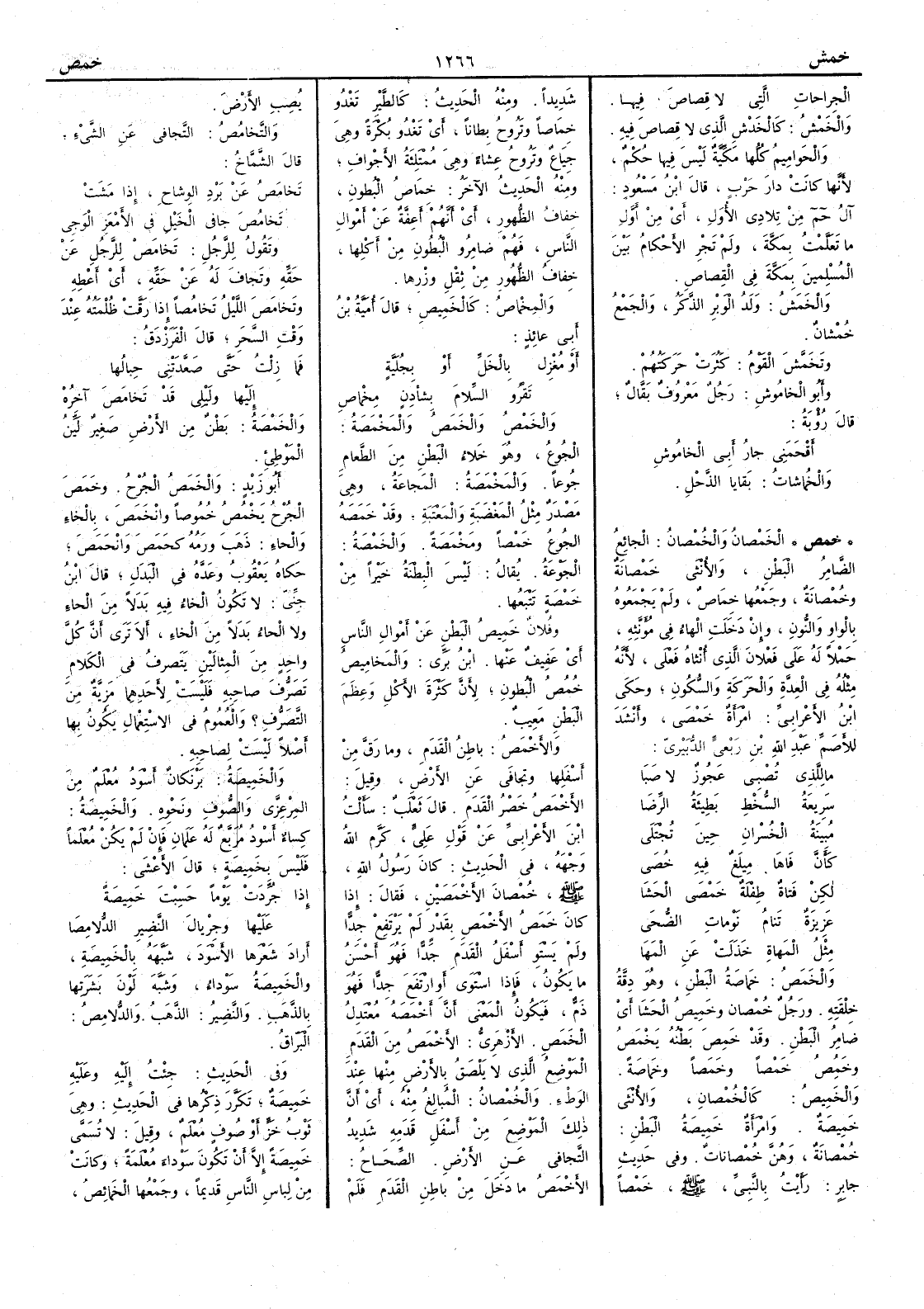 ( خمص ) الخَمْصانُ والخُمْصانُ الجائعُ الضامرُ البطنِ والأُنثى خَمْصانةٌ وخُمْصانةٌ وجَمْعُها خِمَاصٌ ولم يجمعوه بالواو والنون وإِن دخلَت الهاءُ في مؤنثه حملاً له على فَعْلان الذي أُثناه فَعْلى لأَنه مثله في العِدّة والحركة والسكون وحكى ابن الأَعرابي امرأَة خَمْصى وأَنشد للأَصم عبد اللّه بن رِبْعِيٍّ الدُّبَيْري ما لِلّذي تُصْبي عجوزٌ لا صَبا سَريعةُ السُّخْطِ بَطِيئةُ الرِّضا مُبِينةُ الخُسْرانِ حينَ تُجْتَلى كأَن فاها مِيلغٌ فيه خُصى لكنْ فَتاةٌ طفْلة خَمْصى الحَشا عَزِيزةٌ تَنام نَوْماتِ الضُّحى مثلُ المَهاةِ خَذَلَت عن المَها والخَمَصُ خَماصةُ البطن وهو دِقّةُ خِلْقتِه ورجل خُمْصان وخَمِيصُ الحَشا أَي ضامر البطن وقد خَمِصَ بطنُه يَخْمَصُ وخَمُصَ وخَمِصَ خَمْصاً وخَمَصاً وخَماصة والخَميص كالخُمْصانِ والأُنثى خَميصة وامرأَة خَمِيصةُ البطن خُمْصانةٌ وهُنّ خُمْصاناتٌ وفي حديث جابر رأَيت بالنبي صلّى اللّه عليه وسلّم خَمْصاً شديداً ومنه الحديث كالطير تَغْدُو خِمَاصاً وتَرُوحُ بِطاناً أَي تَغْدو بُكْرةً وهي جِيَاعٌ وتروح عِشاءً وهي مُمْتَلِئةُ الأَجوافِ ومنه الحديث الآخر خِمَاصُ البُطونِ خِفاف الظهور أَي أَنهم أَعِفَّةٌ عن أَموال الناس فهم ضامرو البطون من أَكلها خِفافُ الظهورِ من ثِقلِ وِزْرِها والمِخْماصُ كالخَمِيص قال أُمية بن أَبي عائذ أَو مُغْزِل بالخَلِّ أَو بجُلَيَّةٍ تَقْرُو السِّلام بِشادِنٍ مِخْماصِ والخَمْصُ والخَمَصُ والمَخْمَصَة الجوع وهو خَلاء البطن من الطعام جوعاً والمَخْمَصة المَجاعةُ وهي مصدرٌ مثل المَغْضَبَةِ والمَعْتَبةِ وقد خَمَصه الجوعُ خَمْصاً ومَخْمَصةً والخَمْصةُ الجَوْعة يُقال ليس البِطْنةُ خيراً من خَمْصةٍ تتبعها وفلان خَمِيصُ البطنِ عن أَموال الناس أَي عَفِيفٌ عنها ابن بري والمَخامِيصُ خُمُصُ البطونِ لأَن كثرةَ الأَكل وعِظَمَ البطنِ مَعِيبٌ والأَخْمَصُ باطنُ القَدَم وما رَقَّ من أَسْفلها وتجافى عن الأَرض وقيل الأَخْمَصُ خَصْرُ القدم قال ثعلب سأَلت ابن الأَعرابي عن قول عليّ كرم اللّه وجهه في الحديث كان رسولُ اللّه صلّى اللّه عليه وسلّم خُمْصانَ الأَخْمَصَين فقال إِذا كان خَمَصُ الأَخْمَصِ بِقَدْرٍ لم يرتفِع جدّاً ولم يستوِ أَسْفلُ القدمِ جِدّاً فهو أَحسنُ ما يكون فإِذا استوى أَو ارتفع جدّاً فهو ذمّ فيكون المعنى أَن أَخْمَصَه مُعْتدل الخَمَصِ الأَزهري الأَخْمَصُ من القدم الموضع الذي لا يَلْصَقُ بالأَرض منها عند الوطءِ والخُمْصانُ المبالِغُ منه أَي أَن ذلك الموضع من أَسْفلِ قدَمِه شديدُ التجافي عن الأَرض الصحاح الأَخْمَصُ ما دخل من باطن القدم فلم يُصِب الأَرض والتَّخامُصُ التجافي عن الشيء قال الشماخ تَخامَصُ عن بَرْدِ الوِشاحِ إِذا مَشَتْ تَخامُصَ جافي الخيلِ في الأَمْعَزِ الوَجِي وتقول للرجل تَخامَصْ للرجُلِ عن حَقِّه وتَجافَ له عن حَقِّه أَي أَعْطِه وتَخامَصَ الليلُ تَخامُصاً إِذا رَقَّتْ ظُلْمتُه عند وقت السحَر قال الفرزدق فما زِلْتُ حتى صعَّدَتْني حِبالُها إِليها ولَيْلي قد تَخامَصَ آخرُهْ والخَمْصةُ بَطْنٌ من الأَرض صغيرٌ لَيّنُ المَوْطِئِ أَبو زيد والخَمَصُ الجُرْحُ وخَمَصَ الجُرْحُ يَخْمُصُ خُموصاً وانْخَمَصَ بالخاء والحاء ذهب ورَمُه كحَمَصَ وانْحَمَصَ حكاه يعقوب وعدّه في البدل قال ابن جني لا تكون الخاء فيه بدلاً من الحاء ولا الحاء بدلاً من الخاء أَلا ترى أَن كل واحد من المثالين يتصرف في الكلام تصرُّفَ صاحبِه فليست لأَحدهما مَزِيَّةٌ من التصرُّف ؟ والعموم في الاستعمال يكون بها أَصلاً ليست لصاحبه والخَمِيصةُ بَرْنَكانٌ أَسْوَدُ مُعْلَم من المِرْعِزَّى والصُّوفِ ونحوه والخَمِيصةُ كساء أَسْودُ مُرَبَّع له عَلَمانِ فإِن لم يكن مُعْلماً فليس بخميصة قال الأَعشى إِذا جُرِّدَتْ يوماً حَسِبْتَ خَمِيصةً عليها وجِرْيالَ النَّضِيرِ الدُّلامِصَا أَراد شعرها الأَسود شَبَّه