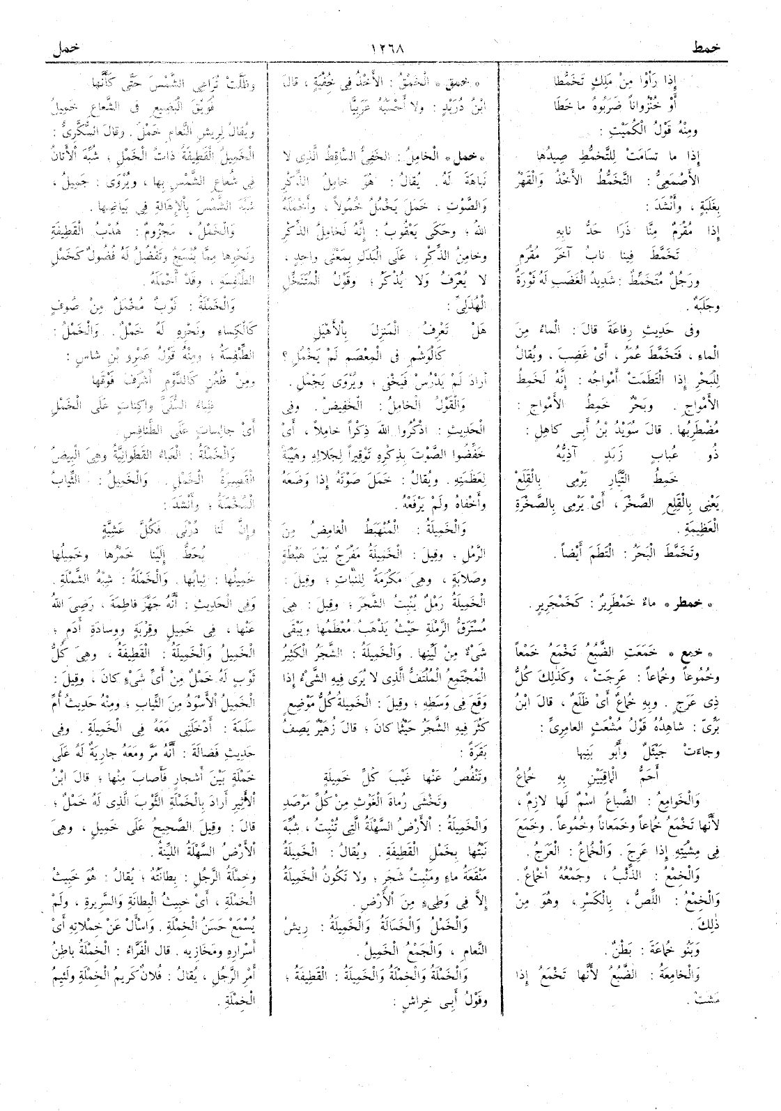 ( خمل ) الخامِل الخَفِيُّ الساقط الذي لا نَباهة له يقال هو خامل الذِّكْرِ والصوتِ خَمَل يَخْمُل خُمولاً وأَخْمَله الله وحكى يعقوب إِنَّه لَخامِل الذِّكر وخامِنُ الذِّكْرِ على البدل بمعنى واحد لا يُعْرَف ولا يُذْكَر وقول المتنخل الهذلي هل تَعْرِف المنزل بالأَهْيَل كالوَشْم في المِعْصَم لم يَخْمُل ؟ أَراد لم يَدْرُس فيخفى ويروى يجمل والقول الخامل الخَفِيض وفي الحديث اذكروا الله ذكراً خاملاً أَي خَفِّضوا الصوت بذكره توقيراً لجلاله وهيبة لعظمته ويقال خَمَل صوتَه إِذا وضعه وأَخفاه ولم يرفعه والخَمِيلة المُنْهَبَط الغامض من الرّمْل وقيل الخَمِيلة مَفْرَج بين هَبْطة وصلابة وهي مَكْرَمة للنبات وقيل الخَمِيلة رمل ينبت الشجر وقيل هي مُسْتَرَقُّ الرَّمْلة حيث يذهب مُعْظَمها ويبقى شيء من لَيِّنها والخَمِيلة الشجر الكثير المجتمع الملتفُّ الذي لا يرى فيه الشيء إِذا وقع في وَسَطه وقيل الخَمِيلة كل موضع كثر فيه الشجر حيثما كان قال زهير يصف بقرة وتَنْفُض عنها غَيْبَ كل خَمِيلة وتَخْشَى رُماةَ الغوث من كل مَرْصَد والخَمِيلة الأَرض السَّهْلة التي تُنْبِت شُبِّه نَبْتها بخَمْل القَطِيفة ويقال الخَمِيلة مَنْقَعة ماء ومَنْبِت شجر ولا تكون الخَمِيلة إِلا في وَطِيءٍ من الأَرض والخَمْل والخَمَالة والخَمِيلة ريش النَّعام والجمع الخَمِيل والخَمْلة والخِمْلة والخَمِيلة القَطِيفة وقول أَبي خراش وظَلَّت تُرَاعِي الشمسَ حتى كأَنها فُوَيْقَ البَضِيع في الشُّعاع خَمِيل ويقال لريش النَّعام خَمْل وقال السكري الخَمِيل القَطِيفة ذات الخَمْل شبه الأَتان في شعاع الشمس بها ويروى جَمِيل شَبَّه الشمس بالإِهَالةِ في بياضها والخَمْل مجزوم هُدْب القطيفة ونحوها مما ينسج وتَفْضُل له فضول كخَمْل الطِّنْفِسة وقد أَخمله والخَمْلة ثوب مُخْمَل من صوف كالكساء ونحوه له خَمْل والخَمْل الطِّنْفِسة ومنه قول عمرو ابن شاس ومن ظُعُن كالدَّوْم أَشرف فوقها ظِباءُ السُّلَيِّ واكناتٍ على الخَمْل أَي جالسات على الطنافس والخَمْلة العَباءُ القَطَوانيَّة وهي البِيض القصيرةُ الخَمْل والخَمِيل الثِّياب المُخْمَلة وأَنشد وإِنَّ لنا دُرْنَى فكُلَّ عَشيَّة يُحَطُّ إِلينا خَمْرُها وخَمِيلُها خَمِيلها ثيابُها والخَمْلة شبه الشَّمْلة وفي الحديث أَنه جَهَّز فاطمة رضي الله عنها في خَمِيل وقِرْبة ووِسادة أَدَم الخَمِيل والخَمِيلة القَطِيفة وهي كل ثوب له خَمْل من أَيّ شيء كان وقيل الخمِيل الأَسود من الثياب ومنه حديث أُم سلمة أَدخلني معه في الخَمِيلة وفي حديث فَضالة أَنه مَرَّ ومعه جارية على خَمْلة بين أَشجار فأَصاب منها قال ابن الأَثير أَراد بالخَمْلة الثوب الذي له خَمْل قال وقيل الصحيح على خَمِيل وهي الأَرض السهلة اللينة وخِمْلةُ الرجل بِطانتُه يقال هو خَبِيث الخِمْلة أَي خبيث البطانة والسريرة ولم يُسمع حَسَن الخِمْلة واسأَلْ عن خِمْلاته أَي أَسراره ومَخازيه قال الفراء الخِمْلة باطن أَمر الرجل يقال فلان كريم الخِمْلة ولئيم الخِمْلة