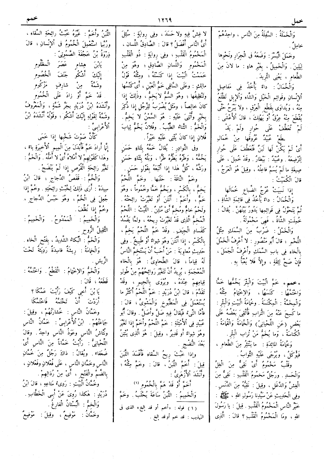 ( خمم ) خَمَّ البيتَ والبئرَ يَخُمُّهما خَمّاً واخْتَمَّهما كنسهما والاخْتِمامُ مثله والمِخَمَّةُ المِكنسَةُ وخُمامَةُ البيتِ والبئر ما كُسِحَ عنه من التراب فأُلقِيَ بعضُه على بعضٍ عن اللحياني والخُمامَةُ والقُمامَةُ الكُناسةُ وما يُخَمُّ من تراب البئر وخُمامةُ المائدة ما يَنْتَثِرُ من الطعام فيؤكل ويُرْجَى عليه الثواب وقلب مَخْمومٌ أَي نَقِيٌّ من الغِلِّ والحسد ورجل مَخمُومُ القلب نَقِيٌّ من الغش والدَّغَلِ وقيل نَقِيُّهُ من الدنس وفي الحديث عن سيدنا رسول الله صلى الله عليه وسلم خير الناس المَخْمومُ القلب قيل يا رسول الله وما المَخْمُومُ القلب ؟ قال الذي لا غش فيه ولا حسد وفي رواية سُئِلَ أَيُّ الناسِ أَفضلُ ؟ قال الصادقُ اللسانِ المَخْمومُ القلب وفي رواية ذو القلب المَخْمومِ واللسان الصادق وهو من خَمَمْتُ البيت إذا كنسته ومثله قول مالك وعلى السَّاقي خَمُّ العين أَي كنسها وتنظيفها وهو السُّمُّ لا يَخِمُّ وذلك إذا كان خالصاً ومَثَلٌ يُضْرَبُ للرجل إذا ذُكِرَ بخير وأثْنِيَ عليه هو السَّمْنُ لا يَخِمُّ والخَمُّ الثناء الطيب وفلان يَخُمُّ ثياب فلان إذا كان يُثْنِي عليه خيراً وفي النوادر يقال خَمَّه بِثَناءٍ حسَنٍ يَخُمُّه وطَرَّهُ يَطُرُّه طَرّاً وبَلَّه بثناء حسن ورَشَّه كلُّ هذا إذا أَتبعه بقول حسن وخَمَّ الناقةَ حلبها وخَمَّ اللحمُ يَخِمُّ بالكسر ويَخُمُّ خَمّاً وخُموماً وهو خَمٌّ وأَخَمَّ أَنتن أَو تغيرت رائتحته ولحم خامٌّ ومُخِمٌّأَي منتن الليث اللحم المُخِمُّ الذي قد تغير ريحه ولما يفسدْ كفساد الجِيَفِ وقد خَمَّ اللحمُ يَخِمُّ بالكسر إذا أَنتن وهو شِواءٌ أَو طبيخ وفي حديث معاوية من أَحب أَن يَسْتَخِمَّ الناسُ له قياماً قال الطحاوي هو بالخاء المعجمة يريد أَن تتغير روائحهم من طول قيامهم عنده ويروى بالجيم وقد تقدم قال ابن دريد خَمَّ اللحمُ أكثر ما يستعمل في المطبوخ والمَشْويّ قال فأَما النِّيءُ فيقال فيه صَلَّ وأَصَلَّ وقال أَبو عبيد في الأَمثلة خَمَّ اللحمُ وأَخَمَّ إذا تغير وهو شواءٌ أَو قَديرٌ وقيل هو الذي يُنْتِنُ بعد النُّضْج وإذا خَبُثَ ريحُ السِّقاء فأَفسد اللبنَ قيل أَخَمَّ اللبنُ قال وخَمَّ مثله وأَنشد الأَزهري أَخَمَّ أَو قد هَمَّ بالخُمُوم