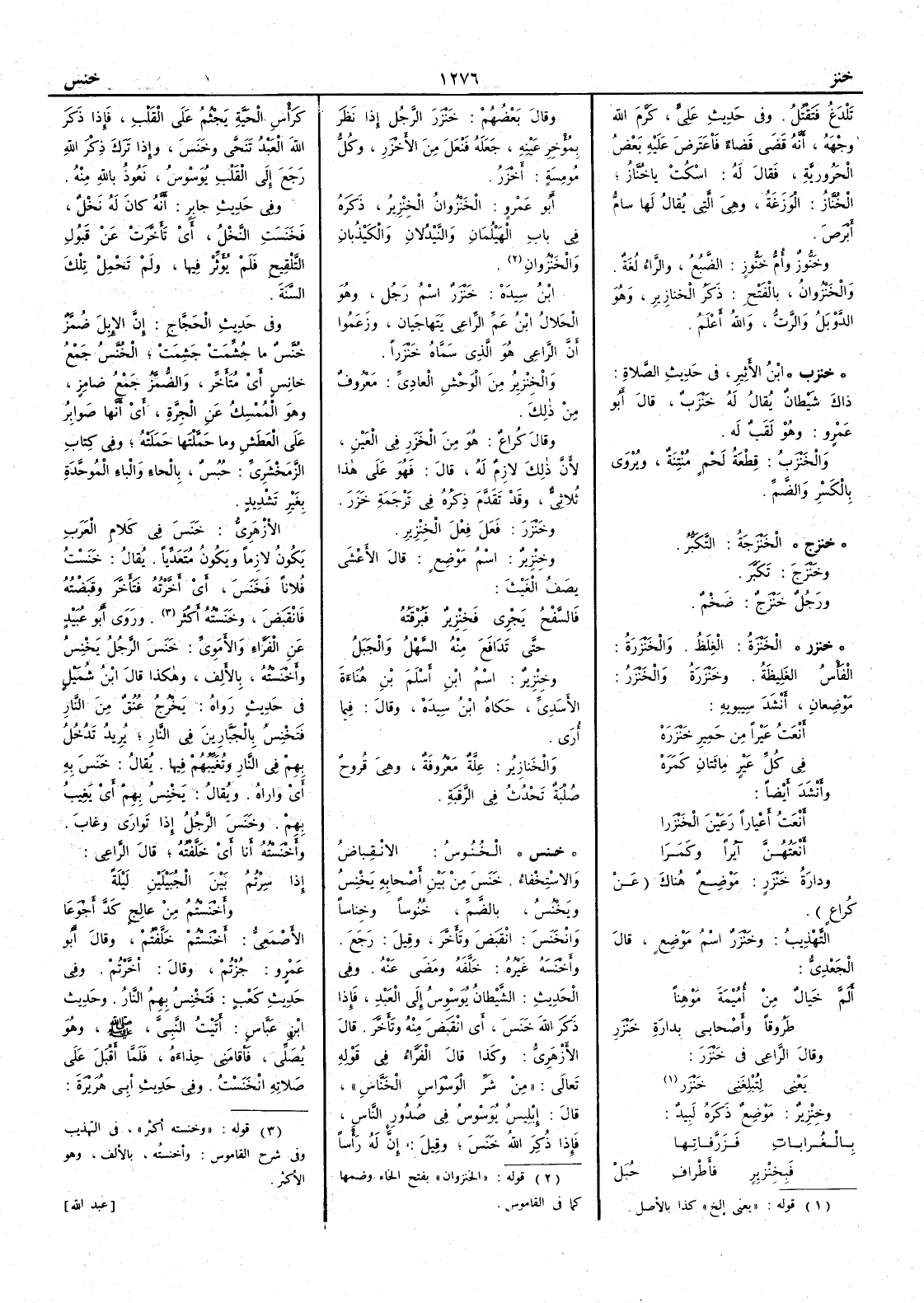 ( خنس ) الخُنُوس الانقباضُ والاستخفاء خَنَسَ من بين أَصحابه يَخْنِسُ ويَخْنُسُ بالضم خُنُوساً وخِناساً وانْخَنَس انقبض وتأَخر وقيل رجع وأَخْنَسَه غيره خَلَّفَه ومَضَى عنه وفي الحديث الشيطان يُوَسْوِسُ إِلى العبد فإِذا ذكَرَ اللَّه خَنَسَ أَي انقبض منه وتأَخر قال الأَزهري وكذا قال الفراء في قوله تعالى من شر الوسواس الخناس قال إِبليس يوسوس في صدور الناس فإِذا ذكر اللَّه خَنَسَ وقيل إِن له رأْساً كرأْس الحية يَجْثُمُ على القلب فإِذا ذكر اللَّه العبد تنحى وخنَسَ وإِذا ترك ذكر اللَّه رجع إِلى القلب يوسوس نعوذ باللَّه منه وفي حديث جابر أَنه كان له نخل فَخَنَسَت النخلُ أَي تأَخرت عن قبول التلقيح فلم يؤثر فيها ولم تحمل تلك السنة وفي حديث الحجاج إن الإِبل ضُمَّزٌ خُنَّسٌ ما جُشِّمَتْ جَشِمَتْ الخُنَّسُ جمع خانس أَي متأَخر والضُمَّزٌ جمع ضامز وهو الممسك عن الجِرَّة أَي أَنها صوابر على العطش وما حَمَّلْتَها حَمَلَتْه وفي كتاب الزمخشري حُبُسٌ بالحاء والباء الموحدة بغير تشديد الأَزهري خَنَسَ في كلام العرب يكون لازماً ويكون متعدياً يقال خَنَسْتُ فلاناً فَخَنَسَ أَي أَخرته فتأَخر وقبضته فانقبض وخَنَسْته أَكثر وروى أَبو عبيد عن الفراء والأُمَوِيِّ خَنَسَ الرجل يَخْنِسُ وأَخْنَسْتُه بالأَلف وهكذا قال ابن شميل في حديث رواه يخرج عُنُقٌ من النار فَتَخْنِسُ بالجبارين في النار يريد تدخل بهم في النار وتغيبهم فيها يقال خَنَسَ به أَي واراه ويقال يَخْنِسُ بهم أَي يغيب بهم وخَنَسَ الرجل إِذا توارى وغاب وأَخنسته أَنا أَي خَلَّفْتُه قال الراعي إِذا سِرْتُمُ بين الجُبَيْلَيْنِ ليلةً وأَخْنَسْتُمُ من عالِجٍ كَدَّ أَجْوَعا الأَصمعي أَخنستم خَلَّفْتُم وقال أَبو عمرو جُزْتم وقال أَخَّرْتُمْ وفي حديث كعب فتَخْنِسُ بهم النارُ وحديث ابن عباس أَتيتُ النبي صلى اللَّه عليه وسلم وهو يصلي فأَقامني حذاءة فلما أَقبل على صلاته انْخَنَسْتُ وفي حديث أَبي هريرة