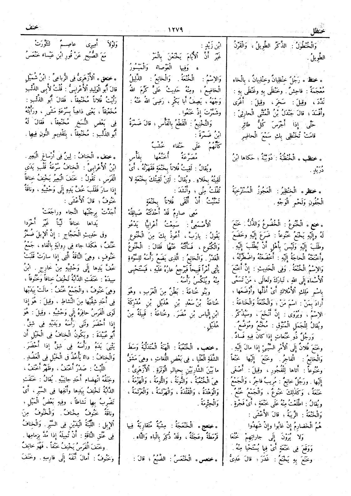 ( خنظ ) رجل خِنْظِيانٌ وخِنْذِيان بالخاء معجمة فاحشٌ وخَنْظى به وغَنْظى به ندّد وقيل سَخِر وقيل أَغْرى وأَفْسد قال جندل بن المثنى الحارثي حتى إِذا أَجْرَسَ كلُّ طائِرِ قامَتْ تُخَنْظِي بِكِ سَمْعَ الحاضِرِ ( خنظب ) الخُنْظُبَة دُوَيْبَّة حكاها ابن دُرَيْد ( خنظر ) الخِنْظِيرُ العَجُوزُ المُسْتَرْخِيَةُ الجُفُونِ ولحم الوجه ( خنع ) الخُنُوع الخُضوع والذّلُّ خَنَع له وإِليه يَخْنَعُ خُنوعاً ضَرَع إِليه وخَضَع وطلَب إِليه وليس بأَهل أَن يُطْلَب إِليه وأَخْنَعَتْه الحاجةُ إِليه أَخْضَعَتْه واضطَرَّتْه والاسم الخُنْعة وفي الحديث إِن أَخْنَعَ الأَسماء إِلى الله تبارك وتعالى مَن تسمَّى باسم مَلِك الأَملاك أَي أَذَلَّها وأَوْضَعَها أَراد بمَن اسم مَن والخُنْعة والخَناعةُ الاسم ويروى إِن أَنْخع وسيذكر ويقال للجمل المُنَوَّقِ مُخَنَّعٌ ومُوَضَّعٌ ورجل ذو خُنُعاتٍ إِذا كان فيه فَساد وخَنَع فلان إِلى الأَمر السيِّء إِذا مالَ إِليه والخانعُ الفاجر وخَنَع إِليها خَنْعاً وخُنوعاً أَتاها للفجور وقيل أَصْغَى إِليها ورجل خانع مُريب فاجر والجمع خَنَعة وكذلك خَنُوعٌ والجمع خُنُعٌ ويقال اطَّلَعْت منه على خنْعةٍ أَي فَجْرةٍ والخَنْعةُ الرِّيبة قال الأَعشى هم الخَضارِمُ إِن غابُوا وإِن شَهِدُوا ولا يُرَوْن إِلى جاراتِهم خُنُعا ووقع في خَنْعة أَي فيما يُسْتَحيا منه وخنَع به يَخْنَع غَدَر قال عدي بن زيد غيرَ أَنّ الأَيامَ يَخْنَعْنَ بالمر ء وفيها العَوْصاء والمَيْسُورُ والاسم الخُنْعةُ والخانعُ الذّليل الخاضع ومنه حديث علي كرم الله وجهه يصف أَبا بكر رضي الله عنه وشَمَّرْت إِذ خَنَعوا والتخنيعُ القطْع بالفأْس قال ضَمْرة بن ضمرة كأَنهمُ على حَنْفاء خُشْبٌ مُصَرَّعةٌ أُخْنِّعُها بفأْسِ ويقال لَقيت فلاناً بخَنْعةٍ فقَهَرْته أَي لقِيته بخَلاء ويقال لئن لقيتُك بخَنْعة لا تُفْلَتُ مني وأَنشد تَمنَّيت أَن أَلقَى فلاناً بخَنعةٍ مَعِي صارِمٌ قد أَحْدَثَتْه صَياقِلُه الأَصمعي سمعت أَعرابيّاً يدْعو يقول يا ربِّ أَعوذ بك من الخُنوع الغَدْر والخانع الذي يَضَع رأْسه للسَّوْءة يأْتي أَمراً قبيحاً فيرجع عارُه عليه فيستَحْيي منه ويُنَكِّس رأْسه وبنو خُناعةَ بطن من العرب وهو خُناعةُ بن سَعْد بن هُذَيْل بن مُدْرِكةَ بن إِلياس ابن مُضر وخُناعةُ قَبِيلة من هُذِيْل