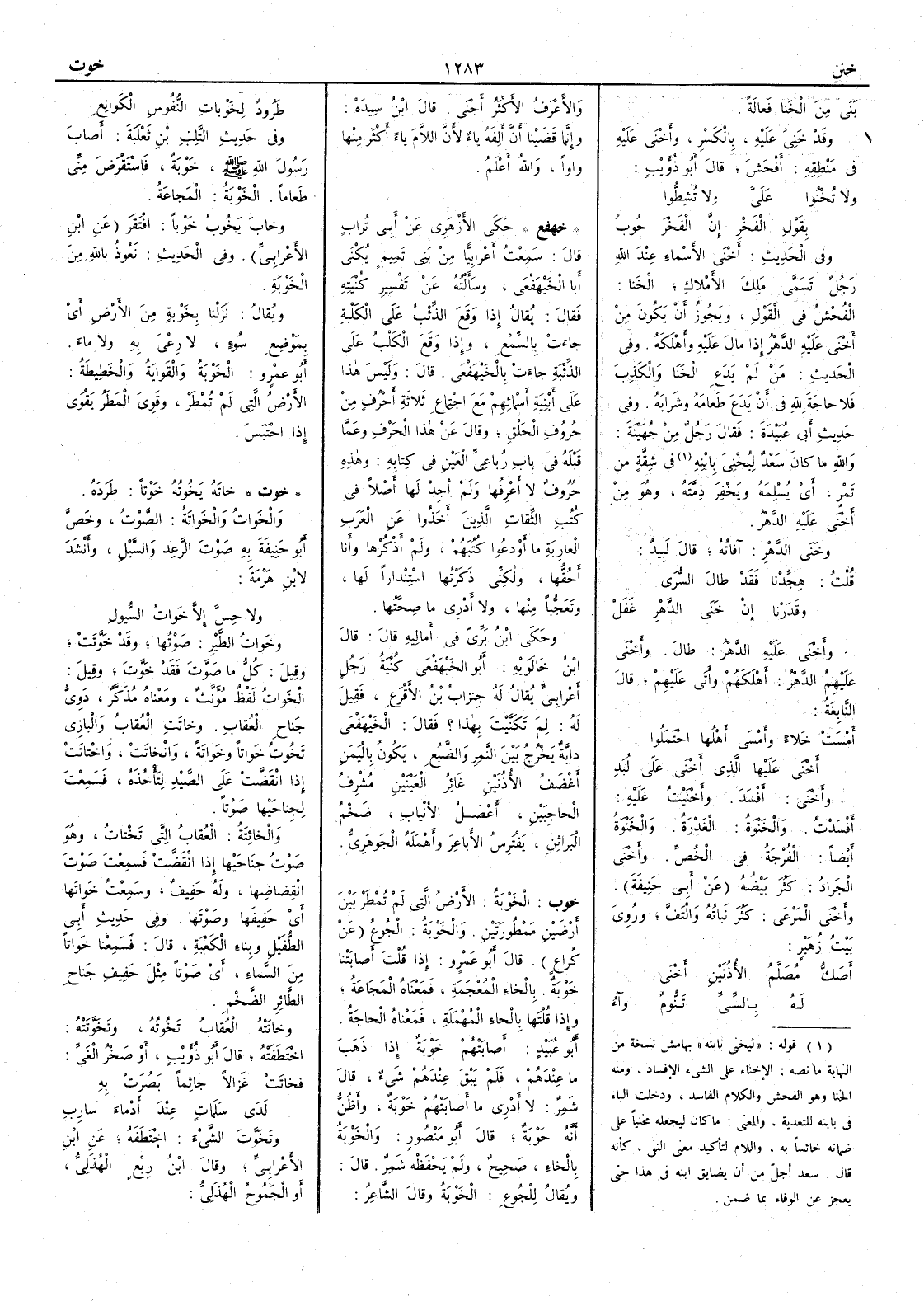 ( * قوله « ليخني بابنه » بهامش نسخة من النهاية ما نصه الإخناه على الشيء الافساد ومنه الخنا وهو الفحش والكلام الفاسد ودخلت الباء في بابنه للتعدية والمعنى ما كان ليجعله مخنياً على ضمانه خائساً به واللام لتأكيد معنى النفي كأنه قال سعد أجلّ من أن يضايق ابنه في هذا حتى يعجز عن الوفاء بما ضمن ) في شِقَّةٍ من تَمْرٍ أَي يُسْلِمه ويَخْفر ذِمَّتَه وهو من أَخْنَى عليه الدِّهْرُ وخَنَى الدَّهْرِ آفاتُه قال لبيد قلبتُ هَجِّدْنا فَقَدْ طالَ السُّرَى وقَدرنا إن خَنَى الدَّهرِ غَفَلْ وأَخْنَى علي الدَّهْرُ طالَ وأَخْنَى عليهم الدهرُ أَهلكهم وأَتَى عليهم قال النابغة أَمْسَتْ خَلاءً وأَمْسَى أَهْلُها احْتَمَلُوا أَخْنَى عليها الذي أَخْنَى على لُبَدِ وأَخْنَى أَفْسَدَ وأَخْنَيْتُ عليه أَفْسَدْتُ والخَنْوةُ الغَدْرَةُ والخَنْوَة أَيضاً الفُرْجَة في الخُصّ وأَخْنَى الجرادُ كَثُر بيضُه عن أَبي حنيفة وأَخْنَى المَرْعَى كَثُرَ نَباتُه والْتَفَّ وروي بيت زهير أَصَكُّ مُصَلَّمُ الأُذُنَيْنِ أَخْنَى له بالسِّيَّ تَنُّومٌ وآءُ والأَعرف الأَكثر أَجْنَى قال ابن سيده وإنما قضينا أَن أَلفه ياء لأَن اللام ياء أَكثر منها واواً والله أَعلم