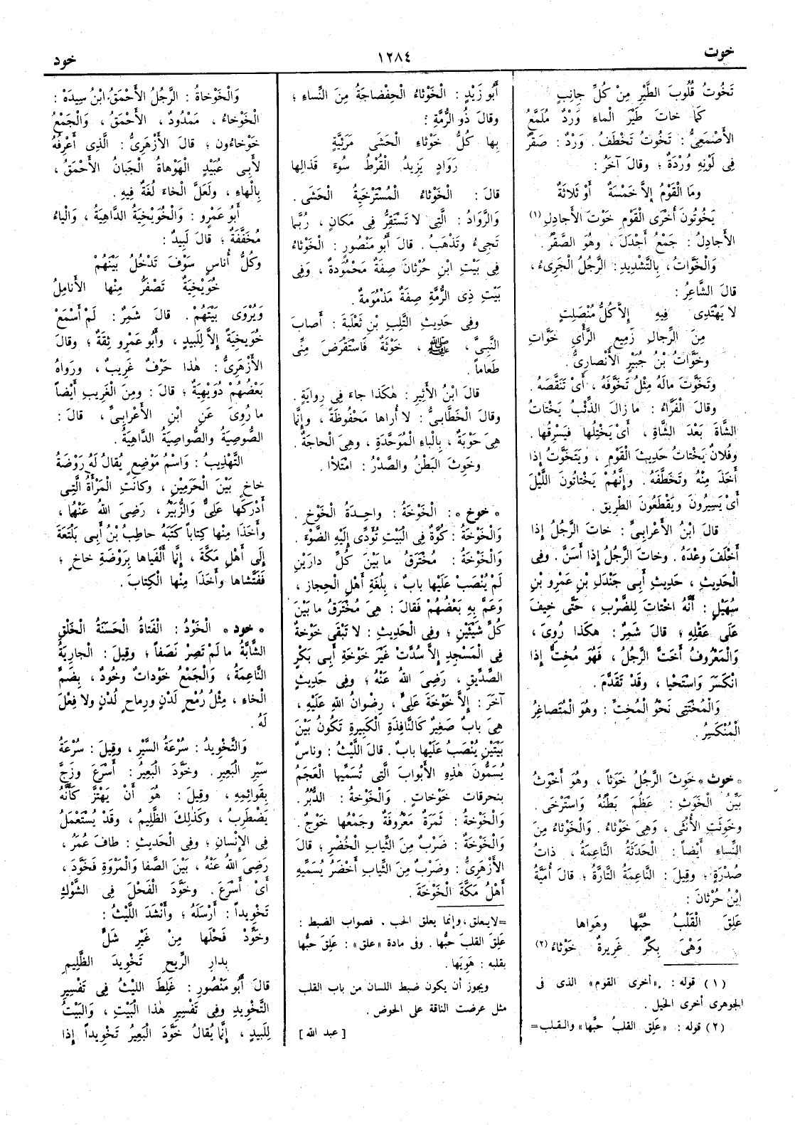 ( خوث ) خَوِثَ الرجلُ خَوَثاً وهو أَخْوَثُ بَيِّنُ الخَوَثِ عَظُمَ بَطْنُه واسْتَرْخى وخُوِثَتِ الأُنثى وهي خَوْثاء والخَوْثاءُ من النساء أَيضاً الحَدَثة الناعمةُ ذاتُ صُدْرة وقيل الناعمة التارَّة قال أُمَيَّةُ بنُ حُرْثانَ عَلِقَ القَلْبُ حُبَّها وهَواها وهي بِكْرٌ غَريرةٌ خَوْثاءُ أَبو زيد الخَوْثاءُ الحِفْضاجَة من النساء وقال ذو الرمة بها كلُّ خَوْثاءِ الحَشَى مَرَئِيَّةٍ رَوَادٍ يَزيدُ القُرْطُ سُوءَ قَذالِها قال الخَوْثاءُ المُسْتَرْخِيةُ الحَشَى والرَّوَادُ التي لا تَسْتَقِرُّ في مكان ربما تجيء وتذهب قال أَبو منصور الخَوْثاءُ في بيت ابن حُرْثانَ صفةٌ مَحْمودة وفي بيت ذي الرمة صفةٌ مذمومة وفي حديث التِّلِبِّ بن ثَعْلَبة أَصابَ النبيَّ صلى الله عليه وسلم خَوْثَةٌ فاسْتَقْرَضَ مني طعاماً قال ابن الأَثير هكذا جاء في رواية وقال الخطابي لا أُراها محفوظةً وإِنما هي حَوْبة بالباء الموحدة وهي الحاجة وخَوِثَ البطنُ والصَّدْرُ امْتَلآ