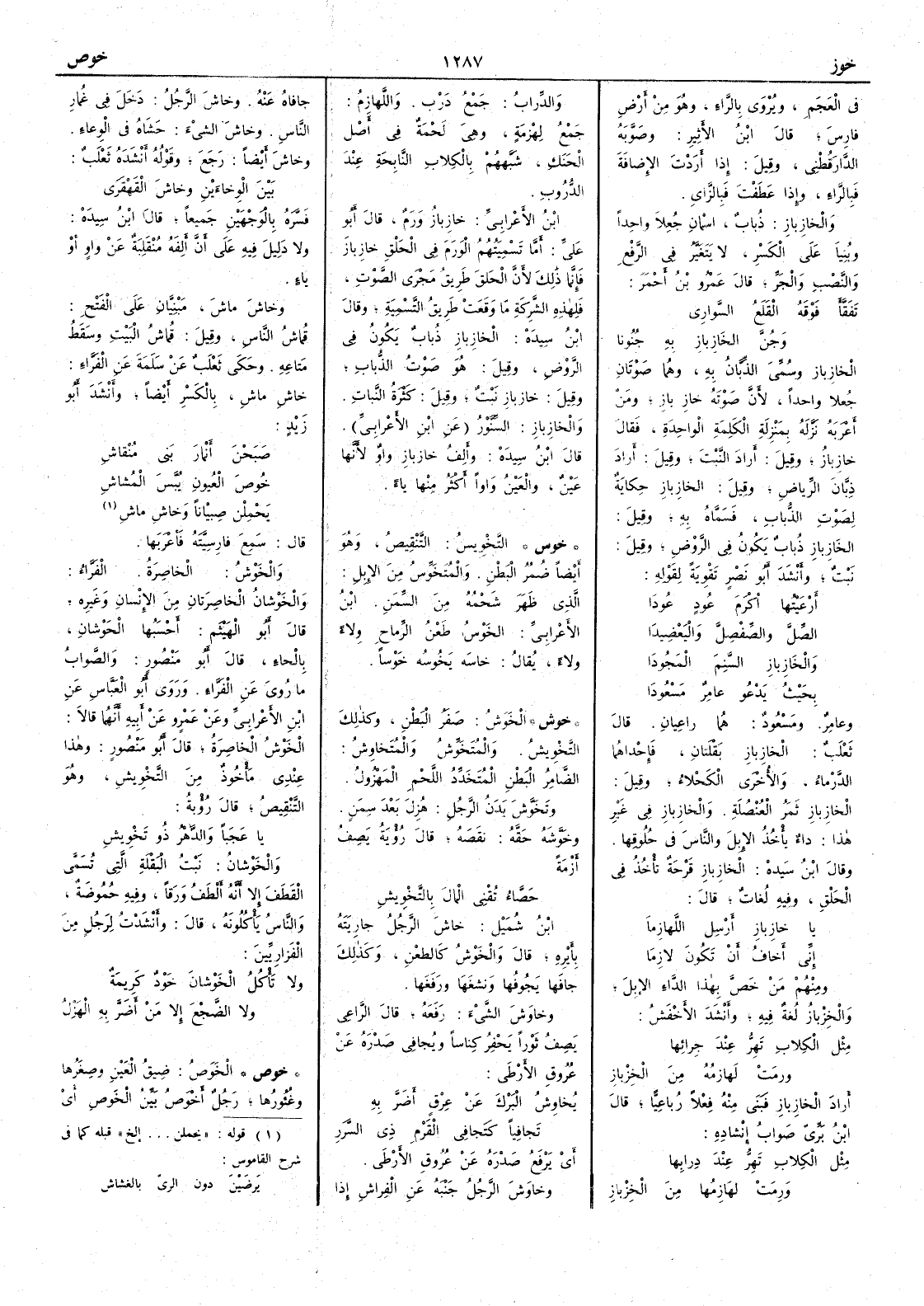 في العجم ويروى بالراء وهو من أَرض فارس قال ابن الأَثير وصوّبه الدارقطني وقيل إِذا أَردت الإِضافة فبالراء وإِذا عطفت فبالزاي والخازِبازِ ذُباب اسمان جُعِلا واحداً وبُنِيا على الكسر لا يَتَغَيَّر في الرفع والنصب والجر قال عمرو بن أَحمر تَفَقَّأَ فَوْقَه القَلَعُ السَّوارِي وجُنَّ الخَازِبازِ به حُنُونا الخازبازِ وسُمّي الذِّبَّانُ به وهما صوتانِ جُعِلا واحداً لأَن صوته خازِبازِ ومن أَعربه نزله بمنزلة الكلمة الواحدة فقال خازِبازُ وقيل أَراد النبت وقيل أَراد ذِبَّانَ الرِّياض وقيل الخازِبازِ حكاية لصوت الذباب فسماه به وقيل الخَازِبازِ ذباب يكون في الروض وقيل نبت وأَنشد أَبو نصر تقوية لقوله أَرْعَيْتُها أَكرمَ عُودٍ عُودَا الصِّلَّ والصِّفْصِلَّ واليَعْضِيدا والخَازِبازِ السَّنِمَ المَجُودا بحيث يَدْعُو عامِرٌ مَسْعُودَا وعامر ومسعود هما راعيان قال ثعلب الخازِبازِ بقلتان فإِحداهما الدَّرْماءُ والأُخرى الكَحْلاءُ وقيل الخازِباز ثمر العُنْصُلَة والخازِبازِ في غير هذا داء يأْخذ الإِبلَ والناسَ في حُلوقها وقال ابن سيده الخازِبازِ قَرْحة تأْخذ في الحَلْق وفيه لغات قال يا خازِبازِ أَرْسِل اللَّهازِما إِني أَخافُ أَن تكون لازِما ومنهم من خص بهذا الداء الإِبلَ والخِزْبازُ لغة فيه وأَنشد الأَخفش مثل الكلاب تَهِرُّ عند جِرائِها ورِمَتْ لهَازِمُه من الخِزْباز أَراد الخازِبازِ فبنى منه فعلاً رباعيْاً قال ابن بري صواب إِنشاده مثل الكلاب تهر عند دِرابِها ورِمَت لهَازِمُها من الخِزْباز والدِّرابُ جمع دَرْب واللَّهازِم جمع لِهْزِمة وهي لحمة في أَصل الحَنَك شبههم بالكلاب النابحة عند الدُّرُوب ابن الأَعرابي خازبازُ وَرَمٌ قال أَبو علي أَما تسميتهم الورم في الحلق خازِبازَ فإِنما ذلك لأَن الحلق طريق مجرى الصوت فلهذه الشركة مّا وقعت طريق التسمية وقال ابن سيده الخازِبازِ ذباب يكون في الروض وقيل هو صوت الذباب وقيل خازِبازِ نبت وقيل كثرة النبات والخازِبازِ السِّنَّوْر عن ابن الأَعرابي قال ابن سيده وأَلف خازِبازِ واو لأَنها عين والعينُ وَاواً أَكثرُ منها ياءً