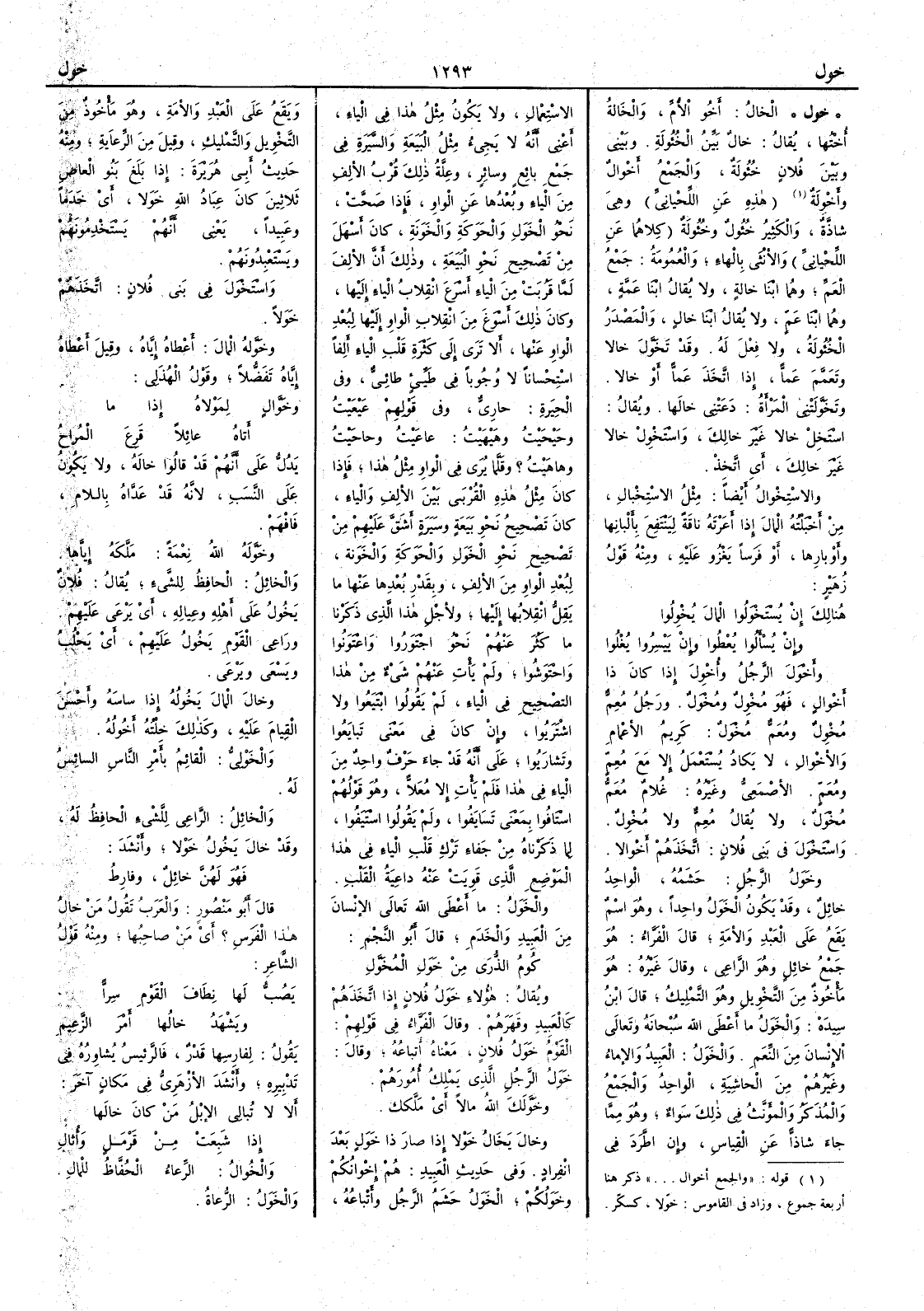 ( خول ) الخالُ أَخو الأُم والخالة أُخْتُها يقال خالٌ بَيِّن الخُؤُولة وبَيْني وبين فلان خُؤُولة والجمع أَخوال وأَخْوِلة هذه عن اللحياني وهي شاذة والكثير خُؤُول وخُؤُولة كلاهما عن اللحياني والأُنثى بالهاء والعُمُومة جمع العَمِّ وهما ابْنا خالةٍ ولا يقال ابْنا عَمَّة وهما ابْنَا عَمٍّ ولا يقال ابْنا خال والمصدر الخُؤُولة ولا فعل له وقد تَخَوَّل خالاً وتَعَمَّم عَمًّا إِذا اتخذَ عَمًّا أَو خالاً وتَخَوَّلَتْني المرأَةُ دَعَتْني خالَها ويقال اسْتَخِلْ خالاً غير خالك واسْتَخْوِل خالاً غير خالك أَي اتَّخِذْ والاسْتِخْوال أَيضاً مثل الاستخبال من أَخْبَلته المال إِذا أَعرته ناقة لينتفع بأَلبانها وأَوبارها أَو فرساً يغزو عليه ومنه قول زهير هنالك إِن يُسْتَخْوَلوا المالَ يُخْوِلوا وإِن يُسْأَلوا يُعْصُوا وإِن يَيْسِروا يَغْلوا وأَخْوَلَ الرجلُ وأُخْوِل إِذا كان ذا أَخوال فهو مُخْوِل ومُخْوَل ورجل مُعِمٌّ مُخْوِلٌ ومُعَمٌّ مُخْوَل كريم الأَعمام والأَخوال لا يكاد يستعمل إِلا مع مُعِمٍّ ومُعَمٍّ الأَصمعي وغيره غلام مُعَمٌّ مُخْوَل ولا يقال مُعِمٌّ ولا مُخْوِل واسْتَخْوَل في بني فلان اتَّخَذهم أَخوالاً وخَوَلُ الرجلِ حَشَمُه الواحد خائل وقد يكوْن الخَوَل واحداً وهو اسم يقع على العبد والأَمة قال الفراء هو جمع خائل وهو الراعي وقال غيره هو مأْخوذ من التخويل وهو التمليك قال ابن سيده والخَوَل ما أَعطى اللهُ سبحانه وتعالى الإِنسانَ من النِّعَم والخَوَل العبيد والإِماءُ وغيرهم من الحاشية الواحد والجمع والمذكر والمؤنث في ذلك سواء وهو مما جاء شاذّاً عن القياس وإِن اطَّرد في الاستعمال ولا يكون مثل هذا في الياء أَعني أَنه لا يجيء مثل البَيَعة والسَّيَرة في جمع بائع وسائر وعلة ذلك قرب الأَلف من الياء وبُعْدُها عن الواو فإِذا صحت نحو الخَوَل والحَوَكة والخَوَنة كان أَسهل من تصحيح نحو البَيَعة وذلك أَن الأَلف لما قَرُبت من الياء أَسْرَع انقلابُ الياء إِليها وكان ذلك أَسْوَغ من انقلاب الواو إِليها لبعد الواو عنها أَلا ترى إِلى كثرة قلب الياء أَلفاً استحساناً لا وجوباً في طَيِّءٍ طائِيٌّ وفي الحِيرَة حارِيٌّ وفي قولهم عَيْعَيْت وحَيحَيْت وهَيْهَيْت عاعَيْت وحاحَيْت وهاهَيْت ؟ وقَلَّما يرى في الواو مثل هذا فإِذا كان مثل هذه القُرْبَى بين الأَلف والياء كان تصحيح نحو بَيَعة وسَيَرة أَشقَّ عليهم من تصحيح نحو الخَوَل والحَوَكة والخَوَنة لبعد الواو من الأَلف وبقدر بُعْدها عنها ما يَقِلُّ انقلابها إِليها ولأَجل هذا الذي ذكرنا ما كثر عنهم نحو اجْتَوروا واعْتَوَنوا واحْتَوَشوا ولم يأْت عنهم شيء من هذا التصحيح في الياء لم يقولوا ابْتَيَعوا ولا اشْتَرَيُوا وإِن كان في معنى تبايعوا وتشاريوا على أَنه قد جاء حرف واحد من الياء في هذا فلم يأْت إِلاَّ مُعَلاًّ وهو قولهم اسْتَافوا بمعنى تَسَايفوا ولم يقولوا اسْتَيَفوا لما ذكرناه من جفاء ترك قلب الياء في هذا الموضع الذي قَوِيَت عنه داعيةُ القلب والخَوَل ما أَعْطَى اللهُ تعالى الإِنسانَ من العبيد والخَدَم قال أَبو النجم كُومُ الذُّرى من خَوَل المُخَوَّل ويقال هؤُلاء خَوَل فلان إِذا اتخذهم كالعبيد وقَهَرهم وقال الفراء في قولهم القوم خَوَل فلان معناه أَتباعه وقال خَوَل الرجل الذي يملك أُمورهم وخَوَّلك اللهُ مالاً أَي مَلَّكك وخالَ يَخَالُ خَوْلاً إِذا صار ذا خَوَل بعد انفراد وفي حديث العبيد هم إِخوانكم وخَوَلُكم الخَوَل حَشَمُ الرجل وأَتباعُه ويقع على العبد والأَمة وهو مأْخوذ من التخويل والتمليك وقيل من الرِّعاية ومنه حديث أَبي هريرة إِذا بلغ بَنُو العاص ثلاثين كان عِبَاد الله خَوَلاً أَي خَدَماً وعبيداً يعني أَنهم يستخدمونهم ويستعبدونهم واسْتَخْوَل في بني فلان اتخذهم خَوَلاً وخَوَّله المالَ أَعْطاه إِياه وقيل أَعطاه إِياه تَفَضُّلاً وقول الهذلي وخَوَّال لِمَوْلاه إِذا ما أَتاه عائلاً قَرِع المُراح يدل على 