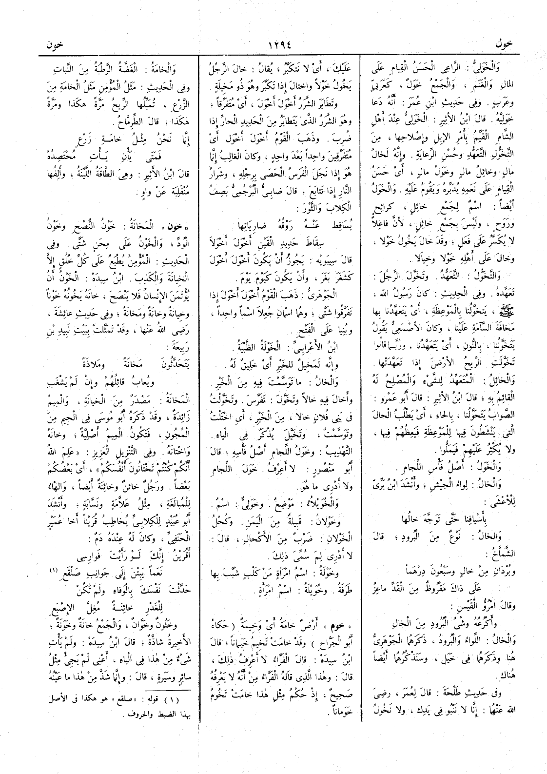 والخَوَلِيُّ الراعي الحسن القيام على المال والغنم والجمع خَوَلٌ كَعَرَبِيٍّ وعَرَب وفي حديث ابن عمر أَنه دعا خَوَلِيّه قال ابن الأَثير الخَوَلِيُّ عند أَهل الشام القَيِّم بأَمر الإِبل وإِصلاحها من التَّخَوُّل التعهُّد وحُسْنِ الرِّعاية وإِنه لخالُ مالٍ وخائلُ مالٍ وخَوَلُ مالٍ أَي حَسَنُ القيام على نَعَمه يدبره ويقوم عليه والخَوَل أَيضاً اسم لجمع خائل كرائح ورَوَح وليس بجمع خائل لأَن فاعلاً لا يُكَسَّر على فَعَل وقد خالَ يَخُولُ خَوْلاً وخال على أَهله خَوْلاً وخِيَالاً والتَّخَوُّل التعهد وتَخَوَّل الرجلَ تَعَهَّدَه وفي الحديث كان رسول الله صلى الله عليه وسلم يَتخوَّلنا بالمَوْعِظة أَي يتعهدنا بها مخافة السآمة علينا وكان الأَصمعي يقول يَتَخَوَّننا بالنون أَي يتعهدنا وربما قالوا تَخَوَّلت الريحُ الأَرضَ إِذا تعَهَّدَتْها والخائل المتعهد للشيء والمصلح له القائم به قال ابن الأَثير قال أَبو عمرو الصواب يَتَحَوَّلنا بالحاء أَي يطلب الحال التي يَنْشَطون فيها للموعظة فيَعِظهم فيها ولا يُكْثر عليهم فَيَملُّوا والخَوَل أَصل فأْس اللِّجام والخالُ لواءُ الجيش وأَنشد ابن بري للأَعشى بأَسيافنا حتى تَوَجَّه خالُها والخالُ نوع من البُرود قال الشماخ وبُرْدَانِ من خال وسَبْعُون دِرْهَماً على ذاك مَقْرُوظٌ من القَدِّ ماعز وقال امرؤ القيس وأَكرعه وَشْي البُرود من الخال والخالُ اللِّواء والبُرُود ذكرهما الجوهري هنا وذكرهما في خيل وسنذكرهما أَيضاً هناك وفي حديث طلحة قال لعمر رضي الله عنهما إِنَّا لا نَنْبُو في يدك ولا نَخُول عليك أَي لا نتكبر يقال خالَ الرجلُ يَخُول خَوْلاً واخْتال إِذا تكبر وهو ذو مَخِيلة وتَطايَرَ الشَّرَرُ أَخْوَلَ أَخْوَلَ أَي متفرقاً وهو الشَّررُ الذي يتطاير من الحديد الحار إِذا ضُرِب وذهب القوم أَخْوَلَ أَخْوَل أَي متفرقين واحداً بعد واحد وكان الغالب إِنما هو إِذا نَجَل الفرسُ الحصى برجله وشرار النار إِذا تتابع قال ضابئ البُرْجُمي يصف الكلاب والثور يُسَاقِط عنه رَوْقُه ضارِيَاتِها سِقَاطَ حديدِ القَيْنِ أَخْوَل أَخْوَلا قال سيبويه يجوز أَن يكون أَخْوَل أَخْوَل كشَغَر بَغَر وأَن يكون كيَوْمَ يَوْمَ الجوهري ذهب القوم أَخْوَلَ أَخْوَلَ إِذا تفرقوا شَتَّى وهما اسمان جُعِلا اسماً واحداً وبُنِيا على الفتح ابن الأَعرابي الخَوْلة الظَّبْية وإِنَّه لمَخِيلٌ للخير أَي خَلِيق له والخال ما تَوَسَّمت فيه من الخير وأَخال فيه خالاً وتَخَوَّل تَفَرَّس وتَخَوَّلْتُ في بني فلان خالاً من الخير أَي اخْتَلْت وتَوَسَّمت وتَخَيَّل يُذكر في الياء التهذيب وخَوَلُ اللِّجامِ أَصلُ فَأْسه قال أَبو منصور لا أَعرف خَوَل اللِّجام ولا أَدري ما هو والخُوَيْلاء موضع وخَوَلِيٌّ اسم وخَوْلانُ قبيلة من اليمن وكُحْل الخَوْلان ضرب من الأَكحال قال لا أَدري لِمَ سمي ذلك وخَوْلة اسم امرأَة من كلب شَبَّب بها طَرَفة وخُوَيْلة اسم امرأَة ( خوم ) أَرض خامَةٌ أَي وخِيمةٌ حكاه أَبو الجَرَّاحِ وقد خامَتْ تَخِيمُ خَيَماناً قال ابن سيده قال الفراء لا أعرف ذلك قال وهذا الذي قاله الفراء من أَنه لا يعرفه صحيح إذ حُكْمُ مثل هذا خامَتْ تَخُومُ خَوَماناً والخامةُ الغَضَّةُ الرِّطْبَةُ من النبات وفي الحديث مَثَلُ المؤمن مثل الخامَةِ من الزرع تُمَيِّلُها الريحُ مرة هكذا ومرة هكذا قال الطرماح إنما نَحْن مِثْلُ خامةِ زَرْعٍ فمَتى يَأْنِ يَأْتِ مُحْتَصِدُهْ قال ابن الأَثير وهي الطَّاقةُ اللينة وألفها منقلبة عن واو