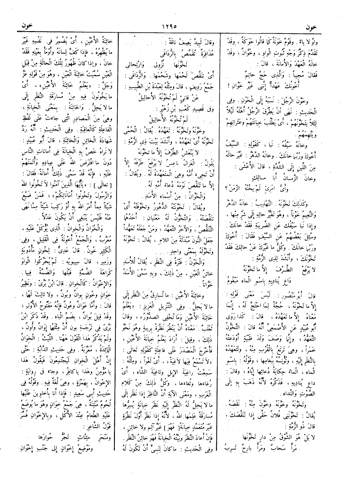 واو لا ياء وقومٌ خَوَنةٌ كما قالوا حَوَكَة وقد تقدم ذكر وجه ثبوت الواو وخُوَّانٌ وقد خانه العَهْدَ والأَمانةَ قال فقالَ مُجِيباً والذي حَجَّ حاتِمٌ أَخُونُكَ عهداً إنني غَيرُ خَوَّانِ وخَوَّنَ الرجلَ نَسَبه إلى الخَوْنِ وفي الحديث نهى أَن يَطْرُق الرجلُ أَهلَه ليلاً لئلا يَتَخَوَّنهم أَي يَطْلُبَ خِيانتَهم وعَثَراتِهم ويَتَّهِمَهُمْ وخانه سيفُه نَبا كقوله السيفُ أَخوك وربما خانَكَ وخانه الدَّهْرُ غَيَّرَ حالَه من اللِّين إلى الشدة قال الأَعشى وخانَ الزمانُ أَبا مالِكٍ وأَيُّ امرئٍ لم يخُنْه الزّمَنْ ؟ وكذلك تَخَوَّنه التهذيب خانه الدهرُ والنعيمُ خَوْناً وهو تغير حاله إلى شرٍّ منها وإذا نَبا سيفُك عن الضَّريبة فقد خانك وسئل بعضهم عن السيف فقال أَخوك وربما خانك وكلُّ ما غيَّرك عن حالك فقد تَخَوَّنَك وأَنشد لذي الرمة لا يَرْفَعُ الطَّرْفَ إلا ما تَخَوَّنَهُ دَاعٍ يُنادِيهِ باسمِ الماء مَبْغُومُ قال أَبو منصور ليس معنى قوله إلا ما تَخَوَّنه حجةً لما احتج له إنما معناه إلا ما تَعَهَّده قال كذا روى أَبو عبيد عن الأَصمعي أَنه قال التَّخَوُّنُ التعهد وإنما وصفَ وَلَدَ ظَبْيةٍ أَوْدَعْته خَمراً وهي تَرْتَع بالقُرْب منه وتتعهده بالنظر إليه وتُؤنسه ببُغامِها وقوله باسم الماء الماءُ حكاية دعائها إياه وقال داع يناديه فذكَّره لأَنه ذهب به إلى الصوت والنداء وتَخَوَّنه وخَوَّنه وخَوَّن منه نقَصه يقال تَخَوَّنني فلانٌ حقي إذا تنَقَّصَك قال ذو الرمة لا بَلْ هو الشَّوْقُ من دارٍ تخَوَّنَها مَرّاً سَحابٌ ومَرّاً بارِحٌ تَرِبُ وقال لبيد يصف ناقة عُذَافِرَةٌ تُقَمِّصُ بالرُّدَافَى تَخَوَّنَها نُزولي وارْتِحالي أَي تنَقَّص لحمَها وشَحْمَها والرُّدَافَى جمعُ رَدِيفٍ قال ومثله لعبْدَةَ بن الطَّبيب عن قانِئٍ لم تُخَوِّنْه الأَحاليلُ وفي قصيد كعب بن زهير لم تُخَوِّنْه الأَحاليلُ وخَوَّنه وتخَوَّنه تعَهَّدَه يقال الحُمَّى تخَوَّنهُ أَي تعَهَّدُه وأَنشد بيت ذي الرمة لا يَنْعَشُ الطَّرْفَ إِلا ما تَخَوَّنَه يقول الغزال ناعِسٌ لا يرفع طرفه إلا أَن تجيءَ أُمه وهي المتعهدة له ويقال إلا ما تنَقَّصَ نومَه دُعاءُ أُمِّه له والخَوَّانُ من أَسماء الأَسد ويقال تخَوَّنته الدُّهورُ وتخَوَّفَتْه أَي تنَقَّصَتْه والتَّخوُّن له معنيان أَحدهما التَّنقُّصُ والآخر التَّعُهُّدُ ومن جعله تَعَهُّداً جعل النون مبدلة من اللام يقال تخَوَّنه وتخَوَّله بمعنى واحد والخَوْنُ فَتْرة في النظر يقال للأسد خائنُ العين من ذلك وبه سمي الأَسد خَوَّاناً وخائِنةُ الأَعْيُنِ ما تُسارِقُ من النظر إلى ما لا يَحِلُّ وفي التنزيل العزيز يَعْلَمُ خائنةَ الأَعْيُنِ وما تُخْفي الصُّدُور وقال ثعلب معناه أَن ينظر نظرةً بريبة وهو نحو ذلك وقيل أَراد يعلم خيانةَ الأَعين فأَخرج المصدر على فاعلة كقوله تعالى لا تسمع فيها لاغِيَةً أَي لَغْواً ومثله سمعتُ راغِيَةَ الإِبل وثاغِيَةَ الشاءِ أَي رُغاءها وثُغاءها وكل ذلك من كلام العرب ومعنى الآية أَن الناظر إذا نظر إلى ما لا يحل له النظر إليه نظر خيانةٍ يُسِرُّها مسارقة علمها الله لأَنه إذا نظر أَول نظرة غير متعمد خيانة غيرُ آثم ولا خائن فإِن أَعاد النظر ونيتُه الخيانة فهو خائن النظر وفي الحديث ما كان لنبيٍّ أَن تكونَ له خائنةُ الأَعْيُن أَي يضمر في نفسه غيرَ ما يظهره فإِذا كف لسانه وأَومأَ بعينه فقد خان وإذا كان ظهور تلك الحالة من قِبَل العين سميت خائِنَةَ العين وهو من قوله عز وجل يعلم خائنة الأَعين أَي ما يَخُونون فيه من مُسارقة النظر إلى ما لا يحل والخائِنةُ بمعنى الخيانة وهي من المصادر التي جاءت على لفظ الفاعلة كالعاقبة وفي الحديث أَنه رَدَّ شهادَةَ الخائن والخائنة قال أَبو عبيد لا نراه خَصَّ به الخِيانةَ في أَمانات الناس دون ما افترض الله على عباده وأْتمنهم عليه فإِنه قد سمى ذلك أَمانة فقال يا أيها الذين آمنوا لا تَخُونوا الله والرسولَ وتَخُون