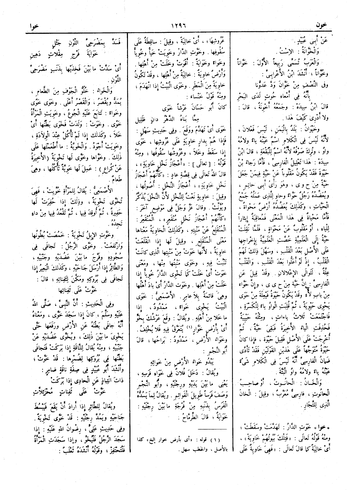 ( * قوله بأنه هكذا في الأصل دون إشباع حركة الضمير ) قال ابن سيده وجمعه أَخْوِنة قال ولا أَدري كيف هذا وخَيْوَانُ بلد باليمن ليس فَعْلانَ لأَنه ليس في الكلام اسم عينه ياء ولامه واو وترك صرفه لأَنه اسم للبقعة قال ابن سيده هذا تعليل الفارسي فأَما رجاءُ بنُ حَيْوَة فقد يكون مقلوباً عن حيَّةٍ فيمن جعل حَيَّةً من ح و ي وهو رأْي أَبي حاتم ويُعَضِّدُه رجل حَوَّاء وحاوٍ للذي عَمَلُه جمع الحَيّاتِ وكذلك يُعَضِّدُه أَرض مَحْواة فأَما مَحْياةٌ في هذا المعنى فمُعاقِبَةٌ إِيثاراً للياء أَو مقلوب عن مَحْوَاة فلما نقلت حَيَّةُ إلى العلمية خُصَّت العلمية بإخراجها على الأَصل بعد القلب وسَهَّلَ ذلك لهم القلبُ إذْ لو أَََعَلُّوا بعد القلب والقَلْبُ علةٌ لتوالى الإِعْلالانِ وقد قيل عن الفارسي إن حَيَّة من ح ي ي وإِن حَوَّاءَ من باب لآْآءٍ وقد يكون حَيْوَة فَيْعِلَة من حَوَى يَحْوِي حَيْوِيَةً ثم قلبت الواو ياء للكسرة فاجتمعت ثلاث ياءات ومثله حَيْيِيَة فحذفت الياء الأَخيرة فبقي حَيَّة ثم أُخرجت على الأَصل فقيل حَيْوَة فإذا كان حَيْوَةُ مُتَوَجِّهاً على هذين القولين فقد تَأَدَّى ضمانُ الفارسي أَنه ليس في الكلام شيء عينه ياء ولامه واو البتة والخَانُ الحانُوتُ أَو صاحب الحانوتِ فارسي معرّب وقيل الخانُ الذي للتِّجارِ