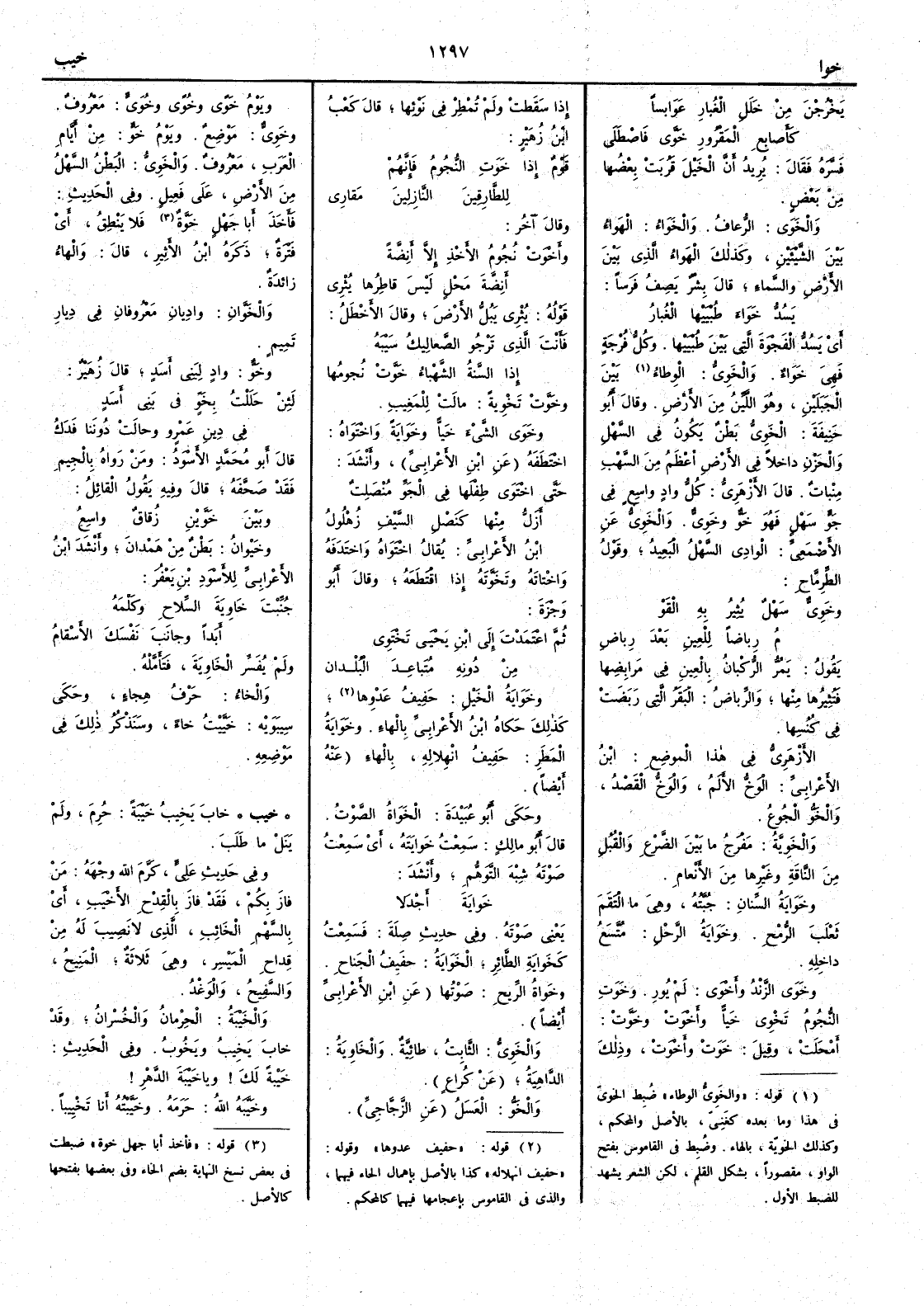 ( * قوله « حفيف عدوها وقوله حفيف انهلاله » كذا بالأصل بإهمال الحاء فيهما والذي في القاموس باعجامها فيهما كالحكم ) كذلك حكاه ابن الأَعرابي بالهاء وخَوَايةُ المطر حفِيفُ انْهِلاله بالهاء عنه أَيضاً وحكى أَبو عبيدة الخَوَاة الصَّوْتُ قال أَبو مالك سمعت خَوايَتَهُ أي سمعت صوته شِبْهَ التَّوَهُّمِ وأَنشد خَوايَةَ أَجْدَلا يعني صوته وفي حديث صِلَةَ فَسَمِعْتُ كخَوايَةِ الطائِرِ الخَوَايَة حَفِيفُ الجَناح وخَواةُ الرِّيحِ صَوْتها عن ابن الأَعرابي أَيضاً والخَوِيُّ الثابِتُ طائِيَّة والخَاوِيَةُ الداهِية عن كراع والخَوُّ العَسَل عن الزجاجيّ ويومُ خَوىً وخُوىً وخُوَيٍّ معروف وخَوِيٌّ موضع ويَومُ خَوٍّ من أَيام العرب معروف والخَوِيُّ البَطْنُ السَّهْلُ من الأَرض على فعيل وفي الحديث فأَخَذَ أَبا جَهْل خَوَّةٌ