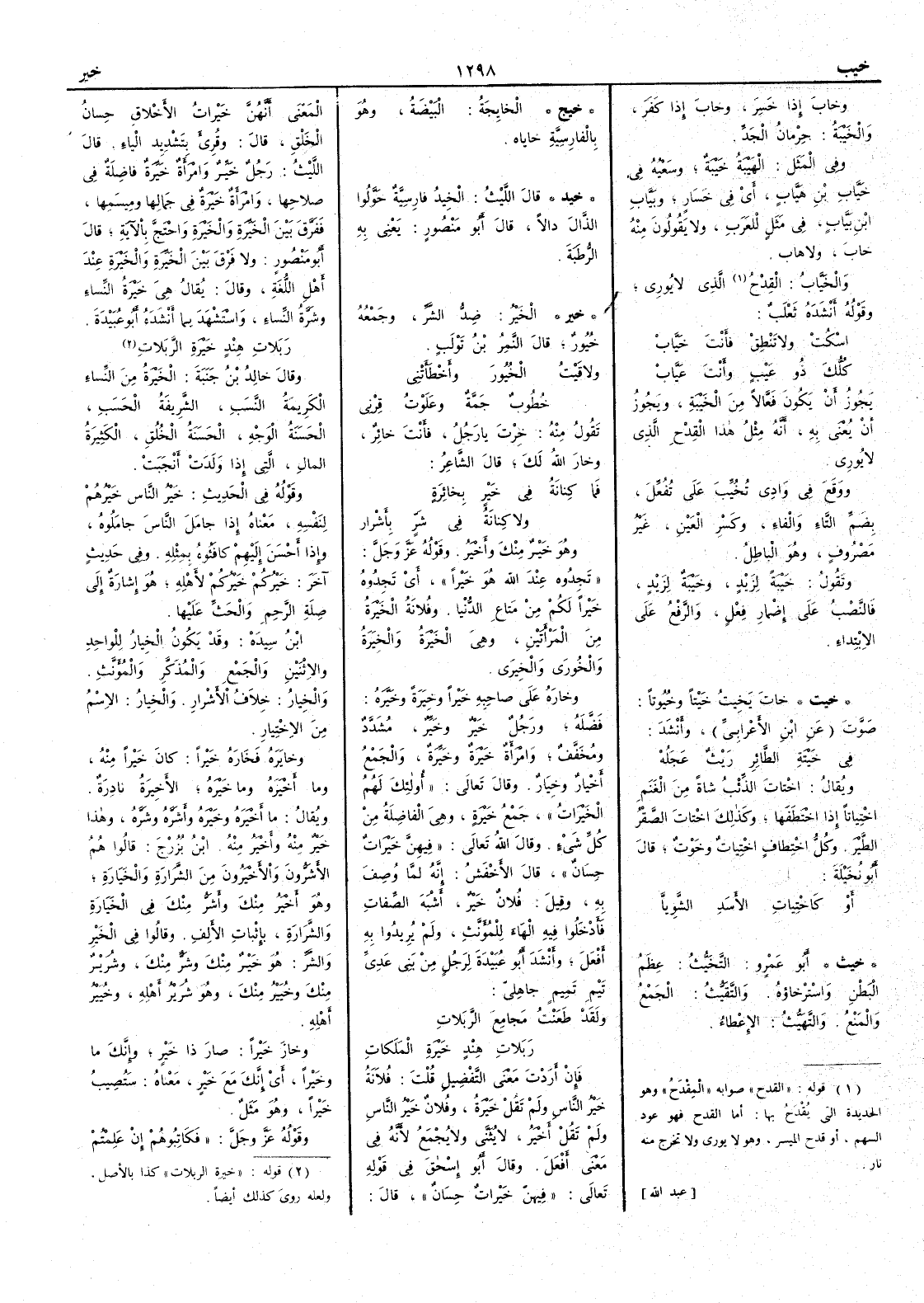 ( خير ) الخَيْرُ ضد الشر وجمعه خُيور قال النمر ابن تولب ولاقَيْتُ الخُيُورَ وأَخْطَأَتْني خُطوبٌ جَمَّةٌ وعَلَوْتُ قِرْني تقول منه خِرْتَ يا رجل فأَنتَ خائِرٌ وخارَ اللهُ لك قال الشاعر فما كِنانَةُ في خَيْرٍ بِخَائِرَةٍ ولا كِنانَةُ في شَرٍّ بَِأَشْرارِ وهو خَيْرٌ منك وأَخْيَرُ وقوله عز وجل تَجِدُوه عند اللهِ هو خَيْراً أَي تجدوه خيراً لكم من متاع الدنيا وفلانة الخَيْرَةُ من المرأَتين وهي الخَيْرَةُ والخِيَرَةُ والخُوْرَى والخِيرى وخارَهُ على صاحبه خَيْراً وخِيَرَةً وخَيَّرَهُ فَضَّله ورجل خَيْرٌ وخَيِّرٌ مشدد ومخفف وامرأَة خَيْرَةٌ وخَيِّرَةٌ والجمع أَخْيارٌ وخِيَارٌ وقال تعالى أُولئك لهم الخَيْراتُ جمع خَيْرَةٍ وهي الفاضلة من كل شيء وقال الله تعالى فيهن خَيْرَاتٌ حِسَان قال الأَخفش إِنه لما وصف به وقيل فلان خَيْرٌ أَشبه الصفات فأَدخلوا فيه الهاء للمؤنث ولم يريدوا به أَفعل وأَنشد أَبو عبيدة لرجل من بني عَدِيّ تَيْمِ تَمِيمٍ جاهليّ ولقد طَعَنْتُ مَجامِعَ الرَّبَلاَتِ رَبَلاَتِ هِنْدٍ خَيْرَةِ المَلَكاتِ فإِن أَردت معنى التفضيل قلت فلانة خَيْرُ الناسِ ولم تقل خَيْرَةُ وفلانٌ خَيْرُ الناس ولم تقل أَخْيَرُ لا يثنى ولا يجمع لأَنه في معنى أَفعل وقال أَبو إسحق في قوله تعالى فيهنّ خَيرات حِسان قال المعنى أَنهن خيرات الأَخلاق حسان الخَلْقِ قال وقرئ بتشديد الياء قال الليث رجل خَيِّر وامرأَة خَيِّرَةٌ فاضلة في صلاحها وامرأَة خَيْرَةٌ في جمالها ومِيسَمِها ففرق بين الخَيِّرة والخَيْرَةِ واحتج بالآية قال أَبو منصور ولا فرق بين الخَيِّرَة والخَيْرَة عند أَهل اللغة وقال يقال هي خَيْرَة النساء وشَرَّةُ النساء واستشهد بما أَنشده أَبو عبيدة ربلات هند خيرة الربلات وقال خالد بن جَنَبَةَ الخَيْرَةُ من النساء الكريمة النَّسَبِ الشريفة الحَسَبِ الحَسَنَةُ الوجه الحَسَنَةُ الخُلُقِ الكثيرة المال التي إِذا وَلَدَتْ أَنْجَبَتْ وقوله في الحديث خَيْرُ الناس خَيْرُهم لنفسه معناه إِذا جامَلَ الناسَ جاملوه وإِذا أَحسن إِليهم كافأُوه بمثله وفي حديث آخر خَيْرُكم خَيْرُكم لأَهله هو إِشارة إِلى صلة الرحم والحث عليها ابن سيده وقد يكون الخِيارُ للواحد والاثنين والجمع والمذكر والمؤنث والخِيارُ الاسم من الاخْتَِيارِ وخايَرَهُ فَخَارَهُ خَيْراً كان خَيْراً منه وما أَخْيَرَه وما خَيْرَه الأَخيرة نادرة ويقال ما أَخْيَرَه وخَيْرَه وأَشَرَّه وشرَّه وهذا خَيْرٌ منه وأَخْيَرُ منه ابن بُزُرج قالوا هم الأَشَرُّونَ والأَخْيَرونَ من الشَّرَارَة والخَيَارَةِ وهو أَخْير منك وأَشر منك في الخَيَارَة والشَّرَارَة بإِثبات الأَلف وقالوا في الخَيْر والشَّرِّ هو خَيْرٌ منك وشَرٌّ منك وشُرَيْرٌ منك وخُيَيْرٌ منك وهو شُرَيْرُ أَهلهِ وخُيَيْرُ أَهله وخارَ خَيْراً صار ذا خَيْر وإِنَّكَ ما وخَيْراً أَي إِنك مع خير معناه ستصيب خيراً وهو مَثَلٌ وقوله عز وجل فكاتبوهم إِن علمتم