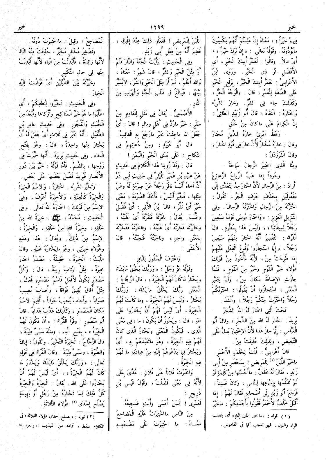 ( * قوله « ما خير اللبن إلخ » أي بنصب الراء والنون فهو تعجب كما في القاموس ) للمريض بمحضر من أَبي زيد فقال له خلف ما أَحسنها من كلمة لو لم تُدَنِّسْها بإِسْماعِها للناس وكان ضَنِيناً فرجع أَبو زيد إِلى أَصحابه فقال لهم إِذا أَقبل خلف الأَحمر فقولوا بأَجمعكم ما خَيْرَ اللَّبَنَ للمريض ؟ ففعلوا ذلك عند إِقباله فعلم أَنه من فعل أَبي زيد وفي الحديث رأَيت الجنة والنار فلم أَر مثلَ الخَيْرِ والشَّرِّ قال شمر معناه والله أَعلم لم أَر مثل الخير والشر لا يميز بينهما فيبالغ في طلب الجنة والهرب من النار الأَصمعي يقال في مَثَلٍ للقادم من سفر خَيْرَ ما رُدَّ في أَهل ومال قال أَي جعلَ الله ما جئت خَيْرَ ما رجع به الغائبُ قال أَبو عبيد ومن دعائهم في النكاح على يَدَي الخَيْرِ واليُمْنِ قال وقد روينا هذا الكلام في حديث عن عُبَيْدِ بن عُمَيْرٍ الليثي في حديث أَبي ذر أَن أَخاه أُنَيْساً نافَرَ رجلاً عن صِرْمَةٍ له وعن مثلها فَخُيِّرَ أُنَيْسٌ فَأَخذ الصرمة معنى خُيِّرَ أَي نُفِّرَ قال ابن الأَثير أَي فُضِّل وغُلِّبَ يقال نافَرْتُه فَنَفَرْتُه أَي غلبته وخايَرْتُه فَخِرْتُه أَي غلبته وفاخَرْتُه فَفَخَرْتُه بمعنى واحد وناجَبْتُه قال الأَعشى واعْتَرَفَ المَنْفُورُ للنافِرِ وقوله عز وجل وَرَبُّكَ يَخْلُق ما يشاء ويَخْتارُ ما كان لهم الخِيَرَةُ قال الزجاج المعنى ربك يخلق ما يشاء وربك يختار وليس لهم الخيرة وما كانت لهم الخيرة أَي ليس لهم أَن يختاروا على الله قال ويجوز أَن يكون ما في معنى الذي فيكون المعنى ويختار الذي كان لهم فيه الخيرة وهو ما تَعَبَّدَهم به أَي ويختار فيما يدعوهم إِليه من عبادته ما لهم فيه الخِيَرَةُ واخْتَرْتُ فلاناً على فلان عُدِّيَ بعلى لأَنه في معنى فَضَّلْتُ وقول قَيْسِ بن ذريحٍ لَعَمْرِي لَمَنْ أَمْسَى وأَنتِ ضَجِيعُه من الناسِ ما اخْتِيرَتْ عليه المَضاجِعُ معناه ما اختيرت على مَضْجَعِه المضاجعُ وقيل ما اختيرت دونه وتصغير مختار مُخَيِّر حذفت منه التاء لأَنها زائدة فأُبدلت من الياء لأَنها أُبدلت منها في حال التكبير وخَيَّرْتُه بين الشيئين أَي فَوَّضْتُ إِليه الخِيارَ وفي الحديث تَخَيَّرُوا لنُطَفِكُمْ أَي اطلبوا ما هو خير المناكح وأَزكاها وأَبعد من الخُبْثِ والفجور وفي حديث عامر بن الطُّفَيْلِ أَنه خَيَّر في ثلاث أَي جَعَلَ له أَن يختار منها واحدة قال وهو بفتح الخاء وفي حديث بَرِيرة أَنها خُيِّرَتْ في زوجها بالضم فأَما قوله خَيَّرَ بين دور الأَنصار فيريد فَضَّلَ بعضها على بعض وتَخَيَّر الشيءَ اختاره والاسم الخِيرَة والخِيَرَة كالعنبة والأَخيرة أَعرف وهي الاسم من قولك اختاره الله تعالى وفي الحديث محمدٌ صلى الله عليه وسلم خِيَرَةُ الله من خلقه وخِيَرَةُ الله من خلقه والخِيَرَة الاسم من ذلك ويقال هذا وهذه وهؤلاء خِيرَتي وهو ما يختاره عليه وقال الليث الخِيرةُ خفيفة مصدر اخْتارَ خِيرة مثل ارْتابَ رِيبَةً قال وكل مصدر يكون لأَفعل فاسم مصدره فَعَال مثل أَفاق يُفِيقُ فَوَاقاً وأَصابل يُصيب صَوَاباً وأَجاب يُجيب جَواباً أُقيم الاسم مكان المصدر وكذلك عَذَّبَ عَذاباً قال أَبو منصور وقرأَ القراء أَن تكون لهم الخِيَرَةُ بفتح الياء ومثله سَبْيٌ طِيَبَةٌ قال الزجاج الخِيَرَة التخيير وتقول إِياك والطِّيَرَةَ وسَبْيٌ طِيَبَةٌ وقال الفراء في قوله تعالى وربك يخلق ما يشاء ويختار ما كان لهم الخِيَرَةُ أَي ليس لهم أَن يختاروا على الله يقال الخِيرَةُ والخِيَرَةُ كا ذلك لما تختاره من رجل أَو بهيمة يصلح إِحدى هؤلاء الثلاثة