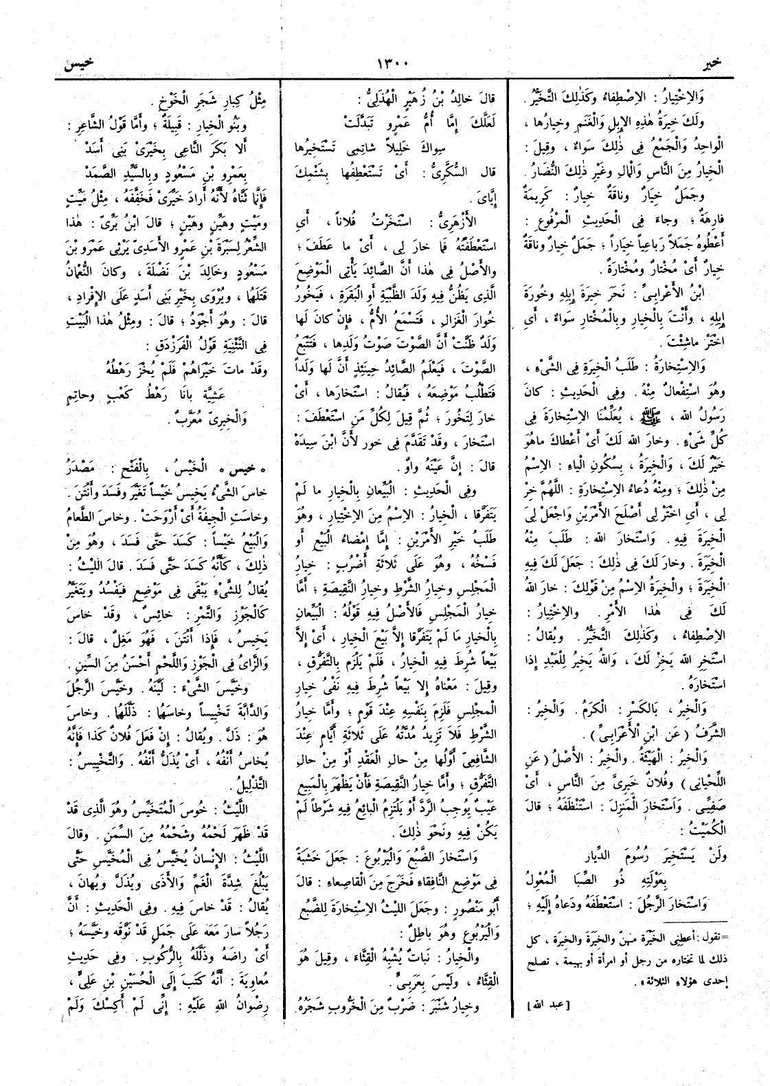 والاختيار الاصطفاء وكذلك التَّخَيُّرُ ولك خِيرَةُ هذه الإِبل والغنم وخِيارُها الواحد والجمع في ذلك سواء وقيل الخيار من الناس والمال وغير ذلك النُّضَارُ وجمل خِيَار وناقة خيار كريمة فارهة وجاء في الحديث المرفوع أَعطوه جملاً رَباعِياً خِيَاراً جمل خيار وناقة خيار أَي مختار ومختار ابن الأَعرابي نحر خِيرَةَ إِبله وخُورَةَ إِبله وأَنت بالخِيارِ وبالمُخْتارِ سواءٌ أَي اختر ما شئت والاسْتِخارَةُ طلَبُ الخِيرَة في الشيء وهو استفعال منه وفي الحديث كان رسولُ الله صلى الله عليه وسلم يعلمنا الاستخارة في كل شيء وخارَ اللهُ لك أَي أَعطاك ما هو خير لك والخِيْرَةُ بسكون الياء الاسم من ذلك ومنه دعاء الاستخارة اللهم خِرْ لي أَي اخْتَرْ لي أَصْلَحَ الأَمرين واجعل لي الخِيْرَة فيه واستخار اللهَ طلب منه الخِيَرَةَ وخار لك في ذلك جعل لك فيه الخِيَرَة والخِيْرَةُ الاسم من قولك خار الله لك في هذا الأَمر والاختيار الاصطفاء وكذلك التَّخَيُّرُ ويقال اسْتَخِرِِ الله يَخِرْ لك والله يَخِير للعبد إِذا اسْتَخارَهُ والخِيرُ بالكسر الكَرَمُ والخِيرُ الشَّرَفُ عن ابن الأَعرابي والخِيرُ الهيئة والخِيرُ الأَصل عن اللحياني وفلان خَيْرِيَّ من الناس أَي صَفِيِّي واسْتَخَارَ المنزلَ استنظفه قال الكميت ولَنْ يَسْتَخِيرَ رُسُومَ الدِّيار بِعَوْلَتِهِ ذُو الصِّبَا المُعْوِلُ واستخارَ الرجلَ استعطفه ودعاه إِليه قال خالد بن زهير الهذلي لَعَلَّك إِمَّا أُمُّ عَمْرٍو تَبَدَّلَتْ سِواكَ خَلِيلاً شاتِمي تَسْتَخِيرُها قال السكري أَي تستعطفها بشتمك إِياي الأَزهري اسْتَخَرْتُ فلاناً أَي استعطفته فما خار لي أَي ما عطف والأَصل في هذا أَن الصائد يأْتي الموضع الذي يظن فيه ولد الظبية أَو البقرة فَيَخُورُ خُوارَ الغزال فتسمع الأُم فإِن كان لها ولد ظنت أَن الصوت صوت ولدها فتتبع الصوت فيعلم الصائد حينئذٍ أَن لها ولداً فتطلب موضعه فيقال اسْتَخَارَها أَي خار لِتَخُورَ ثم قيل لكل من استعطف اسْتَخَارَ وقد تقدّم في خور لأَن ابن سيده قال إِن عينه واو وفي الحديث البَيِّعانِ بالخِيارِ ما لم يَتَفَرَّقَا الخيارُ الاسم من الاختيار وهو طلب خَيْرِ الأَمرين إِما إِمضاء البيع أَو فسحه وهو على ثلاثة أَضرب خيار المجلس وخيار الشرط وخيار النقيصة أَما خيار المجلس فالأَصل فيه قوله البيِّعان بالخيار ما لم يتفرّقا إِلاَّ بَيْعَ الخِيارِ أَي إِلا بيعاً شُرط فيه الخيار فلم يلزم بالتفرق وقيل معناه إِلا بيعاً شرط فيه نفي خيار المجلس فلزم بنفسه عند قوم وأَما خيار الشرط فلا تزيد مدّته على ثلاثة أَيام عند الشافعي أَوَّلها من حال العقد أَو من حال التفرق وأَما خيار النقيصة فأَن يظهر بالمبيع عيب يوجب الرد أَو يلتزم البائع فيه شرطاً لم يكن فيه ونحو ذلك واسْتَخار الضَّبُعَ واليَرْبُوعَ جعل خشبة في موضع النافقاء فخرج من القاصِعاء قال أَبو منصور وجعل الليث الاستخارة للضبع واليربوع وهو باطل والخِيارُ نبات يشبه القِثَّاءَ وقيل هو القثاء وليس بعربي وخِيار شَنْبَر ضرب من الخَرُّوبِ شجره مثل كبار شجر الخَوْخِ وبنو الخيار قبيلة وأَما قول الشاعر أَلا بَكَرَ النَّاعِي بِخَيْرَيْ بَنِي أَسَدْ بِعَمْرِو بن مَسعودٍ وبالسَّيِّدِ الصَّمَدْ فإِنما ثناه لأَنه أَراد خَيِّرَيْ فخففه مثل مَيّتٍ ومَيْتٍ وهَيِّنٍ وهَيْنٍ قال ابن بري هذا الشعر لسَبْرَةَ بن عمرو الأَسدي يرثي عمرو بن مسعود وخالدَ بن نَضْلَةَ وكان النعمان قتلهما ويروى بِخَيْرِ بَني أَسَد على الإِفراد قال وهو أَجود قال ومثل هذا البيت في التثنية قول الفرزدق وقد ماتَ خَيْرَاهُمْ فلم يُخْزَ رَهْطُهُ عَشِيَّةَ بانَا رَهْطُ كَعْبٍ وحاتم والخَيْرِيُّ معرَّب