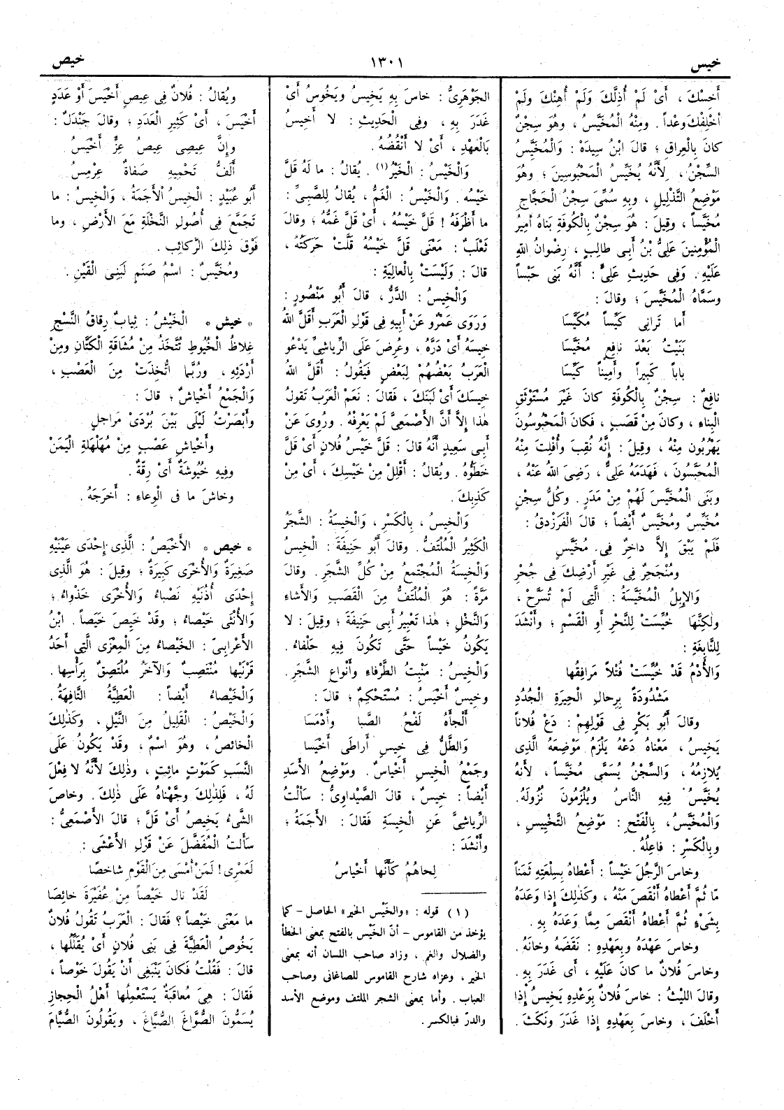 ( خيص ) الأَخْيَصُ الذي إِحْدى عينيه صغيرةٌ والأُخْرى كَبيرةٌ وقيل هو الذي إِحدى أُذنيه نَصْباءُ والأُخرى خَذواءُ والأُنثى خَيصاءُ وقد خَيِصَ خَيَصاً ابن الأَعرابي الخَيْصاءُ من المِعْزى التي أَحد قَرْنَيها مُنْتَصِبٌ والآخرُ مُلْتَصِقٌ برأْسها والخَيْصاءُ أَيضاً العطِيَّةُ التافِهةُ والخَيْصُ القليلُ من النَّيْلِ وكذلك الخائِصُ وهو اسم وقد يكون على النسب كمَوْتٍ مائِت وذلك لأَنه لا فعل له فلذلك وجَّهْناه على ذلك وخاصَ الشيءُ يَخِيصُ أَي قَلّ قال الأَصمعي سأَلت المفضل عن قول الأَعشى لَعَمْري لَمَنْ أَمْسى من القوم شاخِصا لقد نالَ خَيْصاً من عُفَيْرَةَ خائِصا ما معنى خَيْصاً ؟ فقال العرب تقول فلانٌ يَخُوصُ العطيّةَ في بني فلان أَي يُقَلِّلُها قال فقلت فكان ينبغي أَن يقول خَوْصاً فقال هي مُعاقَبةٌ يستعملها أَهلُ الحجاز يُسَمُّون الصُّوَّاغَ الصُّيَّاغَ ويقولون الصُّيَّامَ