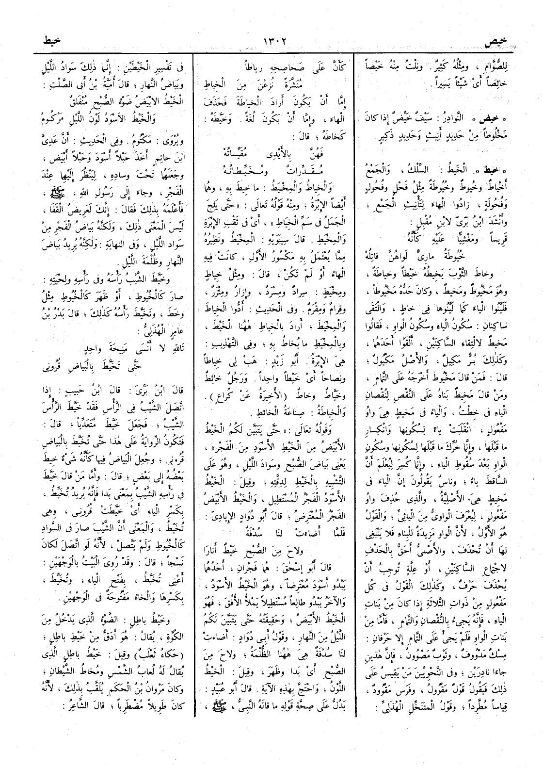 ( خيط ) الخَيْطُ السِّلْك والجمع أَخْياطٌ وخُيوطٌ وخُيوطةٌ مثل فَحْلٍ وفُحولٍ وفُحولةٍ زادوا الهاء لتأْنيث الجمع وأَنشد ابن بري لابن مقبل قَرِيساً ومَغْشِيّاً عليه كأَنَّه خُيوطةُ مارِيٍّ لَواهُنَّ فاتِلُهْ وخاطَ الثوبَ يَخِيطُه خَيْطاً وخِياطةً وهو مَخْيوطٌ ومَخِيطٌ وكان حدّه مَخْيوطاً فلَيَّنُوا الياء كما لَيَّنُوها في خاطٍ والتقى ساكنان سكون الياء وسكون الواو فقالوا مَخِيط لالتقاء الساكنين أَلقوا أَحدهما وكذلك بُرٌّ مَكِيل والأَصل مَكْيُولٌ قال فمن قال مَخْيوط أَخرجه على التمام ومن قال مخيط بناه على النقص لنقصان الياء في خِطْتُ والياء في مَخِيط هي واو مفعول انقلبت ياء لسكونها وانكسار ما قبلها وإِنما حرك ما قبلها لسكونها وسكون الواو بعد سقوط الياء وإِنما كسر ليعلم أَنّ الساقط ياء وناس يقولون إِنّ الياء في مخيط هي الأَصلية والذي حذف واو مفعول ليُعرف الواويّ من اليائيّ والقولُ هو الأَوّل لأَنّ الواو مزيدة للبناء فلا ينبغي لها أَن تحذف والأَصليّ أَحقُّ بالحذف لاجتماع الساكنين أَو علَّةٍ توجب أَن يحذف حرف وكذلك القول في كل مفعول من ذوات الثلاثة إِذا كان من بنات الياء فإِنه يجيء بالنقصان والتمام فأَما من بنات الواو فلم يجئ على التمام إِلا حَرْفان مِسْك مَدْوُوفٌ وثوب مَصْوُون فإِنَّ هذين جاءا نادرين وفي النحويين من يقيس على ذلك فيقول قَوْلٌ مَقْوُول وفرس مَقْوُودٌ قياساً مطرداً وقول المتنخل الهذلي كأَنَّ على صَحاصِحِه رِياطاً مُنَشَّرةً نُزِعْنَ من الخِياطِ إِما أَن يكون أَراد الخِياطةَ فحذف الهاء وإِما أَن يكون لغة وخَيَّطَه كخاطَه قال فهُنَّ بالأَيْدِي مُقَيِّساتُه مُقَدِّراتٌ ومُخَيِّطاتُه والخِياطُ والمِخْيَطُ ما خِيطَ به وهما أَيضاً الإِبرَةُ ومنه قوله تعالى حتى يَلِجَ الجَمَلُ في سَمِّ الخِياطِ أَي في ثَقْبِ الإِبرة والمِخْيَطِ قال سيبويه المِخْيَطُ ونظيره مما يُعْتَمل به مكسورُ الأَول كانت فيه الهاء أَو لم تكن قال ومثل خِياطٍ ومِخْيَطٍ سِرادٌ ومِسْرَدٌ وإِزارٌ ومِئْزَرٌ وقِرامٌ ومِقْرَمٌ وفي الحديث أَدُّوا الخِياطَ والمِخْيَطَ أَراد بالخِياط ههنا الخَيْطَ وبالمِخْيَطِ ما يُخاطُ به وفي التهذيب هي الإِبرة أَبو زيد هَبْ لي خِياطاً ونِصاحاً أَي خَيْطاً واحداً ورجل خائطٌ وخَيَّاطٌ وخاطٌ الأَخيرة عن كراع والخِياطةُ صِناعةُ الخائِط وقوله تعالى حتى يتَبَيَّنَ لكم الخيْطُ الأَبيضُ من الخيطِ الأَسودِ من الفجر يعني بياضَ الصبحِ وسوادَ الليل وهو على التشبيه بالخَيْطِ لدِقَّته وقيل الخيطُ الأَسود الفجر المستطيل والخيط الأَبيض الفجر المُعْتَرِضُ قال أَبو دُواد الإِيادي فلمَّا أَضاءتْ لَنا سُدْفةٌ ولاحَ من الصُّبْحِ خَيْطٌ أَنارا قال أَبو إِسحق هما فَجْرانِ أَحدهما يبدو أَسود مُعْترضاً وهو الخيط الأَسود والآخر يبدو طالعاً مستطيلاً يَمْلأُ الأُفق فهو الخيط الأَبيض وحقيقته حتى يتبين لكم الليلُ من النهار وقول أَبي دواد أَضاءت لنا سدفة هي ههنا الظُّلمة ولاحَ من الصبح أَي بَدا وظهر وقيل الخيْطُ اللَّوْنُ واحتج بهذه الآية قال أَبو عبيد يدل على صحة قوله ما قاله النبي صلّى اللّه عليه وسلّم في تفسير الخَيْطَيْنِ إِنما ذلك سوادُ الليلِ وبياضُ النهار قال أُمَيَّةُ بن أَبي الصلت الخَيْطُ الأَبْيَضُ ضَوْء الصُّبْحِ مُنْفَلِقٌ والخِيْطُ الأَسْودُ لوْنُ الليلِ مَرْكُومُ ويروى مَكْتُومُ وفي الحديث أَنَّ عَدِيّ بن حاتم أَخذَ حَبْلاً أَسودَ وحبلاً أَبيضَ وجعلهما تحت وِسادِه لينظر إِليهما عند الفجر وجاء إِلى رسول اللّه صلّى اللّه عليه وسلّم فأَعلمه بذلك فقال إِنك لعَريصُ القَفا ليس المعنى ذلك ولكنه بياضُ الفجرِ من سوادِ الليلِ وفي النهاية ولكنه يريد بياضَ النهار وظلمة الليل وخَيَّطَ الشيبُ رأْسَه وفي رأْسِه ولِحْيَتِه صار كالخُيوطِ أَو ظهر كالخُيوطِ مثل وخَطَ وتَخَيَّطَ رأْسهُ كذلك قال بدر بن عامر الهذلي تاللّهِ لا أَنْسَى مَنِي