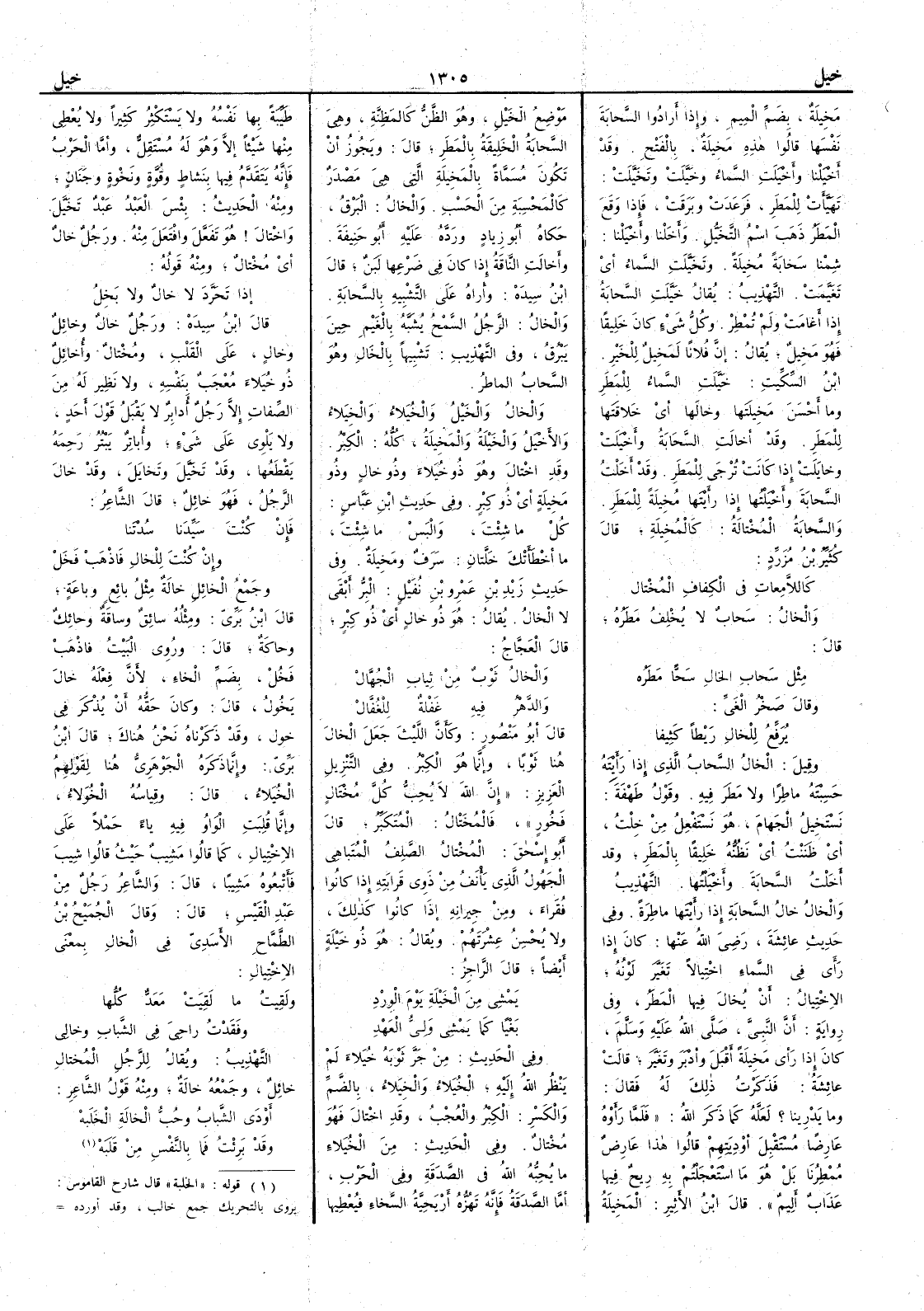 مُخِيلة بضم الميم وإِذا أَرادوا السحابة نفسها قالوا هذه مَخِيلة بالفتح وقد أَخْيَلْنا وأَخْيَلَتِ السماءُ وخَيَّلَتْ وتَخَيَّلَتْ تهيَّأَت للمطر فرَعَدَتْ وبَرَقَتْ فإِذا وقع المطر ذهب اسم التَّخَيُّل وأَخَلْنا وأَخْيَلْنا شِمْنا سَحابة مُخِيلة وتَخَيَّلَتِ السماءُ أَي تَغَيَّمَت التهذيب يقال خَيَّلَتِ السحابةُ إِذا أَغامتْ ولم تُمْطِر وكلُّ شيء كان خَلِيقاً فهو مَخِيلٌ يقال إِن فلاناً لمَخِيل للخير ابن السكيت خَيَّلَت السماءُ للمطر وما أَحسن مَخِيلتها وخالها أَي خَلاقَتها للمطر وقد أَخالتِ السحابةُ وأَخْيَلَتْ وخايَلَتْ إِذا كانت تُرْجى للمطر وقد أَخَلْتُ السحابة وأَخْيَلْتها إِذا رأَيتها مُخِيلة للمطر والسحابة المُخْتالة كالمُخِيلة قال كُثَيِّر بن مُزَرِّد كاللامعات في الكِفاف المُخْتال والخالُ سحاب لا يُخُلِف مَطَرُه قال مثل سحاب الخال سَحّاً مَطَرُه وقال صَخْر الغَيّ يُرَفِّع للخال رَيْطاً كَثِيفا وقيل الخالُ السحاب الذي إِذا رأَيته حسبته ماطراً ولا مَطَر فيه وقول طَهْفة تَسْتخيل الجَهام هو نستفعل من خِلْت أَي ظننت أَي نظُنُّه خَلِيقاً بالمَطَر وقد أَخَلْتُ السحابة وأَخْيَلْتها التهذيب والخالُ خالُ السحابة إِذا رأَيتها ماطرة وفي حديث عائشة رضي الله عنها كان إِذا رأَى في السماء اخْتِيالاً تغيَّر لونُه الاخْتِيال أَن يُخال فيها المَطَر وفي رواية أَن النبي صلى الله عليه وسلم كان إِذا رأَى مَخِيلة أَقْبَل وأَدْبَر وتغير قالت عائشة فذكرت ذلك له فقال وما يدرينا ؟ لعله كما ذكر الله فلما رَأَوْه عارضاً مُسْتقبل أَودِيَتهم قالوا هذا عارض مُمْطِرنا بل هو ما استعجلتم به ريح فيها عذاب أَليم قال ابن الأَثير المَخِيلة موضع الخَيْل وهو الظَّنُّ كالمَظِنَّة وهي السحابة الخليقة بالمطر قال ويجوز أَن تكون مُسَمَّاة بالمَخِيلة التي هي مصدر كالمَحْسِبة من الحَسْب والخالُ البَرْقُ حكاه أَبو زياد ورَدَّه عليه أَبو حنيفة وأَخالتِ الناقة إِذا كان في ضَرْعها لَبَن قال ابن سيده وأُراه على التشبيه بالسحابة والخالُ الرَّجل السَّمْح يُشَبَّه بالغَيْم حين يَبْرُق وفي التهذيب تشبيهاً بالخال وهو السحاب الماطر والخالُ والخَيْل والخُيَلاء والخِيَلاء والأَخْيَل والخَيْلة والمَخِيلة كُلُّه الكِبْر وقد اخْتالَ وهو ذو خُيَلاءَ وذو خالٍ وذو مَخِيلة أَي ذو كِبْر وفي حديث ابن عباس كُلْ ما شِئْت والْبَسْ ما شِئْت ما أَخطأَتك خَلَّتانِ سَرَفٌ ومَخِيلة وفي حديث زيد بن عمرو بن نُفَيْل البِرُّ أَبْقى لا الخال يقال هو ذو خالٍ أَي ذو كِبر قال العجاج والخالُ ثوبٌ من ثياب الجُهَّال والدَّهْر فيه غَفْلة للغُفَّال قال أَبو منصور وكأَن الليث جعل الخالَ هنا ثوباً وإِنما هو الكِبْر وفي التنزيل العزيز إِن الله لا يُحِبُّ كل مُخْتالٍ فَخُور فالمُخْتال المتكبر قال أَبو إِسحق المُخْتال الصَّلِف المُتَباهي الجَهُول الذي يَأْنَف من ذوي قَرابته إِذا كانوا فقراء ومن جِيرانه إِذا كانو كذلك ولا يُحْسن عِشْرَتَهم ويقال هو ذو خَيْلة أَيضاً قال الراجز يَمْشي من الخَيْلة يَوْم الوِرْد بَغْياً كما يَمْشي وَليُّ العَهْد وفي الحديث من جَرّ ثوبه خُيَلاءَ لم ينظر الله إِليه الخُيَلاء والخِيَلاء بالضم والكسر الكِبْر والعُجْب وقد اخْتال فهو مُخْتال وفي الحديث من الخُيَلاء ما يُحِبُّه الله في الصَّدقة وفي الحَرْب أَما الصدقة فإِنه تَهُزُّه أَرْيَحِيَّة السخاء فيُعْطِيها طَيِّبةً بها نفسُه ولا يَسْتَكثر كثيراً ولا يُعْطي منها شيئاً إِلا وهو له مُسْتَقِلّ وأَما الحرب فإِنه يتقدم فيها بنَشاط وقُوَّة ونَخْوة وجَنان ومنه الحديث بئس العَبْدُ عَبْدٌ تَخَيَّل واخْتال هو تَفَعَّل وافْتَعَل منه ورَجُلٌ خالٌ أَي مُخْتال ومنه قوله إِذا تَحَرَّدَ لا خالٌ ولا بَخِل قال ابن سيده ورجلٌ خالٌ وخائِلٌ وخالٍ على القَلْب ومُخْتالٌ وأُخائِلٌ ذو خُيَلاء مُعْجب بنفسه ولا نظير له من الصفات إِ