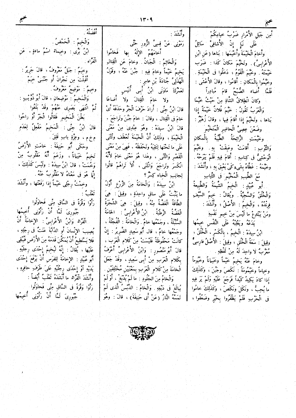 أَمِن جَبَل الأَمْرارِ ضرْبُ خيامِكم على نَبإٍ إنّ الأَشافيّ سَائل وأَخامَ الخَيْمَةَ وأخْيَمَها بَناها عن ابن الأَعرابي وتَخَيَّم مكانَ كذا ضَرَب خَيْمَتَهُ وخَيَّمَ القومُ دخلوا في الخَيْمة وخَيَّمُوا بالمكان أَقاموا وقال الأَعشى فَلَمَّا أَضاءَ الصُّبْحُ قامَ مُبادراً وكانَ انْطِلاقُ الشاة مِن حَيْثُ خَيَّمَا والعرب تقول خَيَّمَ فلان خَيْمَةً إذا بناها وتَخَيَّمَ إذا أقامَ فيها وقال زهير وضَعْنَ عِصِيَّ الحاضِرِ المُتَخَيِّمِ وخَيَّمَت الرائحة الطيِّبةُ بالمكان والثوب أَقامت وعَبِقَت به وخَيِّمَ الوَحْشِيُّ في كِناسه أَقامَ فيه فلم يَبْرَحْهُ وخَيَّمَه غَطَّاه بشيء كي يَعْبق به وأَنشد مَعَ الطِّيبِ المُخَيَّم في الثياب أَبو عبيد الخِيمُ الشيمَة والطبيعة والخُلُق والسجية ويقال خِيم السيف فِرِنْدُه والخِيمُ الأَصل وأَنشد ومَنْ يَبْتَدِعْ ما لَيْس مِن خِيم نَفْسِه يَدَعْه ويَغْلِبْه على النفسِ خِيمُها ابن سيده الخِيمُ بالكسر الخُلُق وقيل سَعة الخُلُق وقيل الأَصل فارسي معرَّب لا واحد له من لفظه وخامَ عنه يَخِيم خَيْماً وخَيَماناً وخُيُوماً وخِياماً وخَيْمومة نَكَصَ وجَبُنَ وكذلك إذا كاد يكيد كيداً فرجع عليه ولم ير فيه ما يحب ونَكَلَ ونَكَصَ وكذلك خامُوا في الحرْب فلم يَظْفَرُوا بخير وضعُفوا وأَنشد رَمَوْني عن قِسِيِّ الزُّور حتى أَخامَهُمُ الإلَهُ بها فَخامُوا والخَائِمُ الجَبان وخامَ عن القِتال يَخِيمُ خَيماً وخام فيه جَبُن عنه وقول الهذلي جُنادة بن عامر لعَمْرُك مَا وَنَى ابْنُ أَبي أُنَيْسٍ ولاخامَ القِتالَ ولا أَضاعا قال ابن جني أَراد حرف الجر وحذَفَه أَي خامَ في القتال وقال خامَ جَبُنَ وتَراجع قال ابن سيده وهو عندي من معنى الخَيْمَةِ وذلك أن الخَيْمَة تُعطف وتُثْنى على ما تحتها لتَقيه وتحفظه فهي من معنى القَصْر والثَّنْي وهذا هو معنى خامَ لأَنه انكَسَر وتراجع وانثنى أَلا تَراهم قالوا لجانب الخِباء كِسْرٌ ؟ ابن سيده والخامَةُ من الزَّرع أَولُ ما يَنْبتُ على ساقٍ واحدة وقيل هي الطَّاقَةُ الغَضَّة منه وقيل هي الشجرة الغَضَّة الرَّطْبة ابن الأَعرابي الخامة السُّنْبُلة وجمعها خامٌ والخامة الفُجْلة وجمعها خام قال أَبو سعيد الضرير إن كانت محفوظة فليست من كلام العرب قال أَبو منصور وابن الأَعرابي أَعْرَفُ بكلام العرب من أَبي سعيد وقد جعل الخامة من كلام العرب بمعنيين مختلفين والخامُ من الجلود ما لم يُدْبغ أَو لم يُبالَغْ في دبغه والخامُ الدِّبْسُ الذي لم تَمسه النار عن أَبي حنيفة قال وهو أَفضله والخِيمُ الحَمْضُ ابن بري وخِيماءُ اسم ماءةٍ عن الفراء وخِيَمٌ جبل معروف قال جرير أَقْبَلْت مِن نَجْران أَو جَنْبَيْ خِيَمْ وخِيمٌ موضع معروف والمَخِيمُ موضعان قال أَبوذؤيب ثم انْتَهى بَصَري عنهُمْ وقَدْ بَلَغُوا بطنَ المَخِيم فقالوا الجَرّ أَو راحُوا قال ابن جني المَخِيمُ مَفْعِلٌ لعدم م خ م وعِزَّة باب قَلِقَ وحكى أَبو حنيفة خامت الأَرض تَخِيمُ خَيَماناً وزعم أَنه مقلوب من وَخُمَتْ قال ابن سيده وليس كذلك إنما هو في معناه لا مقلوب عنه وخِمْتُ رِجْلي خَيْماً إذا رفعتها وأَنشد ثعلب رَأَوْا وَقْرَةً في السّاقِ مِنّي فحاولوا جُبُورِيَ لما أَن رأَوْني أُخِيمُها الفراء وابن الأَعرابي الإخامَةُ أَن يصيِب الإنسانَ أَو الدابةَ عَنَتٌ في رِجْله فلا يستطيع أَن يُمَكّنَ قَدَمَهُ من الأرض فيُبْقِي عليها يقال إنه ليُخِيم إحدى رجْليه أَبو عبيد الإخامَةُ للفرس أَن يرفع إحدى يديه أَو إحدى رجليه على طَرَفِ حافره وأَنشد الفراء ما أَنشده ثعلب أَيضاً رَأَوْا وَقْرَةً في السَّاقِ مِنِّي فحاولوا جُبُوريَ لما أَن رأَوْني أُخِيمُها