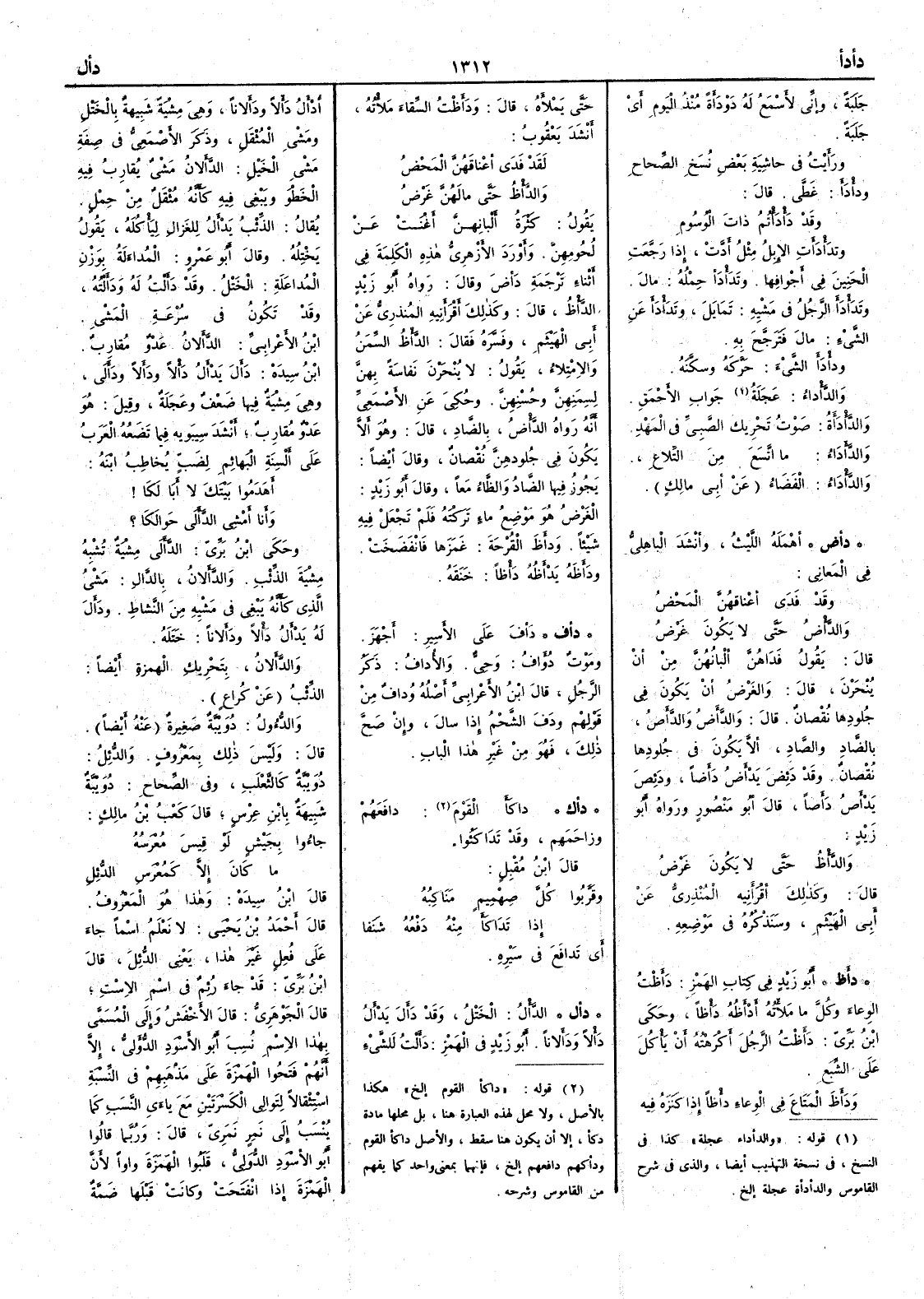( 1 قوله « والدأداء عجلة » كذا في النسخ وفي نسخة التهذيب أيضاً والذي في شرح القاموس والدأدأة عجلة إلخ ) جَواب الأَحْمق والدَّأْدأَةُ صوت تَحريكِ الصبي في المَهْد والدَّأْداءُ ما اتَّسَع من التِّلاع والدَّأْداء الفَضاء عن أَبي مالك