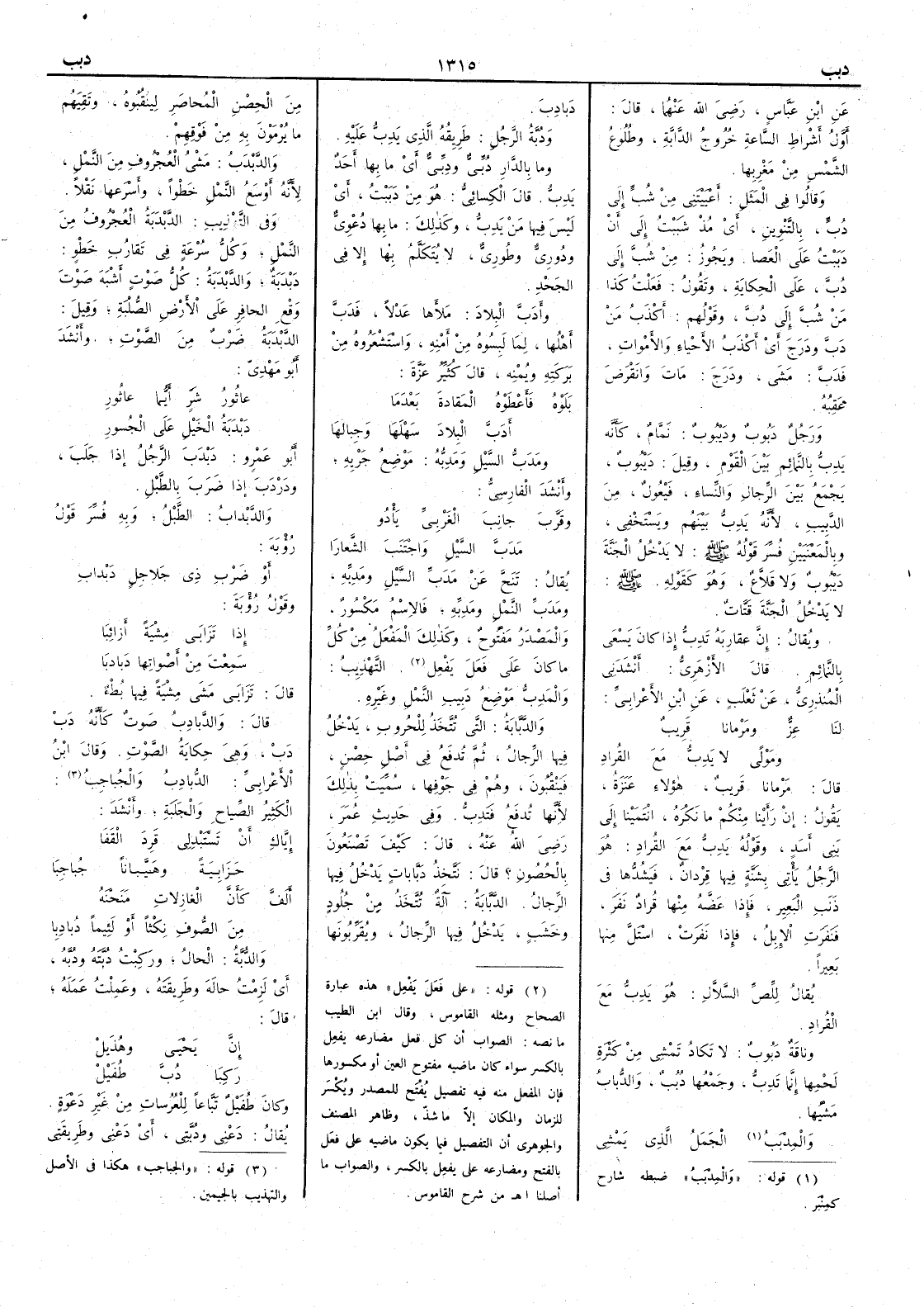 ( 1 قوله « والمدبب » ضبطه شارح القاموس كمنبر ) الجَمَل الذي يمشي دَبادِبَ ودُبَّة الرَّجُل طريقُه الذي يَدِبُّ عليه وما بالدَّارِ دُبِّيٌّ ودِبِّيٌّ أَي ما بها أَحدٌ يَدِبُّ قال الكسائي هو من دَبَبْت أَي ليس فيها مَن يَدِبُّ وكذلك ما بها دُعْوِيٌّ ودُورِيٌّ وطُورِيٌّ لا يُتَكَلَّم بها إِلا في الجَحْد وأَدَبَّ البِلادَ مَلأَها عَدْلاً فَدَبَّ أَهلُها لِمَا لَبِسُوه من أَمْنِه واسْتَشْعَرُوه من بَرَكَتِه ويُمْنِه قال كُثَيِّر عزة