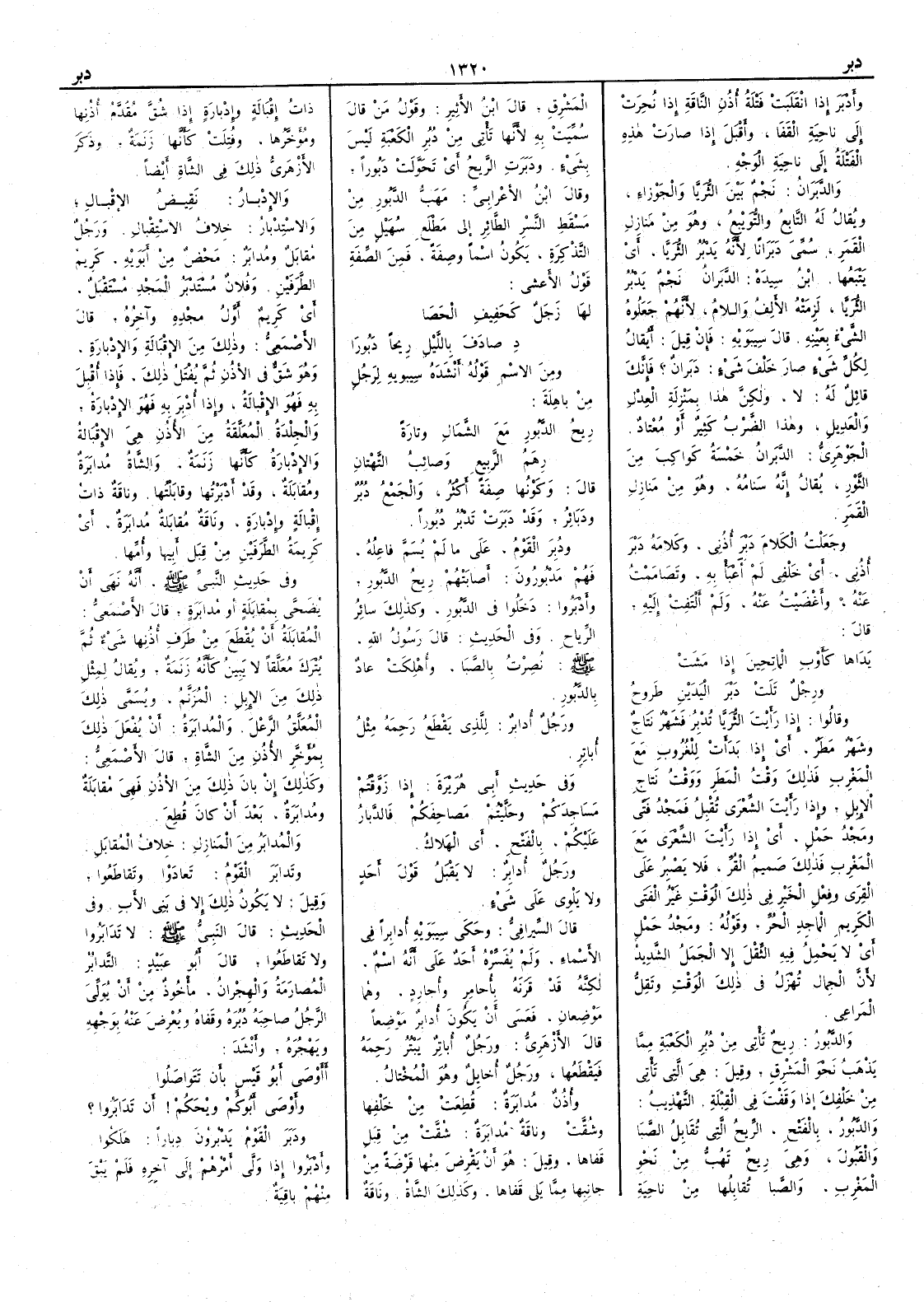 وأَدْبَرَ إِذا انْقَلَبَتْ فَتْلَةُ أُذن الناقة إِذا نُحِرَتْ إِلى ناحية القَفَا وأَقْبَلَ إِذا صارت هذه الفَتْلَةُ إِلى ناحية الوجه والدَّبَرَانُ نجم بين الثُّرَيَّا والجَوْزاءِ ويقال له التَّابِعُ والتُّوَيْبِعُ وهو من منازل القمر سُمِّيَ دَبَرَاناً لأَنه يَدْبُرُ الثريا أَي يَتْبَعُها ابن سيده الدَّبَرانُ نجم يَدْبُرُ الثريا لزمته الأَلف واللام لأَنهم جعلوه الشيء بعينه قال سيبويه فإِن قيل أَيقال لكل شيء صار خلف شيء دَبَرانٌ ؟ فإِنك قائل له لا ولكن هذا بمنزلة العدْل والعَدِيلِ وهذا الضرب كثير أَو معتاد الجوهري الدَّبَرانُ خمسة كواكب من الثَّوْرِ يقال إِنه سَنَامُه وهو من منازل القمر وجعلتُ الكلامَ دَبْرَ أُذني وكلامَه دَبْرَ أُذني أَي خَلْفِي لم أَعْبَأْ به وتَصَامَمْتُ عنه وأَغضيت عنه ولم أَلتفت إِليه قال يَدَاها كأَوْبِ الماتِحِينَ إِذا مَشَتْ ورِجْلٌ تَلَتْ دَبْرَ اليَدَيْنِ طَرُوحُ وقالوا إِذا رأَيت الثريا تُدْبِرُ فَشَهْر نَتَاج وشَهْر مَطَر أَي إِذا بدأَت للغروب مع المغرب فذلك وقت المطر ووقت نَتاج الإِبل وإِذا رأَيت الشِّعْرَى تُقْبِلُ فمَجْدُ فَتًى ومَجْدُ حَمْلٍ أَي إِذا رأَيت الشعرى مع المغرب فذلك صَمِيمُ القُرِّ فلا يصبر على القِرَى وفعل الخير في ذلك الوقت غير الفتى الكريم الماجد الحرّ وقوله ومجد حمل أَي لا يحمل فيه الثِّقْلَ إِلا الجَمَلُ الشديد لأَن الجمال تُهْزَلُ في ذلك الوقت وتقل المراعي والدَّبُورُ ريح تأْتي من دُبُرِ الكعبة مما يذهب نحو المشرق وقيل هي التي تأْتي من خلفك إِذا وقفت في القبلة التهذيب والدَّبُور بالفتح الريح التي تقابل الصَّبَا والقَبُولَ وهي ريح تَهُبُّ من نحو المغرب والصبا تقابلها من ناحية المشرق قال ابن الأَثير وقول من قال سميت به لأَنها تأْتي من دُبُرِ الكعبة ليس بشيء ودَبَرَتِ الريحُ أَي تحوّلت دَبُوراً وقال ابن الأَعرابي مَهَبُّ الدَّبُور من مَسْقَطِ النَّسْر الطائر إِلى مَطْلَعِ سُهَيْلٍ من التذكرة يكون اسماً وصفة فمن الصفة قول الأَعشى لها زَجَلٌ كَحَفِيفِ الحَصا د صادَفَ باللَّيْلِ رِيحاً دَبُورا ومن الاسم قوله أَنشده سيبويه لرجل من باهلة رِيحُ الدَّبُورِ مع الشَّمَالِ وتارَةً رِهَمُ الرَّبِيعِ وصائبُ التَّهْتانِ قال وكونها صفة أَكثر والجمع دُبُرٌ ودَبائِرُ وقد دَبَرَتْ تَدْبُرُ دُبُوراً ودُبِرَ القومُ على ما لم يسمَّ فاعله فهم مَدْبُورُون أَصابتهم ريح الدَّبُور وأَدْبَرُوا دخلوا في الدَّبور وكذلك سائر الرياح وفي الحديث قال رسول الله صلى الله عليه وسلم نُصِرْتُ بالصَّبَا وأُهْلِكَتْ عادٌ بالدَّبُورِ ورجل أُدابِرٌ للذي يقطع رحمه مثل أُباتِرٍ وفي حديث أَبي هريرة إِذا زَوَّقْتُمْ مَسَاجِدَكُمْ وحَلَّيْتُمْ مَصاحِفَكُمْ فالدَّبارُ عليكم بالفتح أَي الهلاك ورجل أُدابِرٌ لا يقبل قول أَحد ولا يَلْوِي على شيء قال السيرافي وحكى سيبويه أُدابِراً في الأَسماء ولم يفسره أَحد على أَنه اسم لكنه قد قرنه بأُحامِرٍ وأُجارِدٍ وهما موضعان فعسى أَن يكون أُدابِرٌ موضعاً قال الأَزهري ورجل أُباتِرٌ يَبْتُرُ رَحِمَهُ فيقطعها ورجل أُخايِلٌ وهو المُخْتالُ وأُذن مُدابَرَةٌ قطعت من خلفها وشقت وناقة مُدابَرَة شُقت من قِبَلِ قَفاها وقيل هو أَن يَقْرِضَ منها قَرْضَةً من جانبها مما يلي قفاها وكذلك الشاة وناقة ذات إِقْبالَةٍ وإِدْبارة إِذا شُقَّ مُقَدَّمُ أُذنها ومُؤَخَّرُها وفُتِلَتْ كأَنها زَنَمَةٌ وذكر الأَزهري ذلك في الشاة أَيضاً والإِدْبارُ نقيضُ الإِقْبال والاسْتِدْبارُ خلافُ الاستقبال ورجل مُقابَلٌ ومُدابَرٌ مَحْضٌ من أَبويه كريم الطرفين وفلان مُسْتَدْبَرُ المَجْدِ مُسْتَقْبَلٌ أَي كريم أَوَّل مَجْدِهِ وآخِرِه قال الأَصمعي وذلك من الإِقْبالة والإِدْبارَة وهو شق في الأُذن ثم يفتل ذلك فإِذا أُقْبِلَ به فهو الإِقْبالَةُ وإِذا أُدْبِرَ به فهو الإِدْبارة والجِلْدَةُ المُعَلَّقَةُ من ا