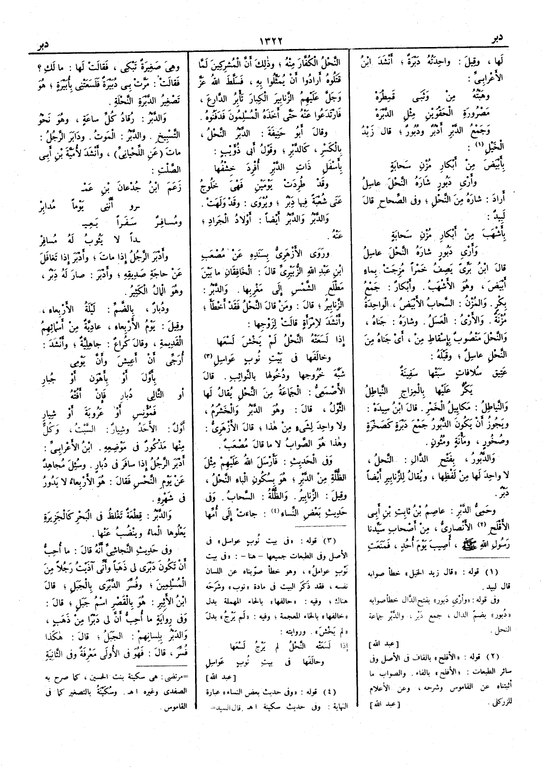 ( * قوله « وفي حديث بعض النساء » عبارة النهاية وفي حديث سكينة ا ه قال السيد مرتضى هي سكينة بنت الحسين كما صرح به الصفدي وغيره ا ه وسكينة بالتصغير كما في القاموس ) جاءت إِلى أُمها وهي صغيرة تبكي فقالت لها ما لَكِ ؟ فقالت مرت بي دُبَيْرَةٌ فَلَسَعَتْنِي بأُبَيْرَةٍ هو تصغير الدَّبْرَةِ النحلة والدَّبْرُ رُقادُ كل ساعة وهو نحو التَّسْبِيخ والدَّبْرُ الموت ودَابَرَ الرجلُ مات عن اللحياني وأَنشد لأُمية بن أَبي الصلت زَعَمَ ابْنُ جُدْعانَ بنِ عَمْ روٍ أَنَّنِي يَوْماً مُدابِرْ ومُسافِرٌ سَفَراً بَعِي داً لا يَؤُوبُ له مُسافِرْ وأَدْبَرَ الرجلُ إِذا مات وأَدْبَرَ إِذا تغافل عن حاجة صديقه وأَدْبَرَ صار له دِبْرٌ وهو المال الكثير ودُبارٌ بالضم ليلة الأَربعاء وقيل يوم الأَربعاء عادِيَّةٌ من أَسمائهم القديمة وقال كراع جاهلية وأَنشد أُرَجِّي أَنْ أَعِيشَ وأَنَّ يَوْمِي بِأَوَّلَ أَو بِأَهْوَنَ أَو جُبارِ أَو التَّالِي دُبارِ فإِن أَفُتْهُ فَمُؤْنِس أَو عَرُوبَةَ أَوْ شِيارِ أَول الأَحَدُ وشِيارٌ السبتُ وكل منها مذكور في موضعه ابن الأَعرابي أَدْبَرَ الرجلُ إِذا سافر في دُبارٍ وسئل مجاهد عن يوم النَّحْسِ فقال هو الأَربعاء لا يدور في شهره والدَّبْرُ قطعة تغلظ في البحر كالجزيرة يعلوها الماء ويَنْضُبُ عنها وفي حديث النجاشي أَنه قال ما أُحِبُّ أَن تكون دَبْرَى لي ذَهبَاً وأَنِّي آذيت رجلاً من المسلمين وفُسِّرَ الدَّبْرَى بالجبل قال ابن الأَثير هو بالقصر اسم جبل قال وفي رواية ما أُحب أَن لي دَبْراً من ذَهَبٍ والدَّبْرُ بلسانهم الجبل قال هكذا فُسِّر قال فهو في الأُولى معرفة وفي الثانية