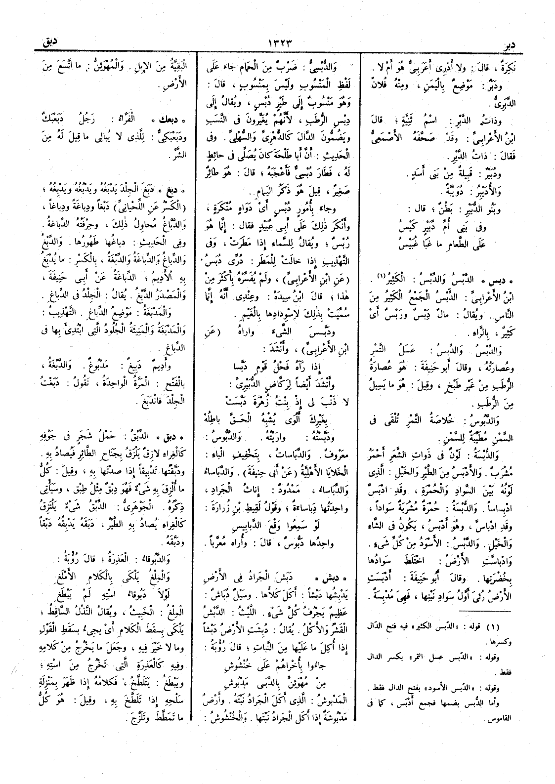 ( دبس ) الدَّبْسُ والدِّبْسُ الكثير ابن الأَعرابي الدَّبِْسُ الجمع الكثير من الناس ويقال مال دَِبْسٌ ورَبْسٌ أَي كثير بالراء والدِّبْسُ والدِّبِسُ عَسَلُ التمر وعُصارته وقال أَبو حنيفة هو عُصارة الرُّطَب من غير طبخ وقيل هو ما يسيل من الرطب والدَّبُوسُ خُلاصة التمر تلقى في السمن مطيبة للسمن والدُّبْسَةُ لونٌ في ذوات الشعر أَحمرُ مُشْرَبٌ والأَدْبَسُ من الطير والخيل الذي لونه بين السواد والحمرة وقد ادْبَسَّ ادْبِساساً والدُّبْسَةُ حُمْرَةٌ مُشْرَبَةٌ سواداً وقد ادْباسَّ وهو أَدْبَسُ يكون في الشاء والخيل والدَّبْسُ الأَسْوَدُ من كل شيء وادْباسَّتِ الأَرضُ اختلط سوادُها بخُضْرَتها وقال أَبو حنيفة أَدْبَسَت الأَرض رؤي أَول سواد نبتها فهي مُدْبِسَةٌ والدُّبْسِيُّ ضرب من الحمام جاء على لفظ المنسوب وليس بمنسوب قال وهو منسوب إِلى طير دُبْسٍ ويقال إِلى دِبْسِ الرُّطَبِ لأَنهم يغيرون في النسب ويضمون الدال كالدُّهْريِّ والسُهْليِّ وفي الحديث أَن أَبا طلحة كان يصلي في حائط له فطار دُبْسِيٌّ فأَعجبه قال هو طائر صغير قيل هو ذكر اليمام وجاءَ بأُمور دُبْسٍ أَي دَواهٍ مُنْكَرَة وأَنكر ذلك على أَبي عبيد فقال إِنما هو رُبْس ويقال للسماء إِذا مَطَرَتْ وفي التهذيب إِذا خالت للمطر دُرِّي دُبَسُ عن ابن الأَعرابي ولم يفسره بأَكثر من هذا قال ابن سيده وعندي أَنه إِنما سميت بذلك لاسودادها بالغيم ودَبَّسَ الشيءَ واراه عن ابن الأَعرابي وأَنشد إِذا رآه فَحْلُ قومٍ دَبَّسا وأَنشد أَيضاً لِرَكَّاضٍ الدُّبَيْريّ لا ذَنْبَ لي إِذ بِنْتُ زُهْرَةَ دَبَّسَتْ بغيرِك أَلْوَى يُشْبِهُ الحقَّ باطِلُهْ ودَبَّسْتُه وارَيْتُه والدَّبُّوس معروف والدِّبَاساتُ بتخفيف الباء الخلايا الأَهليةُ عن أَبي حنيفة والدَّبَاساءُ ممدود إِناث الجراد واحدتها دَِباساءَةٌ وقول لَقِيط بن زُرارَةَ لو سَمِعُوا وَقْعَ الدَّبابيسِ واحدها دَبُّوسٌ قال وأُراه معرَّباً