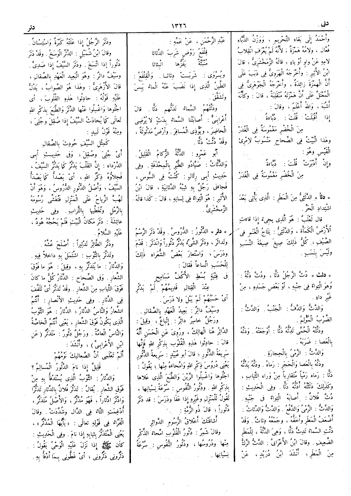 ( دثر ) الدُّثُورُ الدُّرُوسُ وقد دَثَرَ الرَّسْمُ وتَداثَرَ ودَثَرَ الشيءُ يَدْثُرُ دُثُوراً وانْدَثَر قَدُمَ ودَرَسَ واستعار بعض الشعراء ذلك للحَسَبِ اتساعاً فقال في فِتْيَةٍ بُسُطِ الأَكُفِّ مَسَامِحٍ عند القِتالِ قَدِيمُهُمْ لم يَدْثُرِ أَي حَسَبُهُمْ لم يَبْلَ ولا دَرَسَ وسيفٌ داثِرٌ بعيد العهد بالصِّقالِ ورجل خاسِرٌ داثِرٌ إِتباع وقيل الدَّاثِرُ هنا الهالك وروي عن الحسن أَنه قال حادِثُوا هذه القلوب بذكر الله فإِنها سريعة الدُّثُورِ قال أَبو عبيد سريعة الدُّثُور يعني دُرُوس ذكر الله وامِّحاءَهُ منها يقول اجْلُوها واغسلوا الرَّيْنَ والطَّبَعَ الذي علاها بذكر الله ودُثُورُ النفوس سُرْعَةُ نِسْيانِها تقول للمنزل وغيره إِذا عَفَا ودَرَسَ قد دَثَرَ دُثُوراً قال ذو الرمة أَشاقَتْكَ أَخْلاقُ الرُّسُومِ الدَّواثِرِ وقال شمر دُثُورُ القلوب امِّحاءُ الذكر منها ودُرُوسُها ودُثُورُ النفوس سُرْعَةُ نسيانها ودَثَرَ الرجلُ إِذا علته كَبْرَةٌ واسْتِسْنانٌ وقال ابن شميل الدَّثَرُ الوَسَخُ وقد دَثَرَ دُثُوراً إِذا اتسخ ودَثَرَ السيفُ إِذا صَدِئَ وسيف داثِرٌ وهو البعيد العهد بالصِّقالِ قال الأَزهري وهذا هو الثواب يدل عليه قوله حادِثُوا هذه القلوبَ أَي اجْلُوها واغسلوا عنها الدَّثَرَ والطَّبَعَ بذكر الله تعالى كما يُحادَثُ السيفُ إِذا صُقِلَ وجُلِيَ ومنه قول لبيد كَمِثْلِ السَّيْفِ حُودِثَ بالصِّقالِ أَي جُلِيَ وصُقِلَ وفي حديث أَبي الدرداء أَن القلب يَدْثُرُ كما يَدْثُرُ السيف فجلاؤه ذكر الله أَي يَصْدَأُ كما يصدأُ السيف وأَصل الدُّثُورِ الدُّرُوسُ وهو أَن تَهُبَّ الرياحُ على المنزل فَتُغَشِّي رُسُومَهُ الرملَ وتغطيها بالتراب وفي حديث عائشة دَثَرَ مكانُ البيت فلم يَحُجَّهُ هود عليه السلام ودَثَرَ الطائرُ تَدْثِيراً أَصلح عُشَّهُ وتَدَثَّرَ بالثوب اشتمل به داخلاَ فيه والدِّثارُ ما يُتَدَثَّرُ به وقيل هو ما فوق الشِّعارِ وفي الصحاح الدِّثار كل ما كان فوق الثياب من الشعار وقد تَدَثِّرَ أَي تَلَفَّفَ في الدِّثار وفي حديث الأَنصار أَنتم الشِّعارُ والناس الدِّثارُ الدِّثارُ هو الثوب الذي يكون فوق الشِّعارِ يعني أَنتم الخاصَّةُ والناسُ العامَّةُ ورجل دَثُورٌ مُتَدَثِّرٌ عن ابن الأَعرابي وأَنشد أَلم تَعْلَمِي أَنَّ الصَّعالِيكَ نَوْمُهُمْ قليلٌ إِذا نامَ الدَّثُورُ المُسالِمُ ؟ والدِّثارُ الثوب الذي يُسْتَدْفَأُ به من فوق الشِّعارِ يقال تَدَثَّرَ فلانٌ بالدِّثارِ تَدَثُّراً وادَّثَرَ ادِّثاراً فهو مُدَّثِّرٌ والأَصل مُتَدَثِّر أُدغمت التاء في الدال وشدّدت وقال الفرّاء في قوله تعالى يا أَيها المُدَّثِّرُ يعني المُتَدَثِّر بثيابه إِذا نام وفي الحديث كان إِذا نزل عليه الوحي يقول دثِّرُوني دَثِّرُوني أَي غَطُّوني بما أَدْفَأُ به